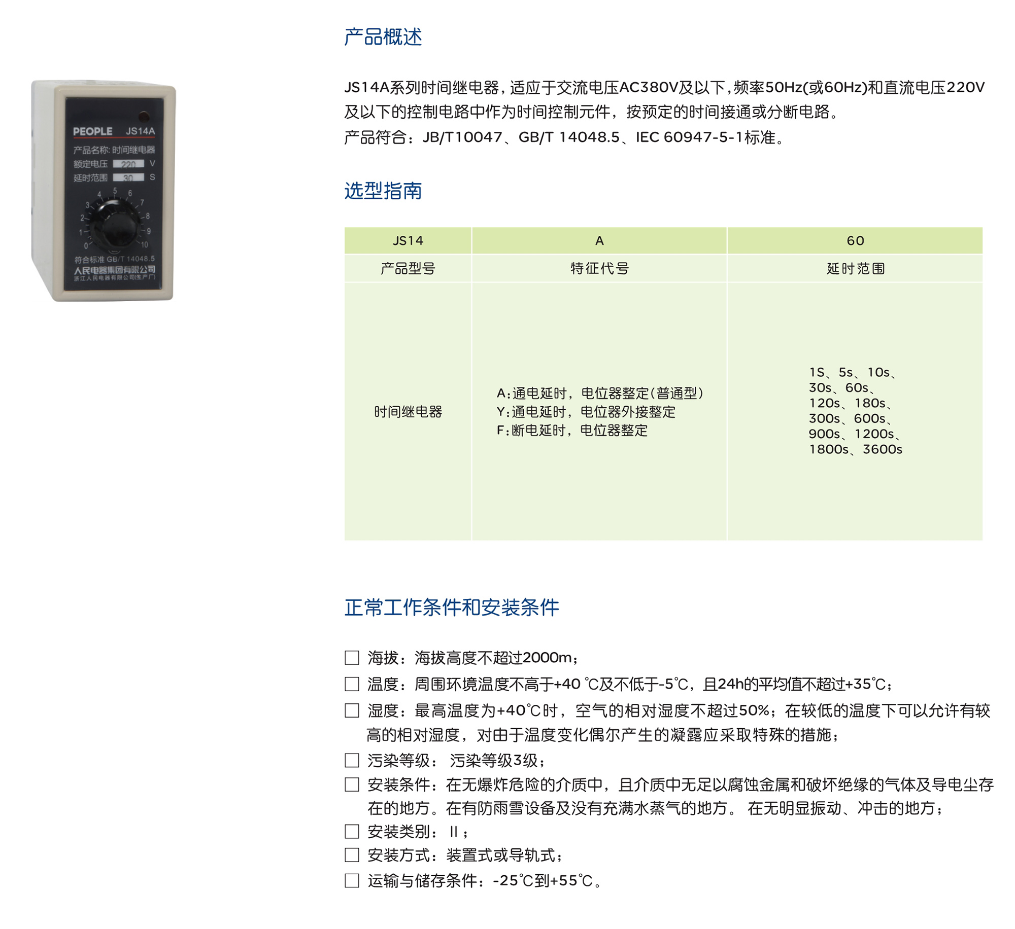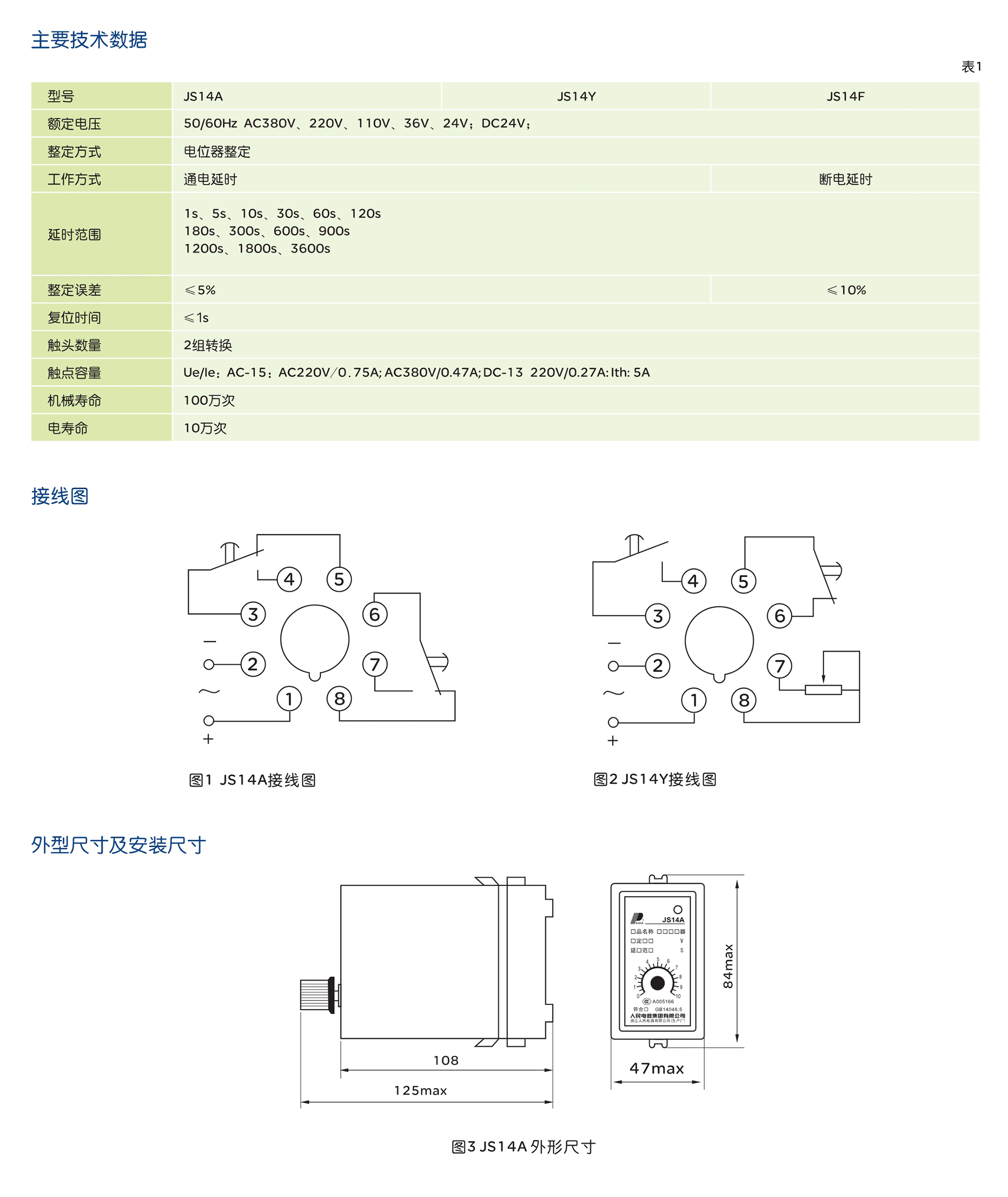 JS14A系列时间继电器,适应于交流电压AC380V及以下,频率50Hz(或60Hz)和直流电压220V 及以下的控制电路中作为时间控制元件,按预定的时间接通或分断电路。 产品符合:JB/T10047、GB/T 14048.5、IEC 60947-5-1标准。
