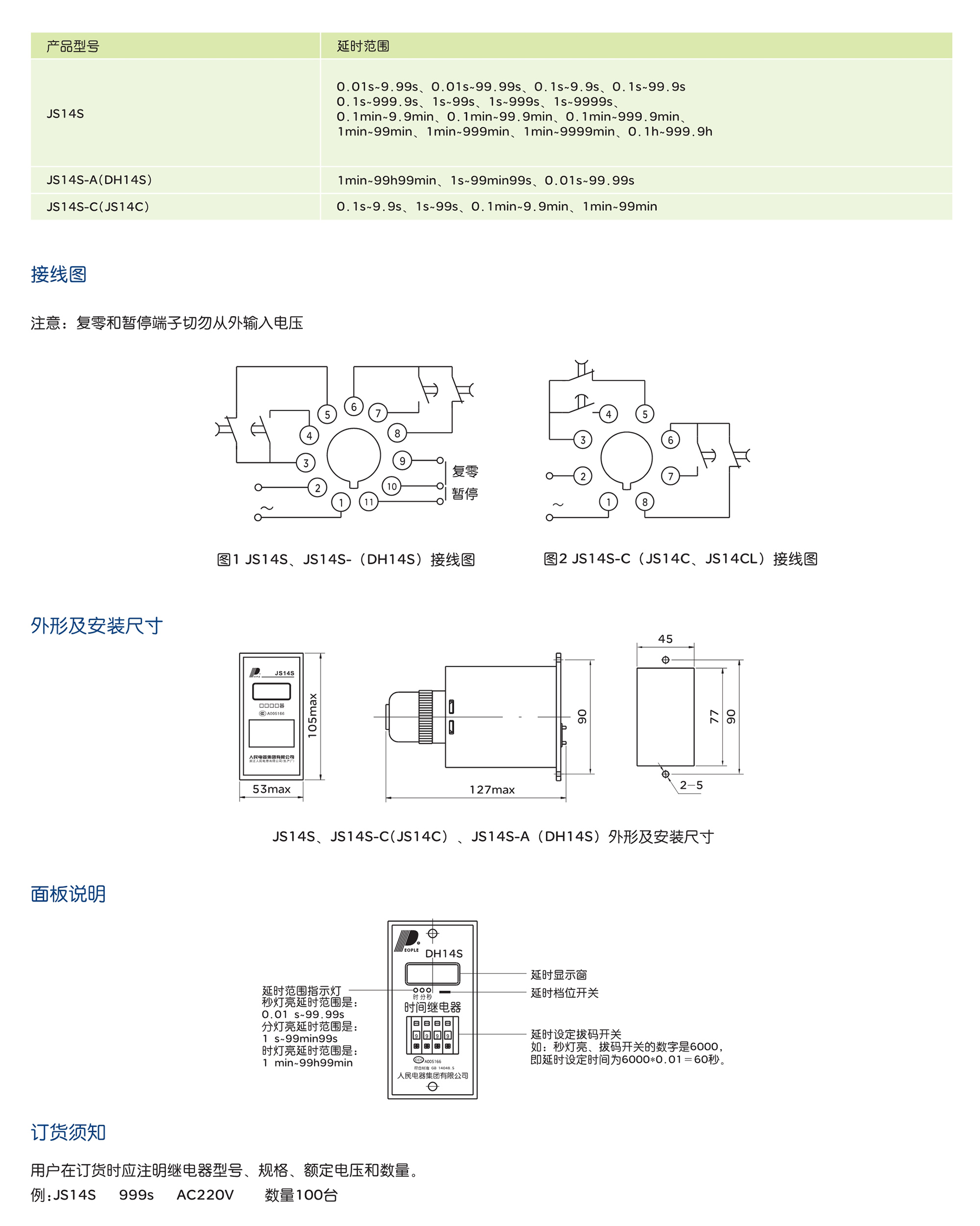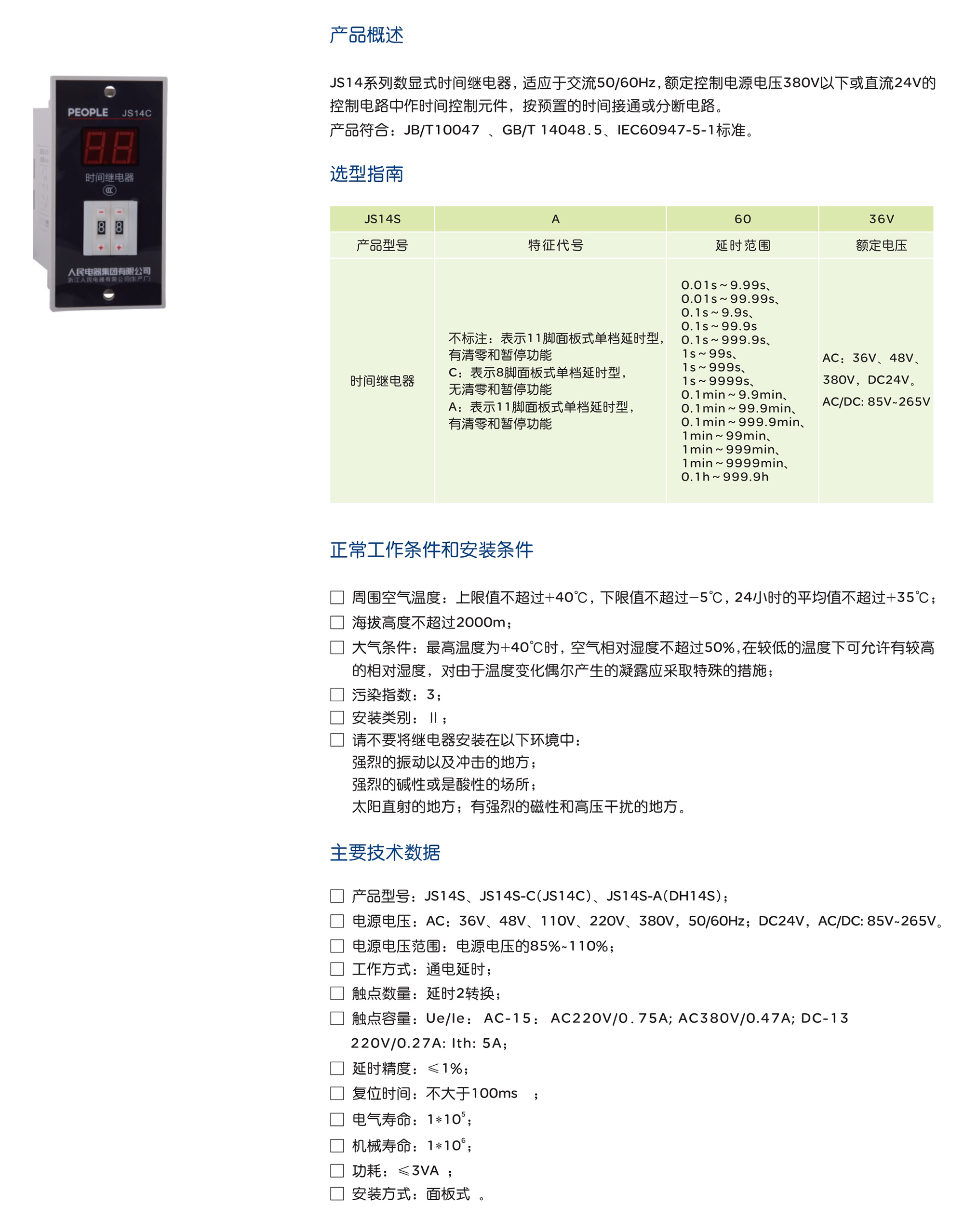 JS14系列数显式时间继电器,适应于交流50/60Hz,额定控制电源电压380V以下或直流24V的 控制电路中作时间控制元件,按预置的时间接通或分断电路。 产品符合:JB/T10047 、GB/T 14048.5、IEC60947-5-1标准。