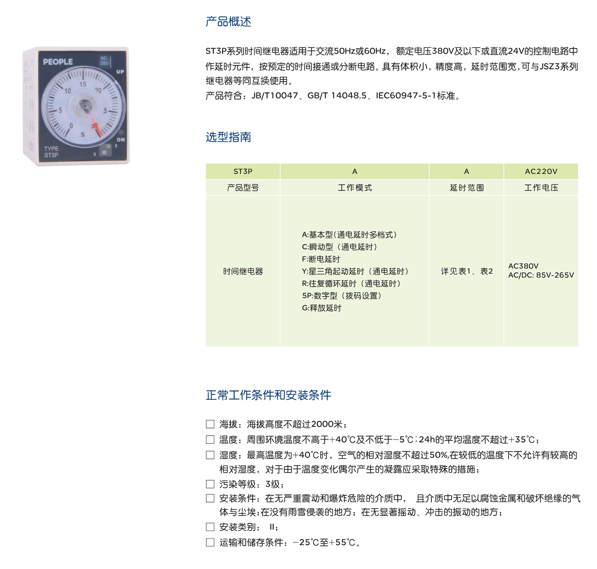 ST3P系列时间继电器适用于交流50Hz或60Hz,额定电压380V及以下或直流24V的控制电路中作廷时元件,按预定的时间接通或分断电路。具有体积小,精度高,延时范围宽,可与JSZ3系列继电器等同互换使用。 产品符合:JB/T10047、GB/T14048.5、IEC60947-5-1标准。