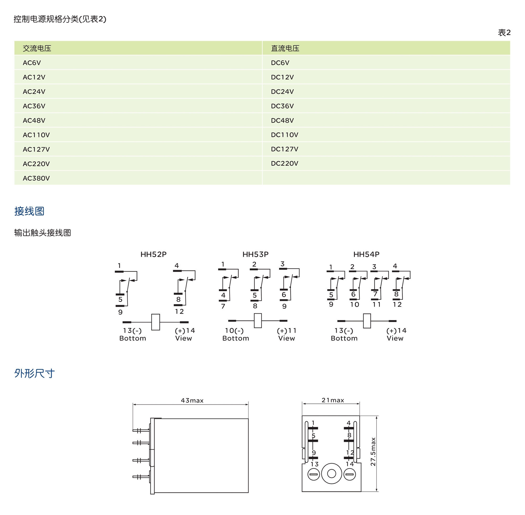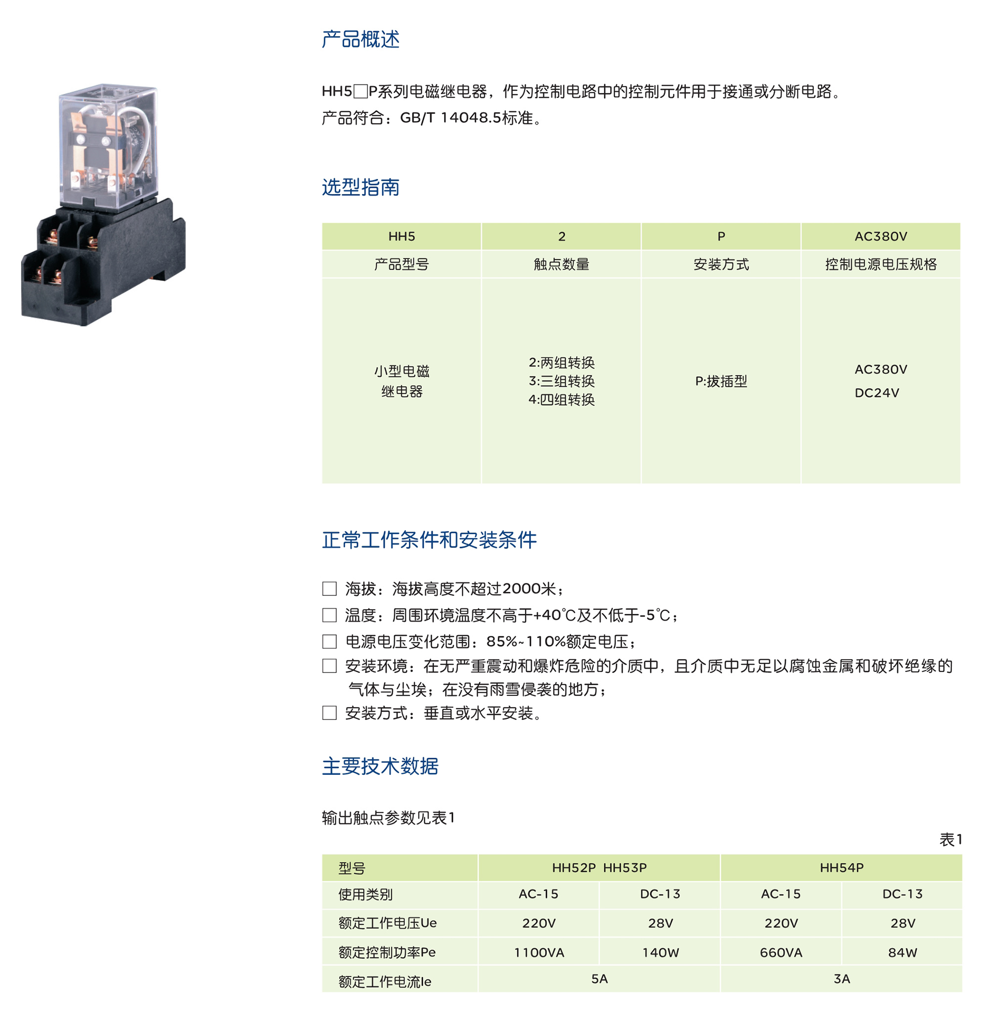 HH5□P系列电磁继电器,作为控制电路中的控制元件用于接通或分断电路。产品符合:GB/T 14048.5标准。