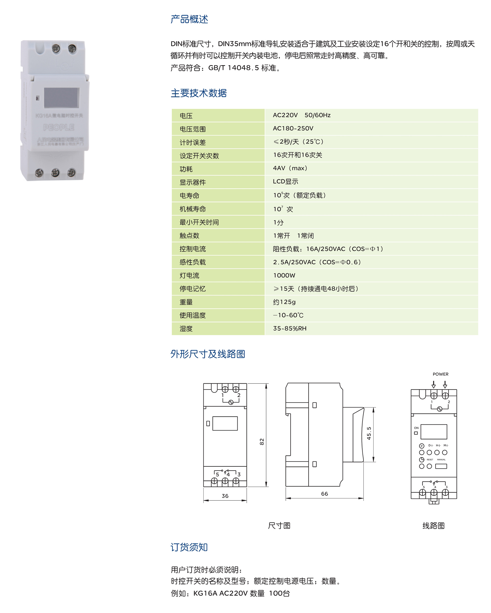DIN标准尺寸,DIN35mm标准导轧安装适合于建筑及工业安装设定16个开和关的控制,按周或天循环并有时可以控制开关内装电池,停电后腙常走时高精度、高可靠。 产品符合:GB/T14048.5标准。