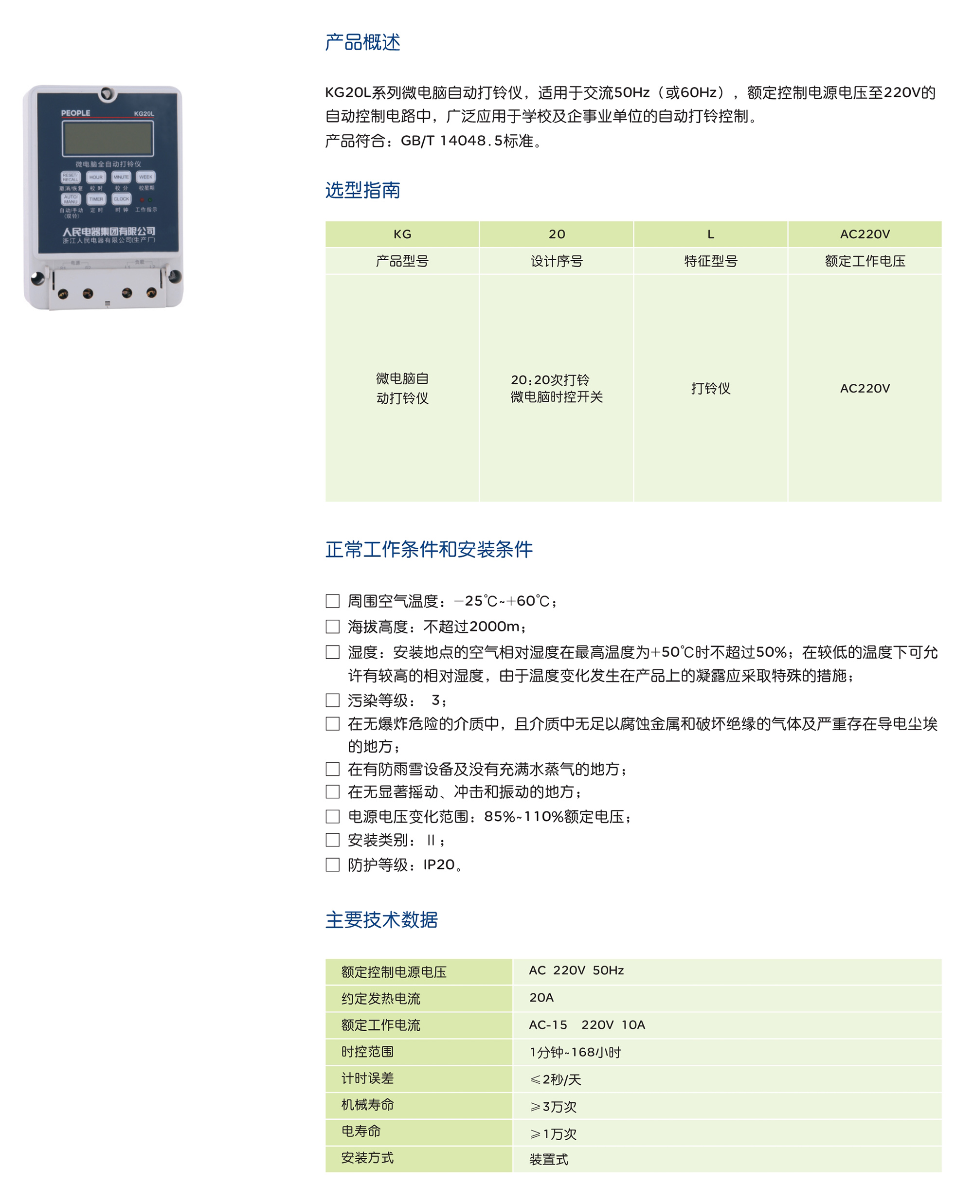 KG20L系列微电脑自动打铃仪,适用于交流50Hz(或60Hz),额定控制电源电压至220V的 自动控制电路中,广泛应用于学校及企事业单位的自动打铃控制。 产品符合:GB/T 14048.5标准。