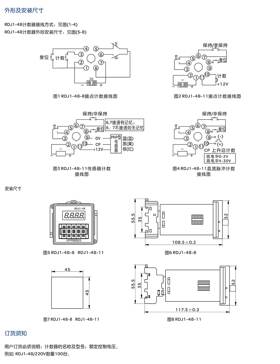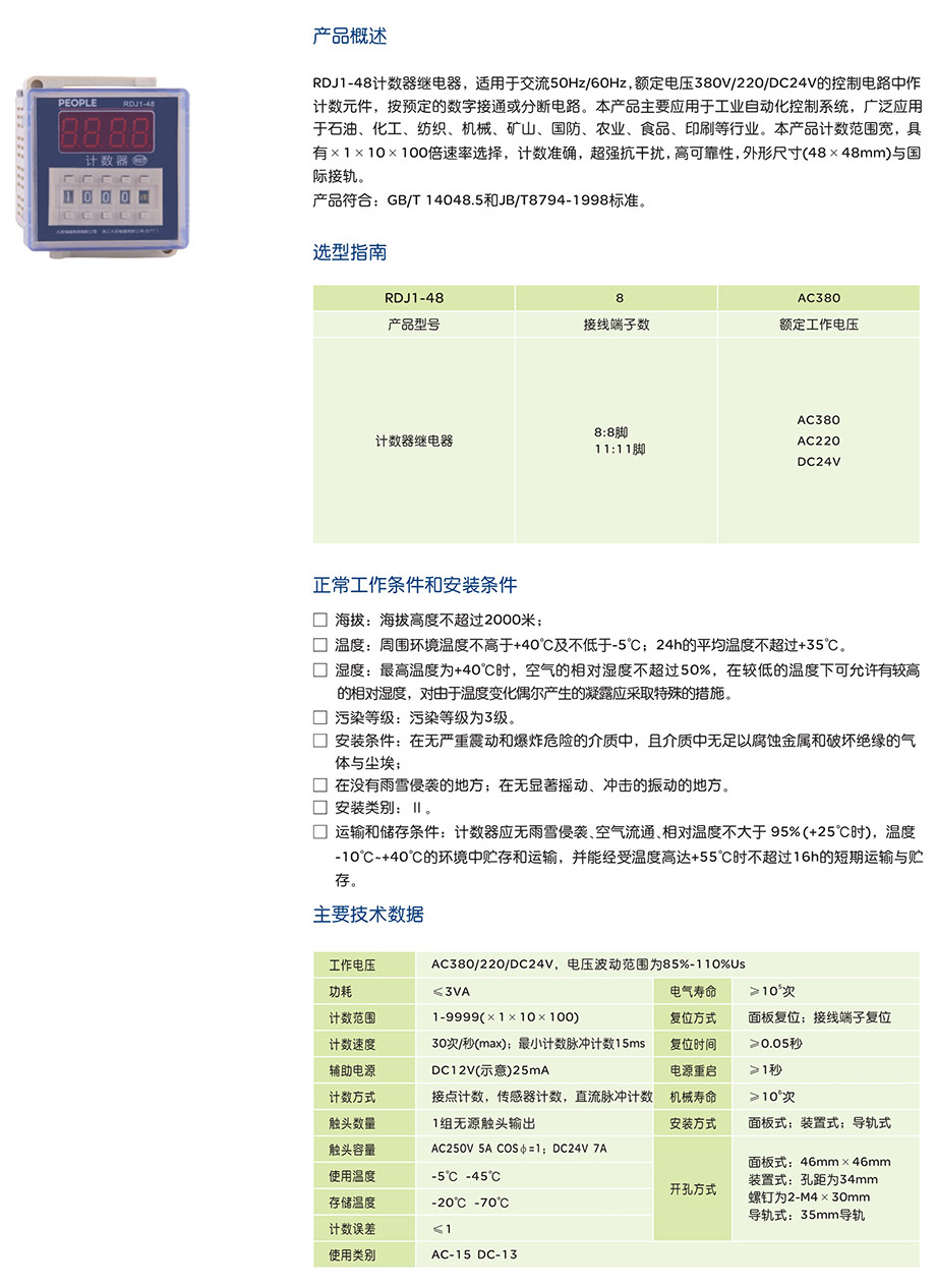 RDJ1-48计数器继电器,适用于交流50Hz/60Hz,额定电压380V/220/DC24V的控制电路中作