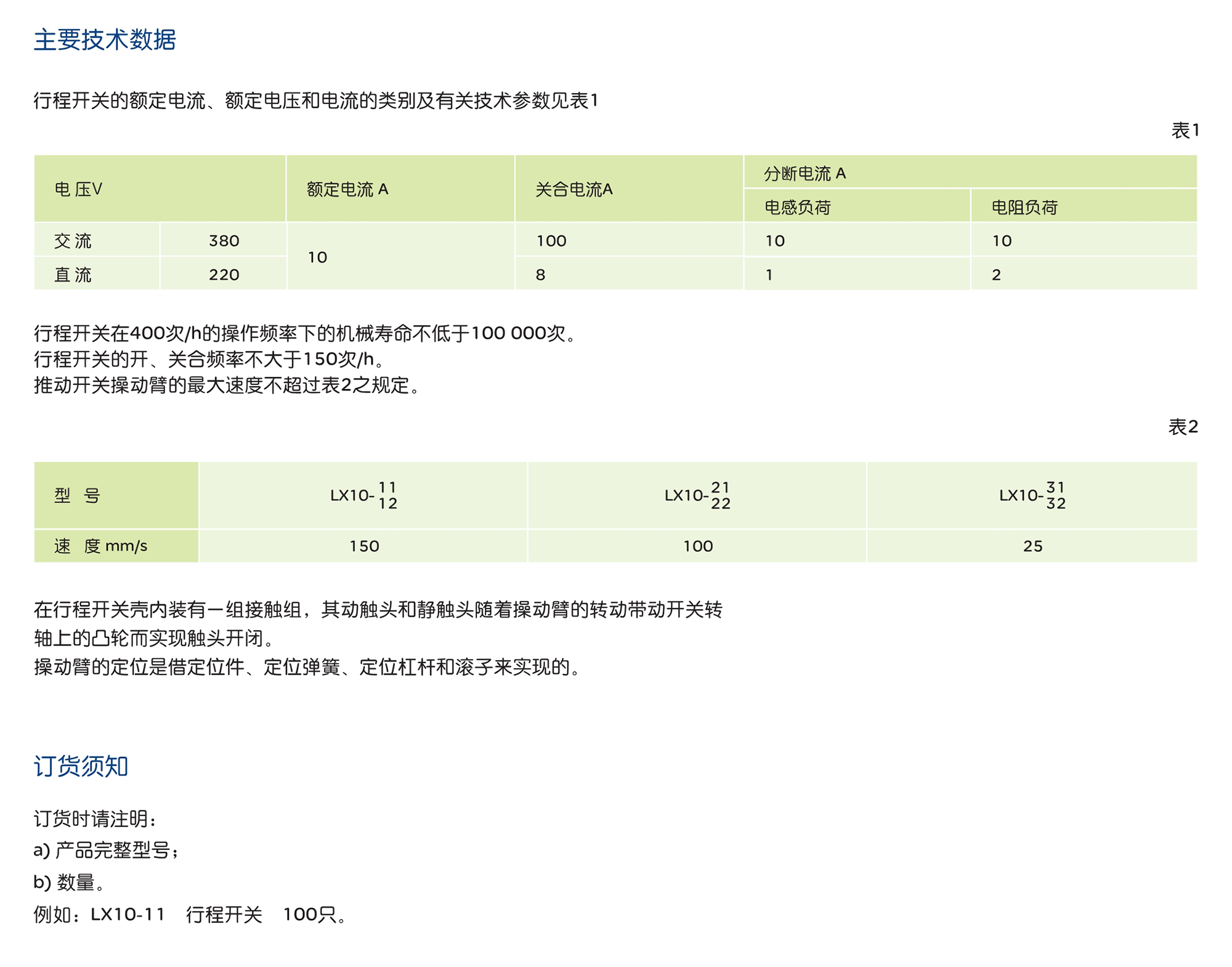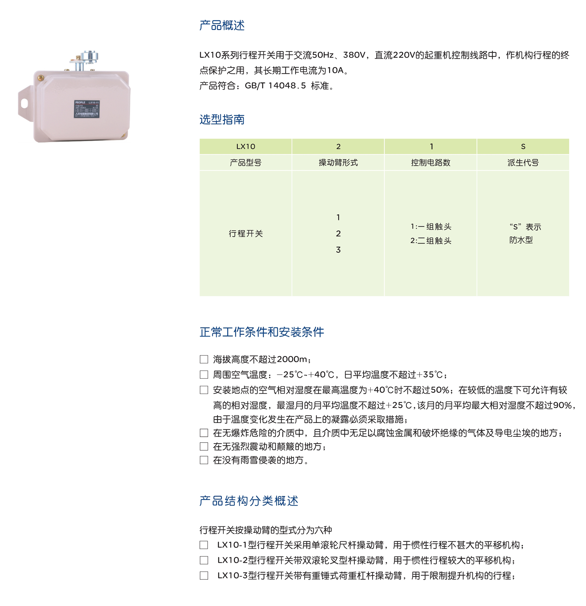 LX10系列行程开关用于交流50Hz、380V 直流220V的起重机控制线路中,作机构行程的终 点?;ぶ茫涑て诠ぷ鞯缌魑?0A。 产品符合:GB/T 14048.5 标准。