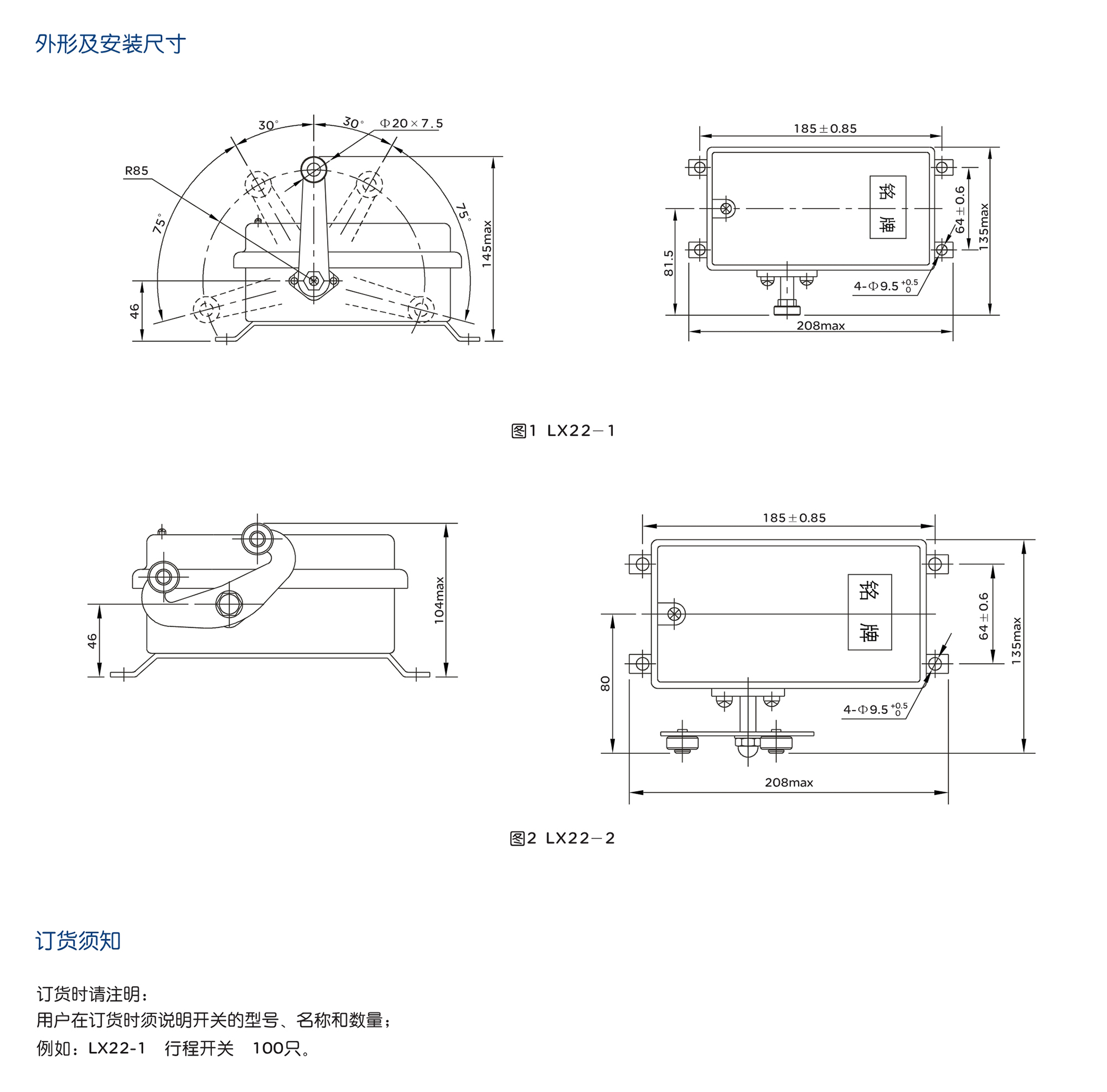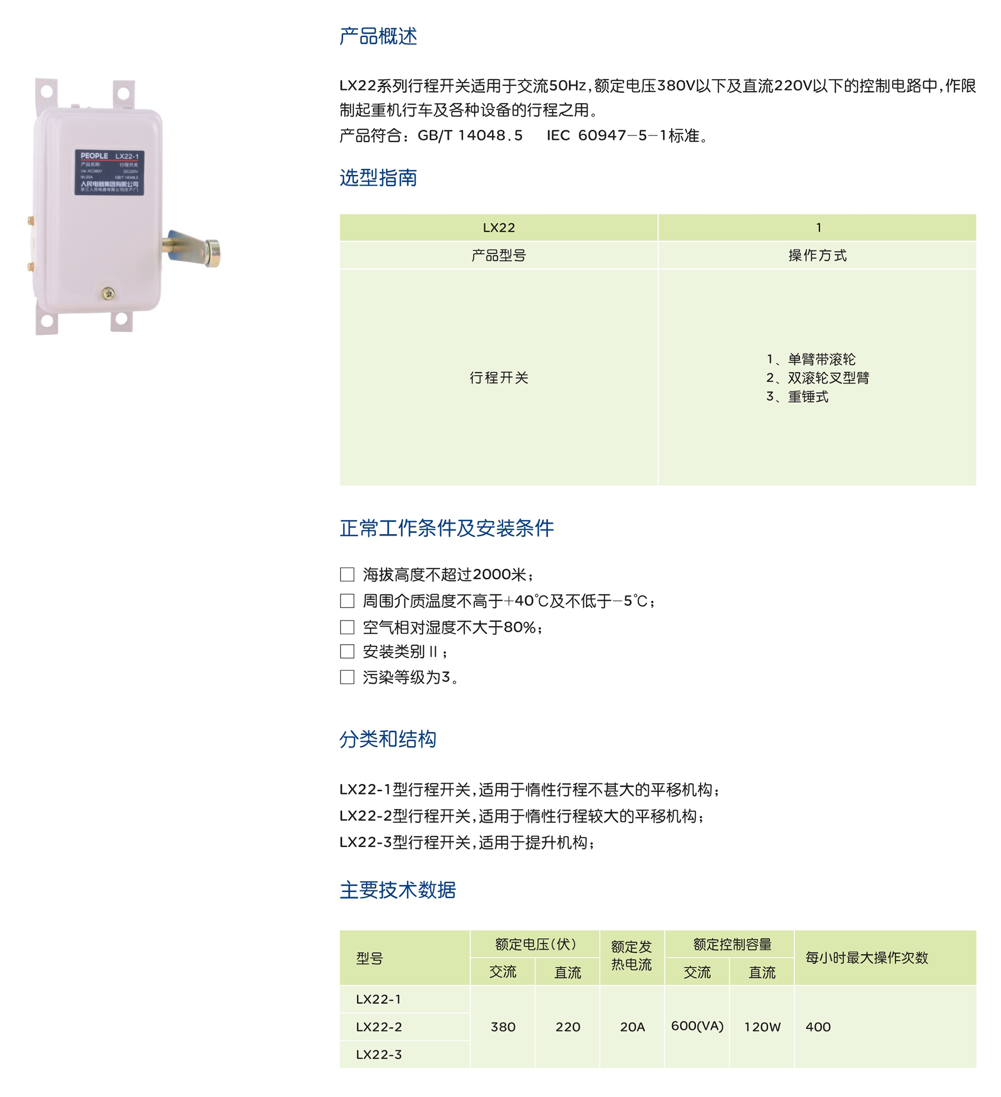 LX22系列行程开关适用于交流50HZ,额定电压380V以下及直流220V以下的控制电路中,作限 制起重机行车及各种设备的行程之用。 产品符合:GB/T 14048.5 IEC 60947-5-1标准。
