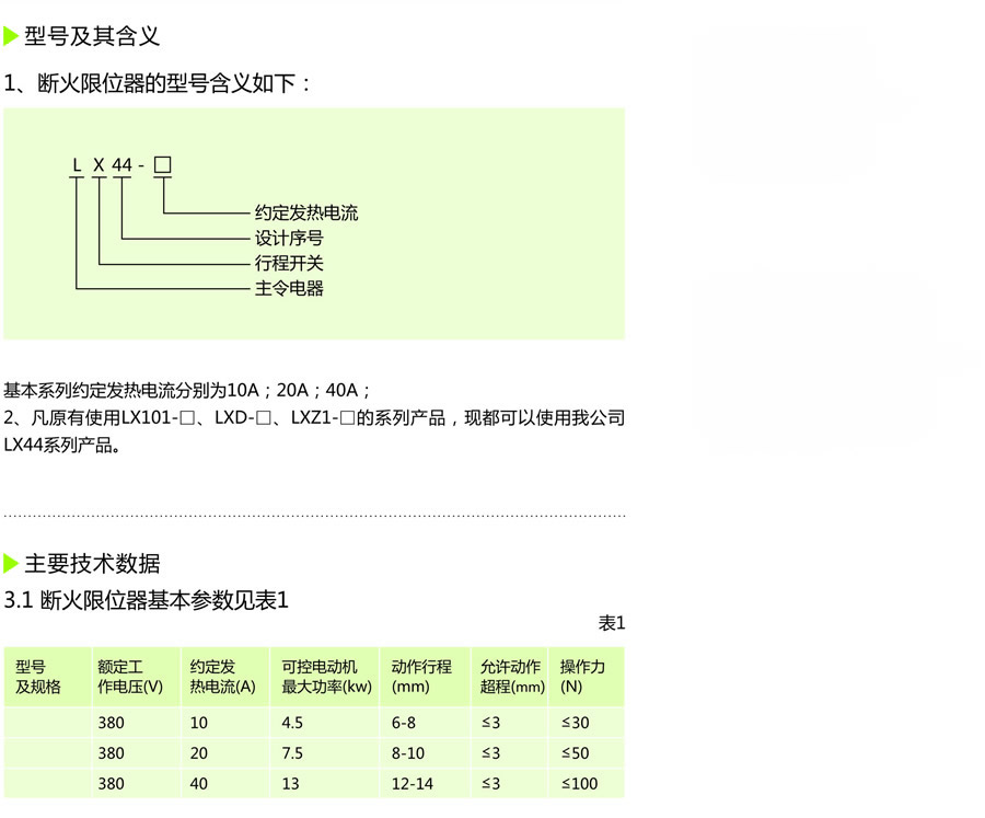 LX44系列断火限位器(以下简称限位器)主要用于交流50Hz电压至380V的电力线路中,供0.5吨~10吨CD1型、MD1型一般钢丝绳式电动葫芦作升、降限位?;ぶ?,可直接分断、接通电动机的主回路。限位器按GB14048.5设计、制造和检验。