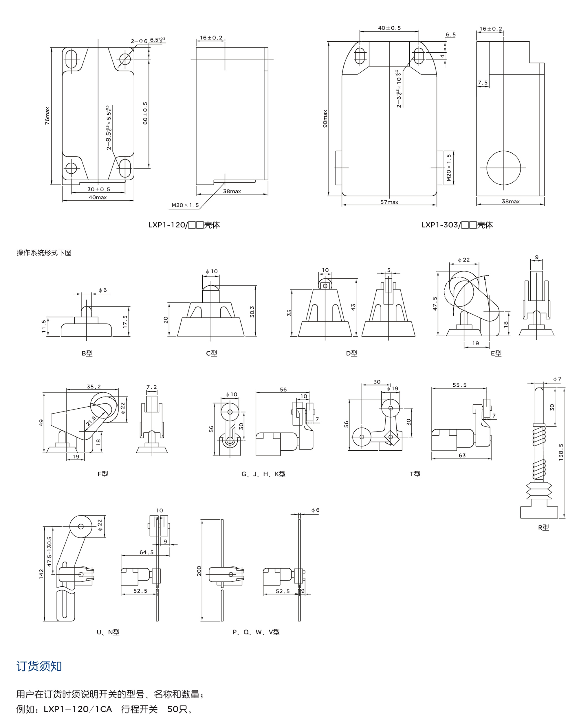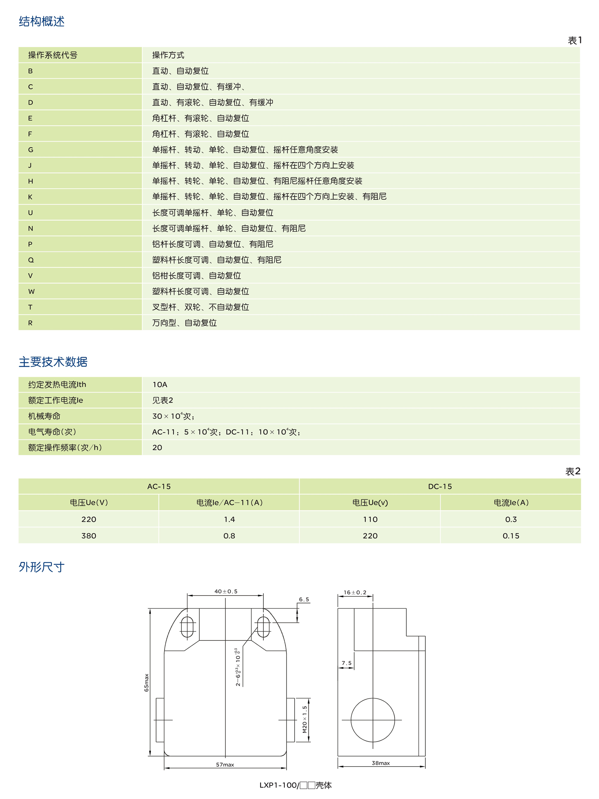 LXP1系列行程开关适用于交流(40-60)Hz,交流电压到380V,直流电压至220V、电流至10A的控制电路中,用来控制运动机构的行程及速度或作程序控制之用产品符合:GB/T14048.5 IEC60947-5-1标准。