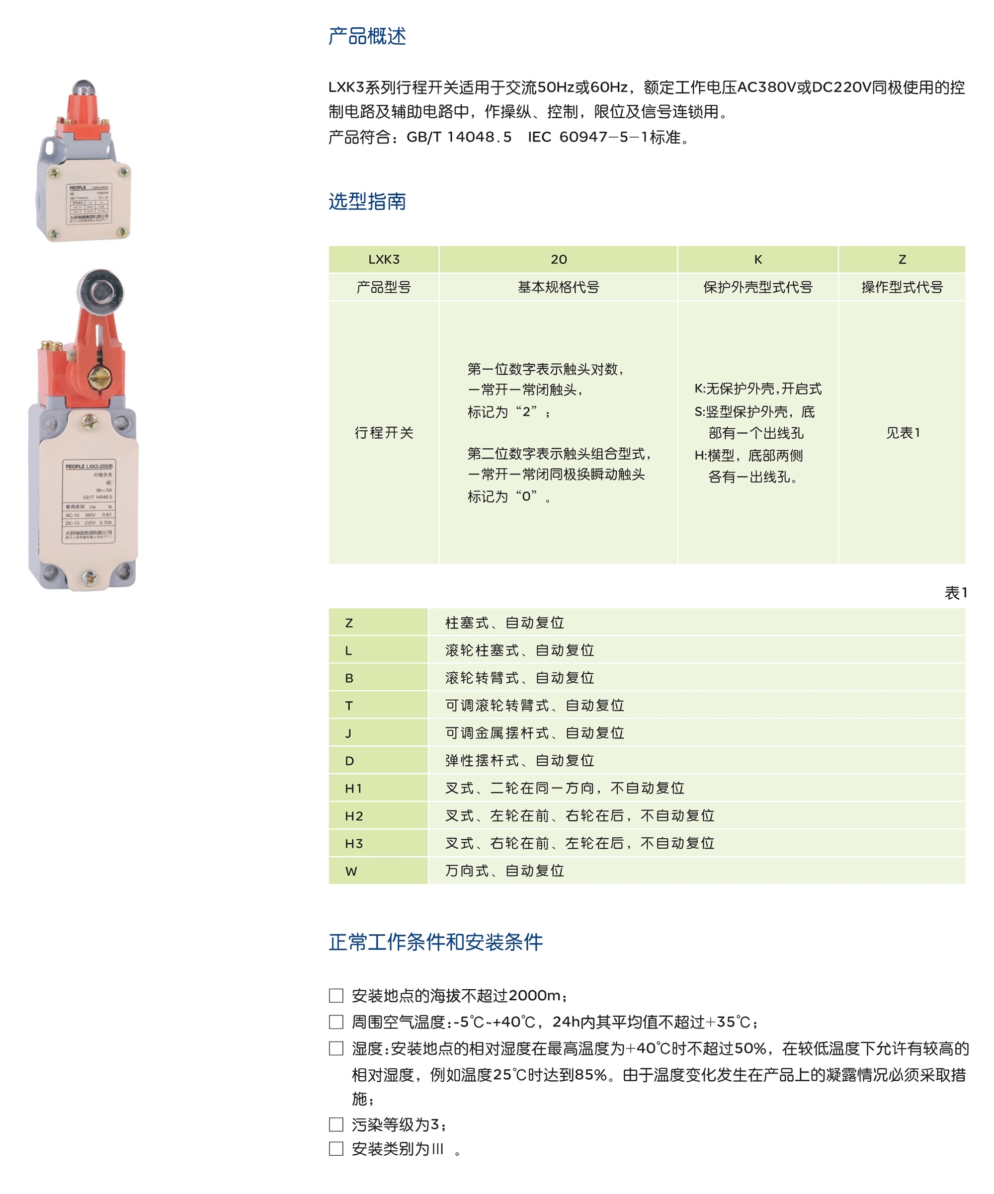 LXK3系列行程开关适用于交流50Hz或60Hz,额定工作电压AC380V或DC220V同极使用的控 制电路及辅助电路中,作操纵、控制,限位及信号连锁用。 产品符合:GB/T 14048.5 IEC 60947-5-1标准。
