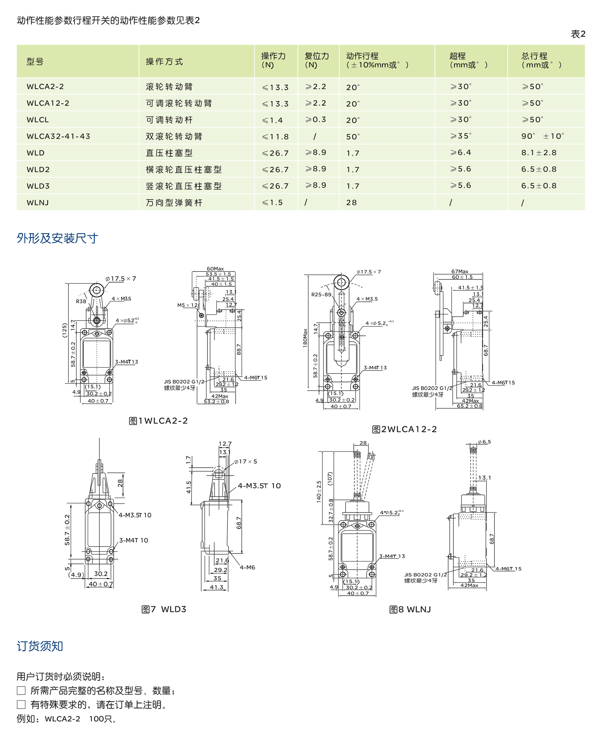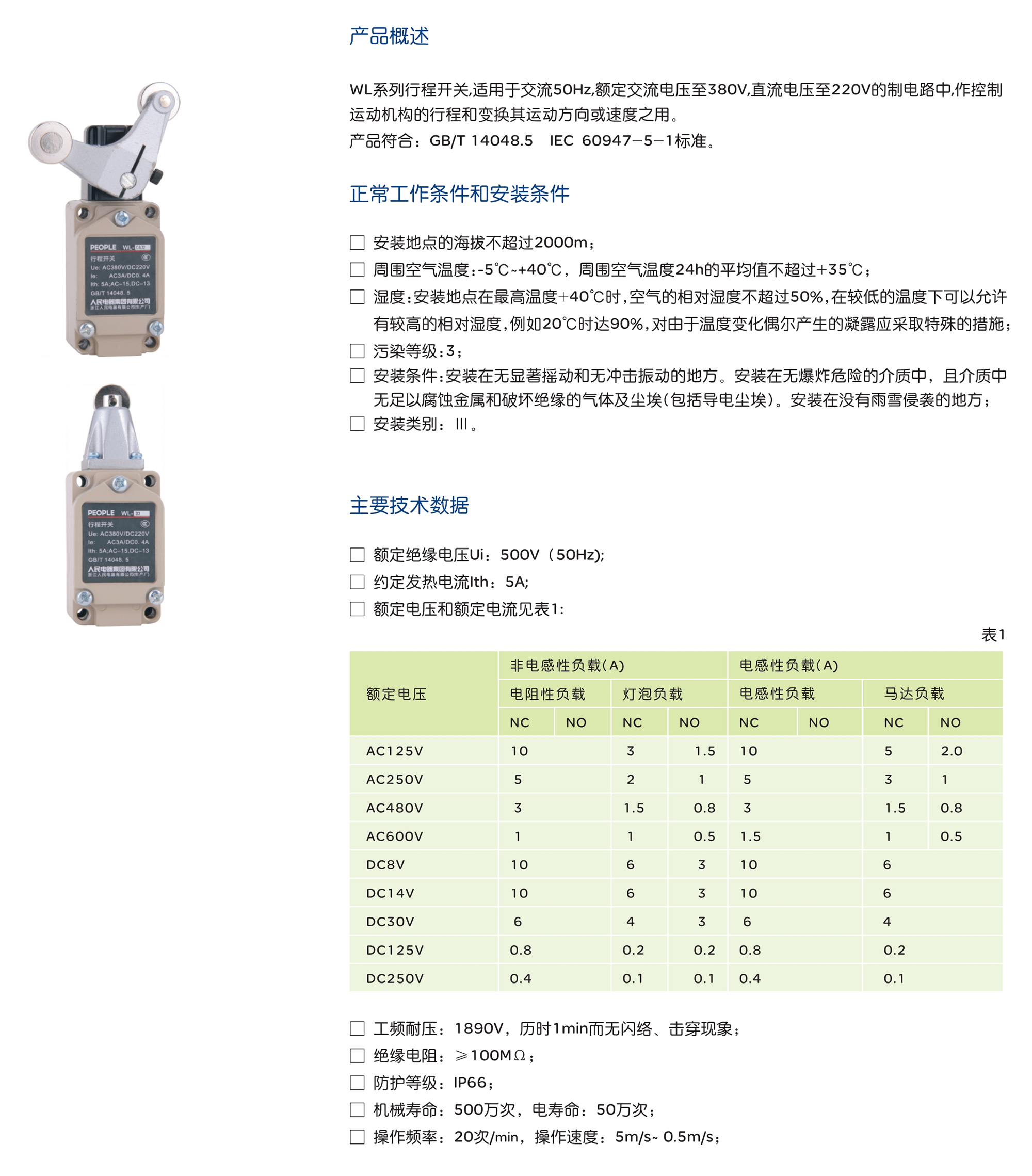 WL系列行程开关,适用于交流50Hz,额定交流电压至380V,直流电压至220V的制电路中,作控制 运动机构的行程和变换其运动方向或速度之用。 产品符合: GB/T 14048.5 IEC 60947-5-1标准。