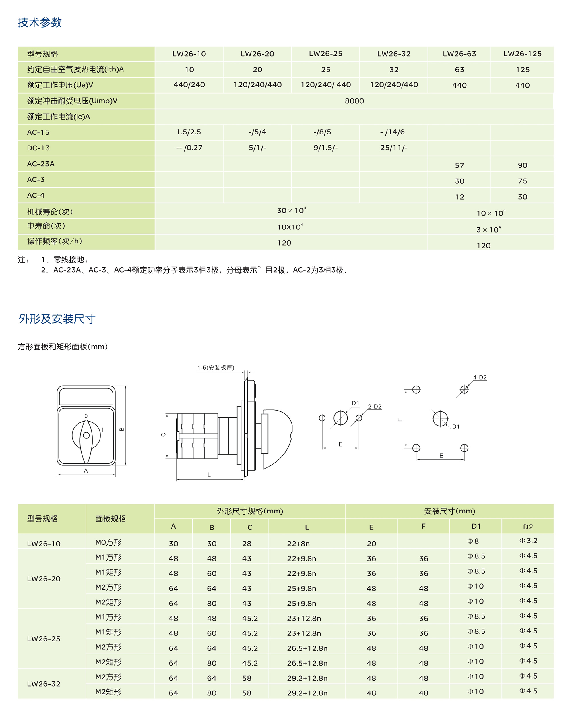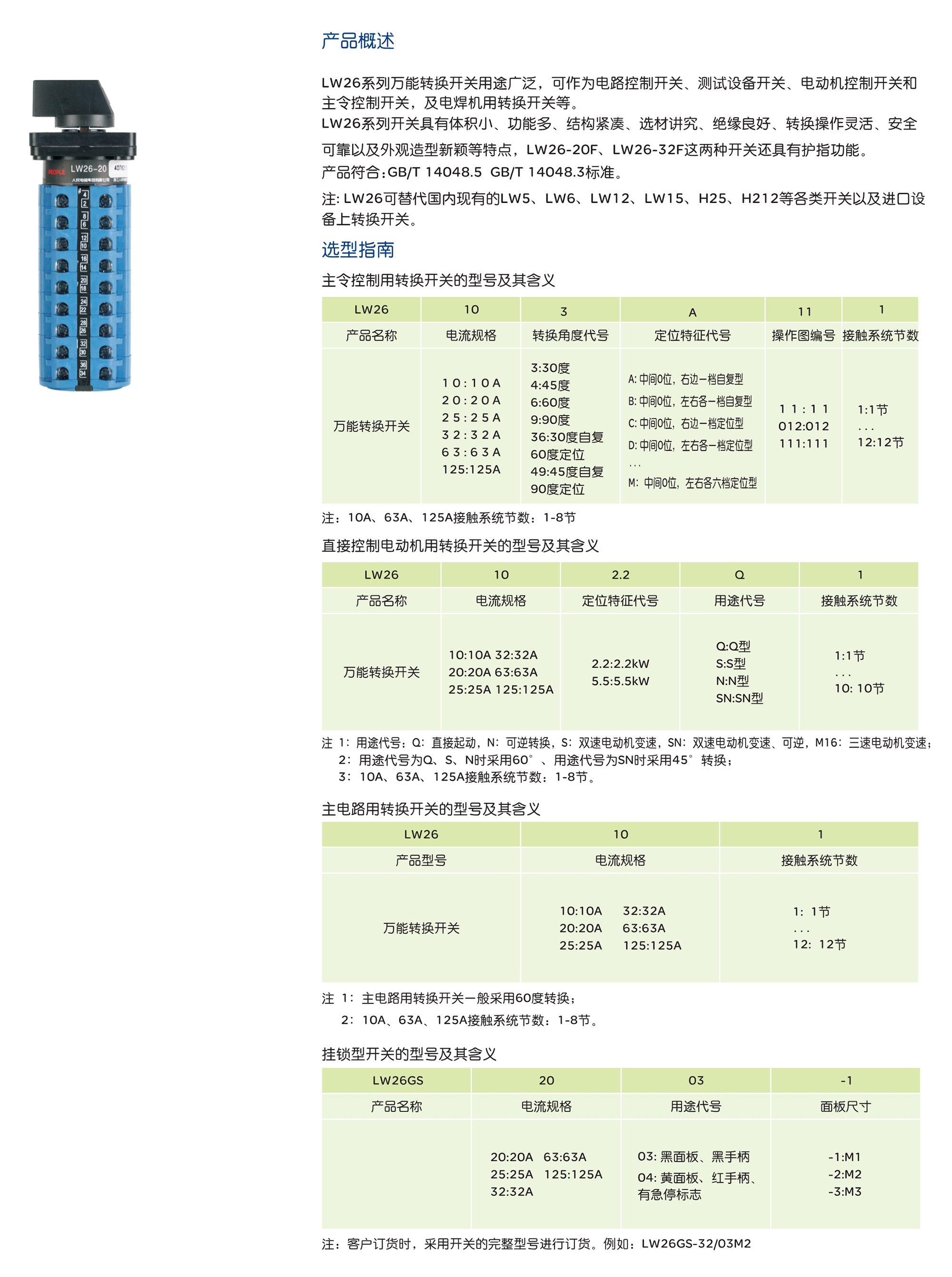 LW26系列开关具有体积小、功能多、结构紧凑、选材讲究、绝缘良好、转换操作灵活、安全可靠以及外观造型新颖等特点,LW26-20F、LW26-32F这两种开关还具有护指功能。
