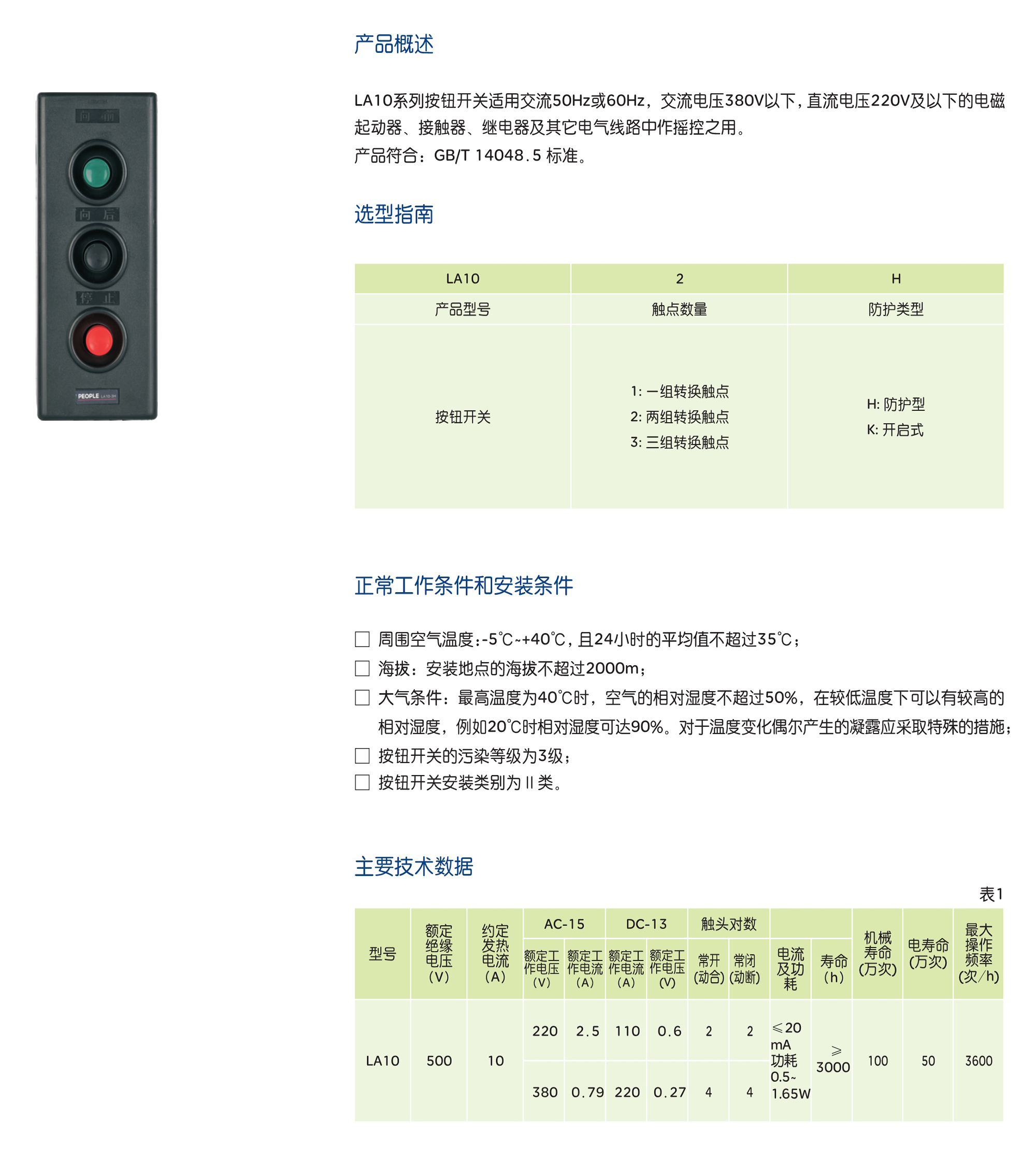 LA10系列按钮开关适用交流50Hz或60Hz,交流电压380V以下,直流电压220V及以下的电磁 起动器、接触器、继电器及其它电气线路中作摇控之用。 产品符合: GB/T 14048.5 标准。