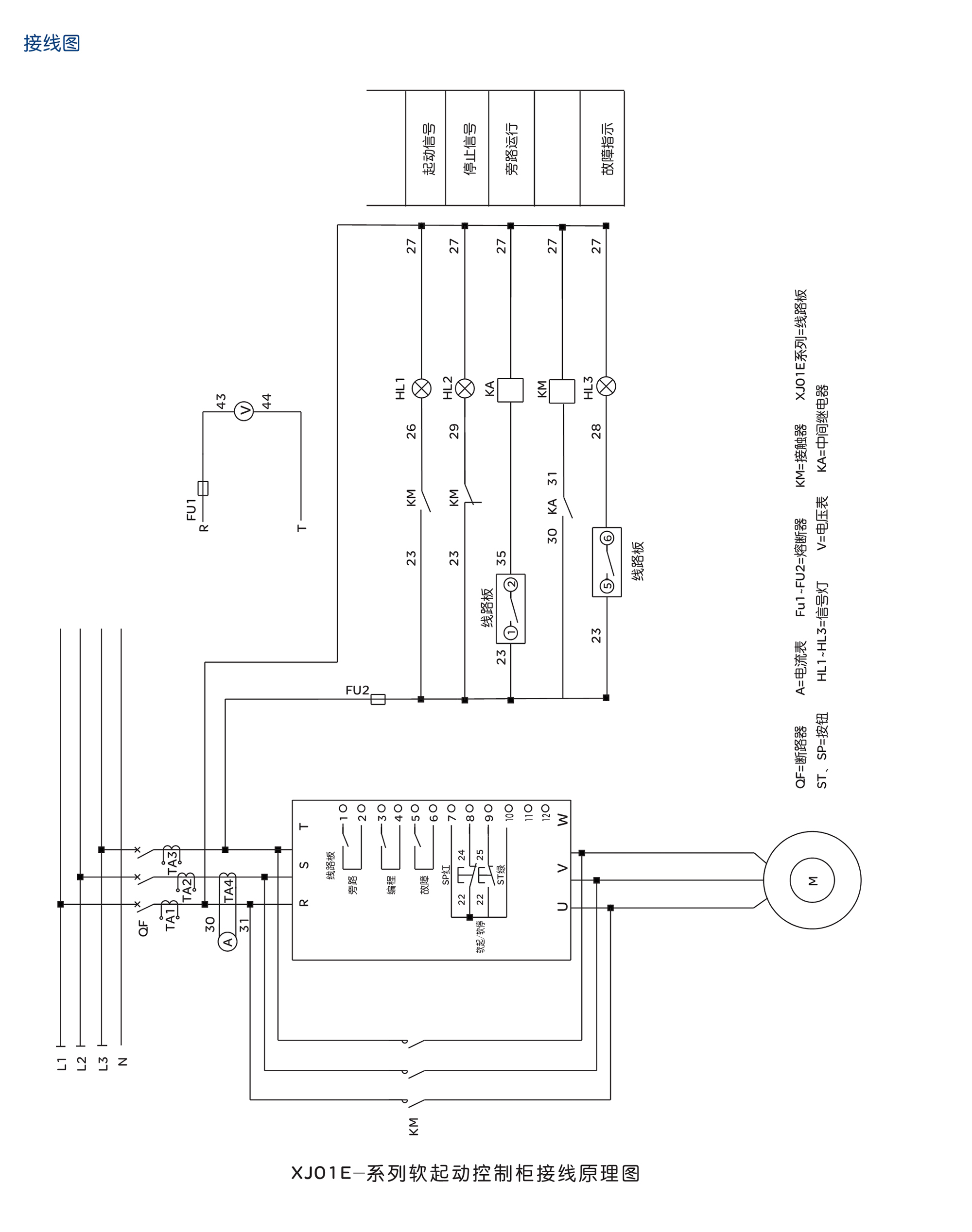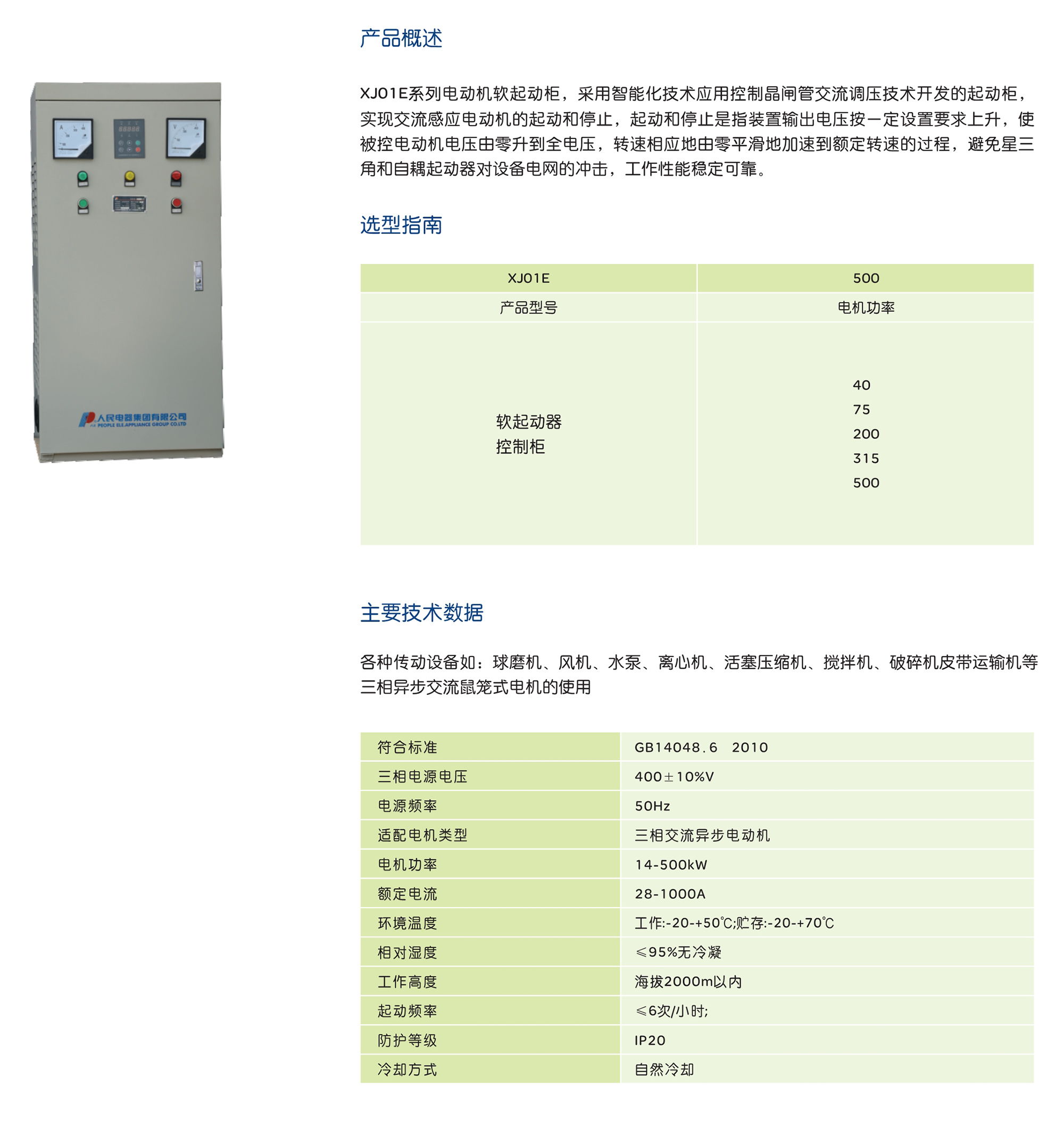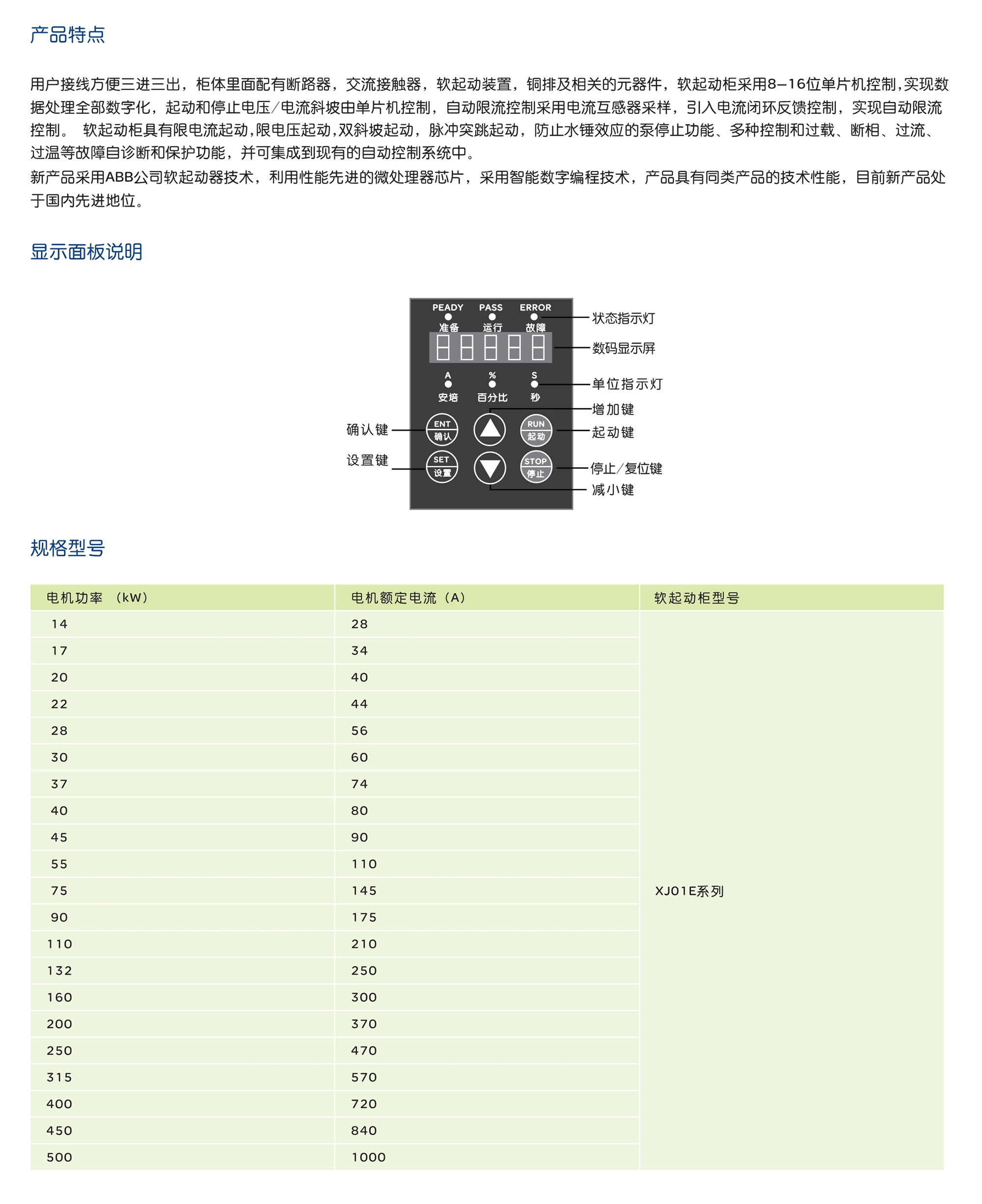 XJ01E系列电动机软起动柜,采用智能化技术应用控制晶闸管交流调压技术开发的起动柜, 实现交流感应电动机的起动和停止,起动和停止是指装置输出电压按一定设置要求上升,使 被控电动机电压由零升到全电压,转速相应地由零平滑地加速到额定转速的过程,避免星三 角和自耦起动器对设备电网的冲击,工作性能稳定可靠。