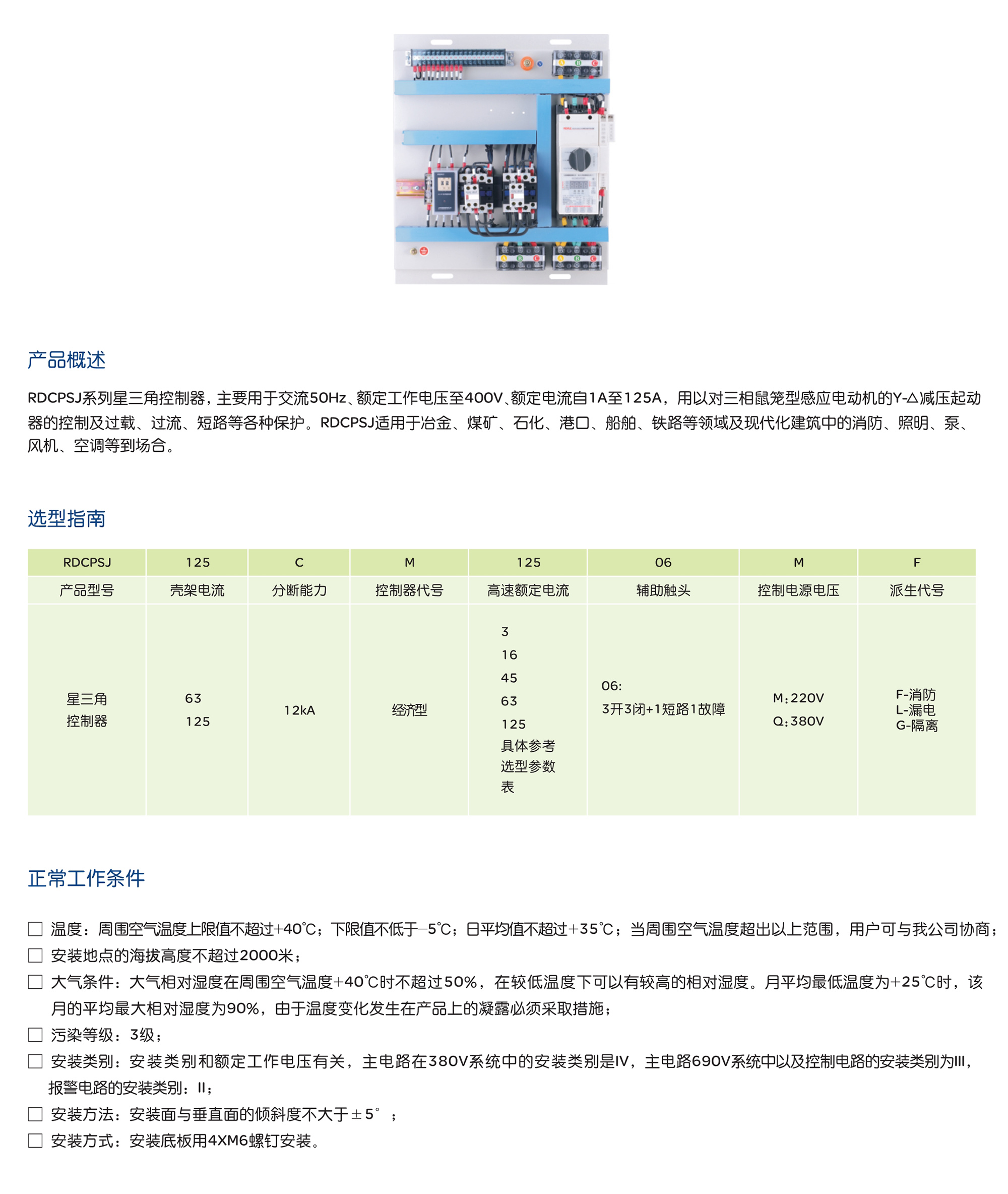 RDCPSJ系列星三角控制器,主要用于交流50Hz、额定工作电压至400V、额定电流自1A至125A,用以对三相鼠笼型感应电动机的Y- 减压起动器的控制及过载、过流、短路等各种?;ぁDCPSJ适用于冶金、煤矿、石化、港口、船舶、铁路等领域及现代化建筑中的消防、照明、泵、风机、空调等到场合。