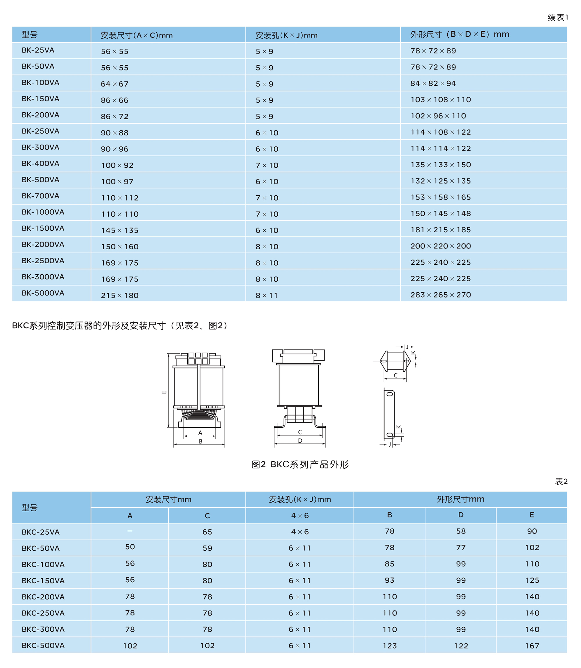 BK、BKC系列控制变压器适用于50 60Hz的交流电路中,作为机床和机械设备中一般电器的控 制电源、局部照明及指示电源。 产品符合:JB/T5555标准。
