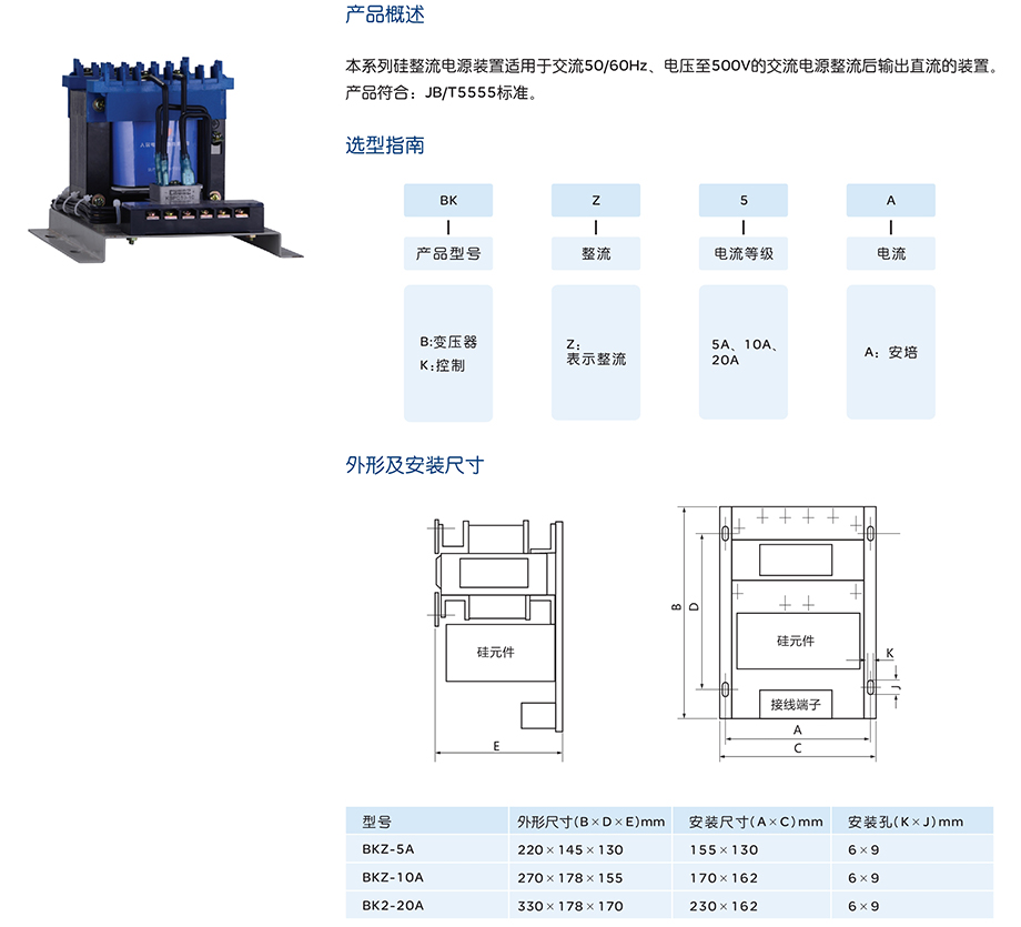 本系列硅整流电源装置适用于交流50/60Hz、电压至500V的交流电源整流后输出直流的装置。 产品符合:JB/T5555标准。