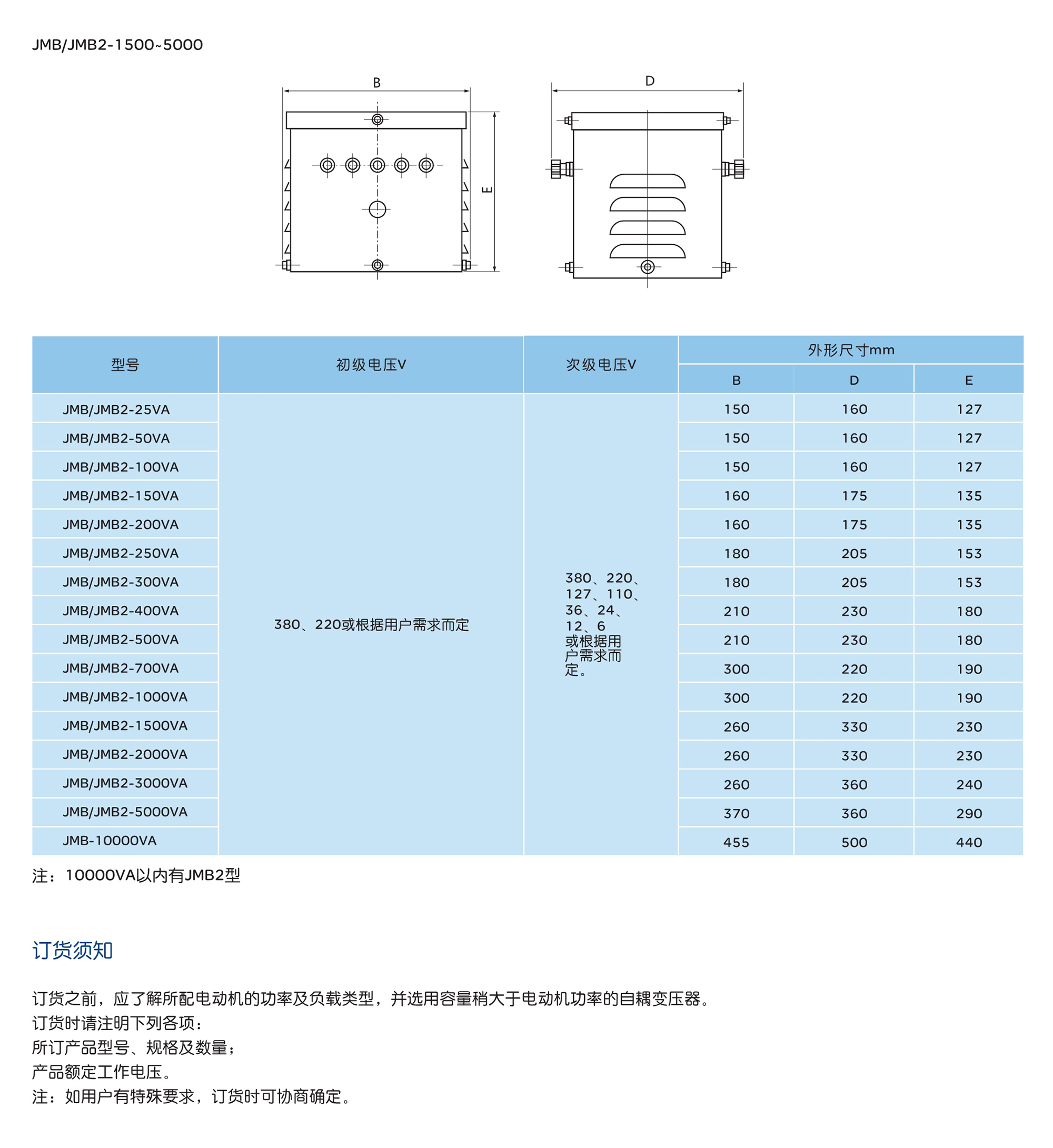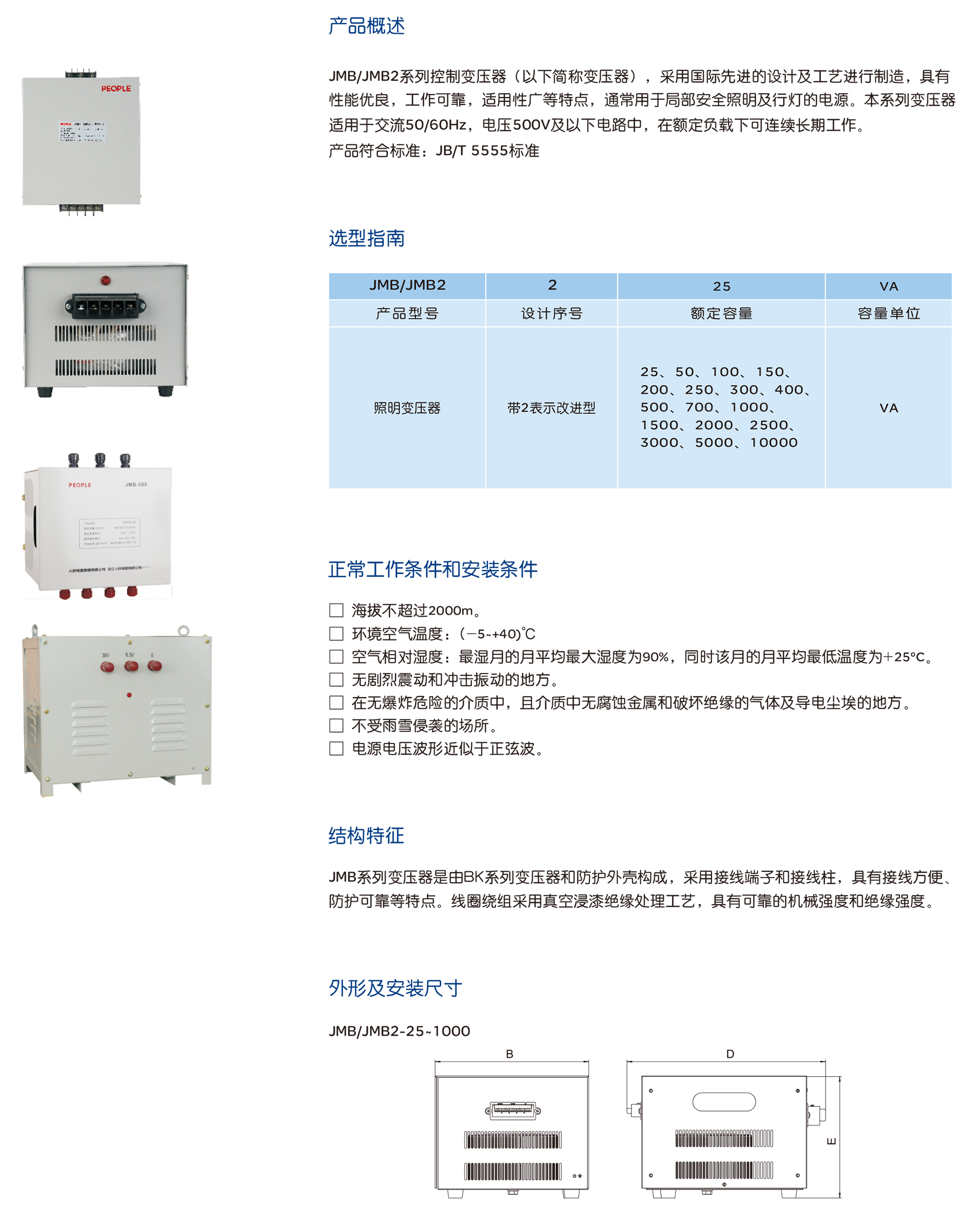 JMB/JMB2系列控制变压器(以下简称变压器),采用国际先进的设计及工艺进行制造,具有性能优良,工作可靠,适用性广等特点,通常用于局部安全照明及行灯的电源。本系列变压器适用于交流50/60Hz,电压500V及以下电路中,在额定负载下可连续长期工作。 产品符合标准:JB/T 5555标准