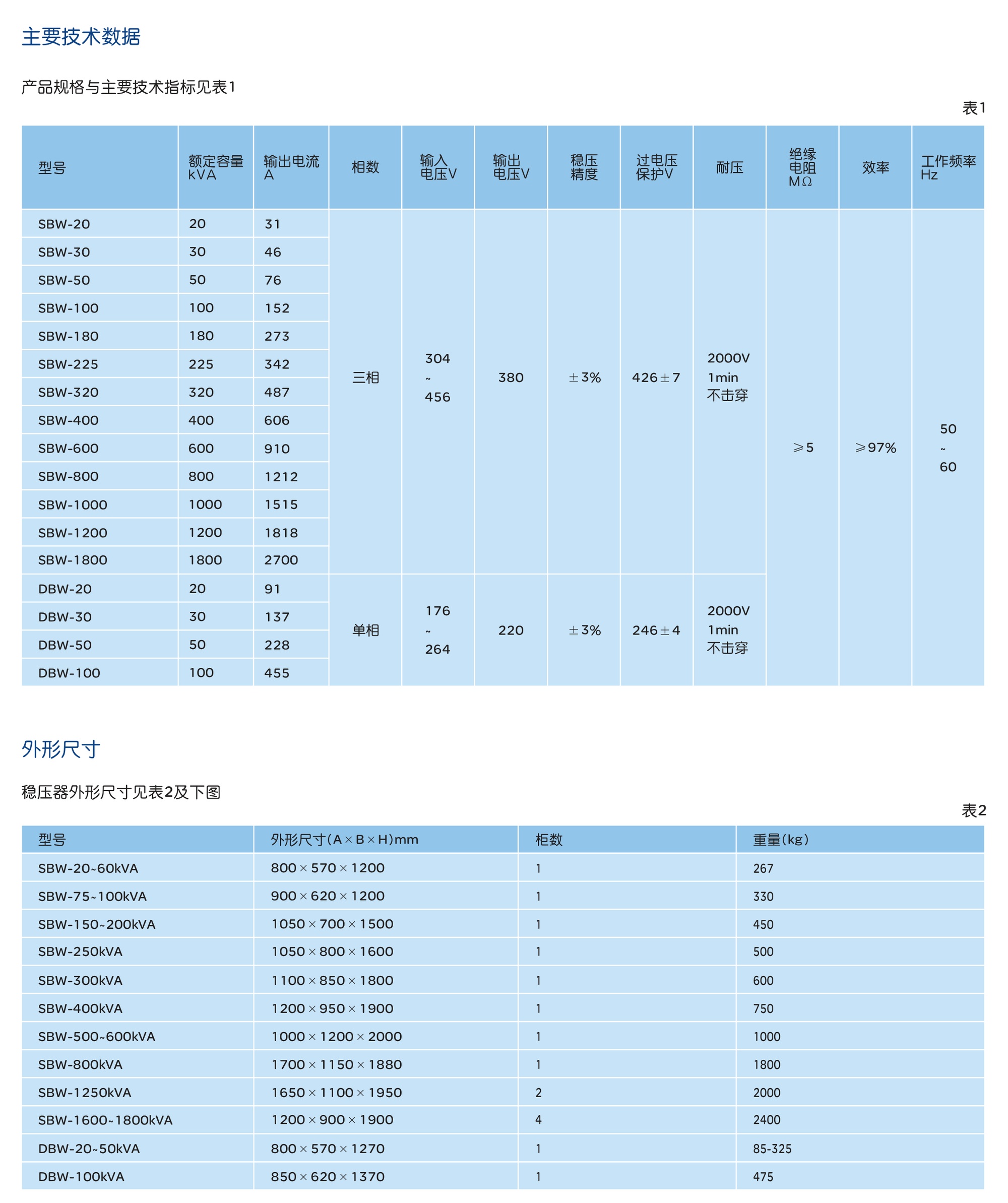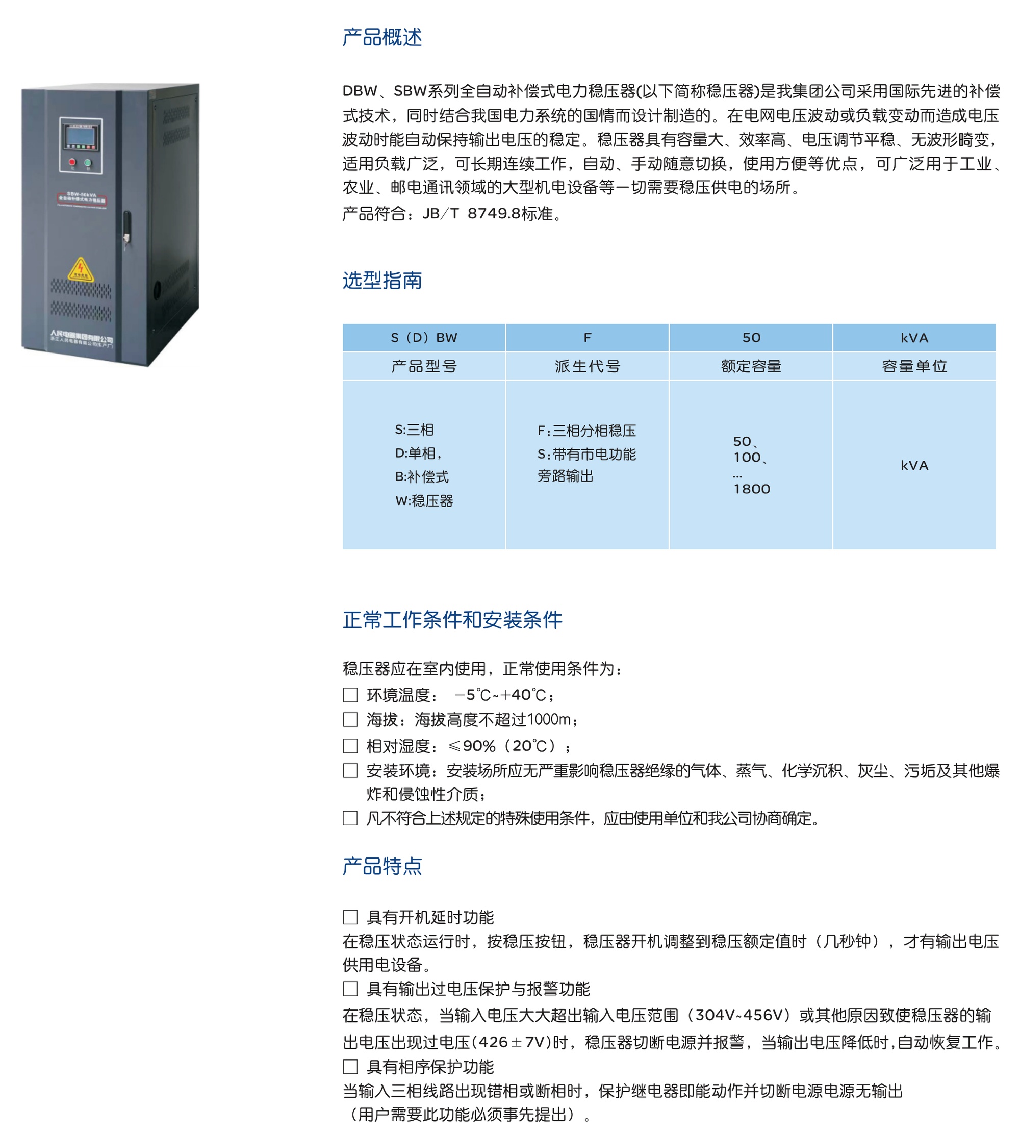 DBW、SBW系列全自动补偿式电力稳压器在电网电压波动或负载变动而造成电压波动时能自动保持输出电压的稳定。稳压器具有容量大、效率高、电压调节平稳、无波形畸变,适用负载广泛,可长期连续工作,自动、手动随意切换,使用方便等优点,可广泛用于工业、农业、邮电通讯领域的大型机电设备等一切需要稳压供电的场所。 产品符合:JB/T8749.8标准。