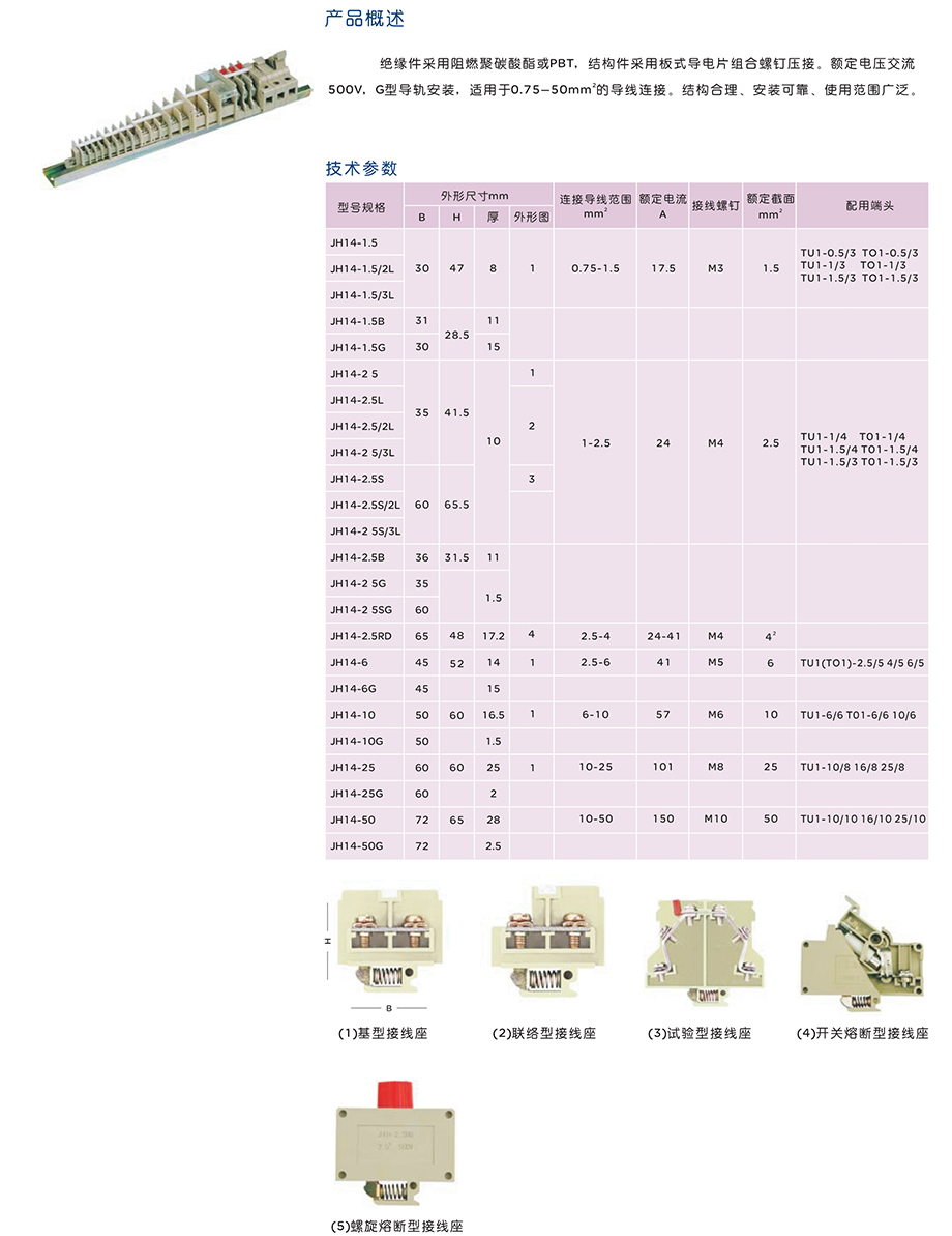 绝缘件采用阻燃聚碳酸酯或PBT,结构件采用板式导电片组合螺钉压接。额定电压交流500V,G型导轨安装,适用于0.75—50mm2 的导线连接。结构合理、安装可靠、使用范围广泛。