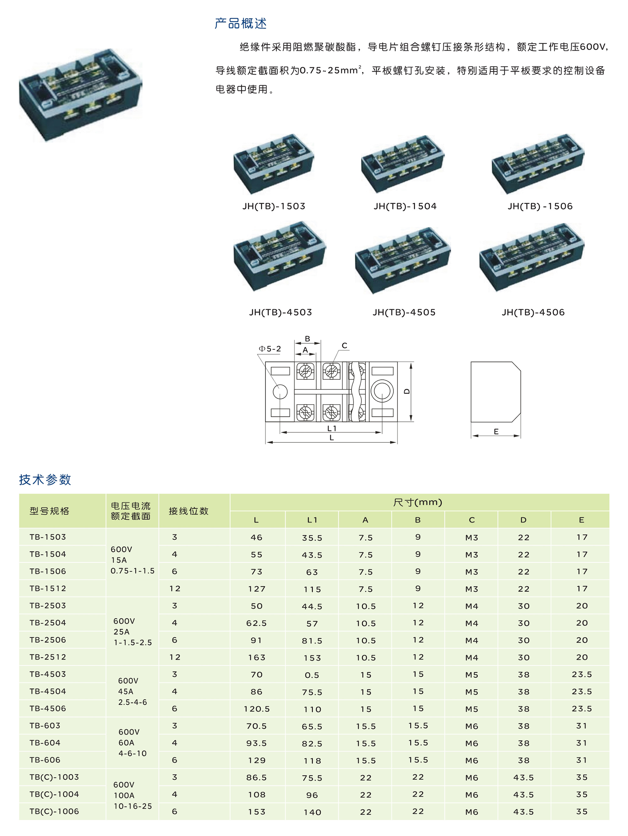绝缘件采用阻燃聚碳酸酯,导电片组合螺钉压接条形结构,额定工作电压600V导线连接截面0.75-25mm2 平板螺钉孔安装,特别适用于平板要求的控制设备电器中使用。