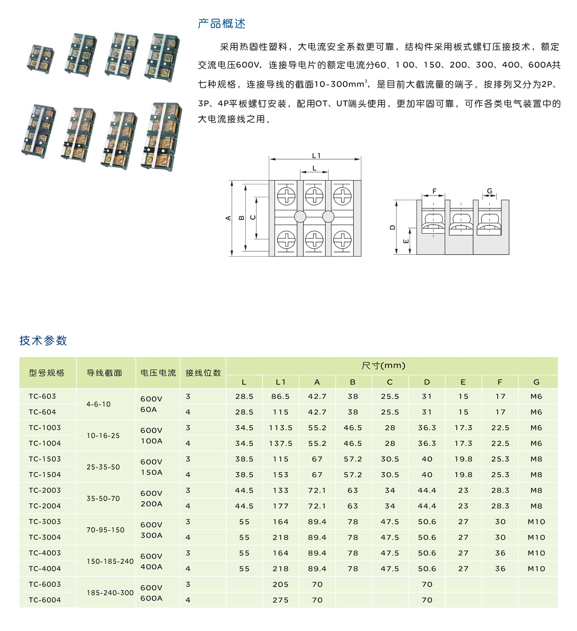 采用热固性塑料,大电流安全系数更可靠,结构件采用板式螺钉压接技术,额定 交流电压600V,连接导电片的额定电流分60、1 00、1 50、200、300、400、600A 共七种规格,连接导线的截面10~300mm2,是目前大截流量的端子。按排列又分为 2P、3P、4P平板螺钉安装,配用OT、UT端头使用,更加牢固可靠,可作各类电气装置 中的大电流接线之用。