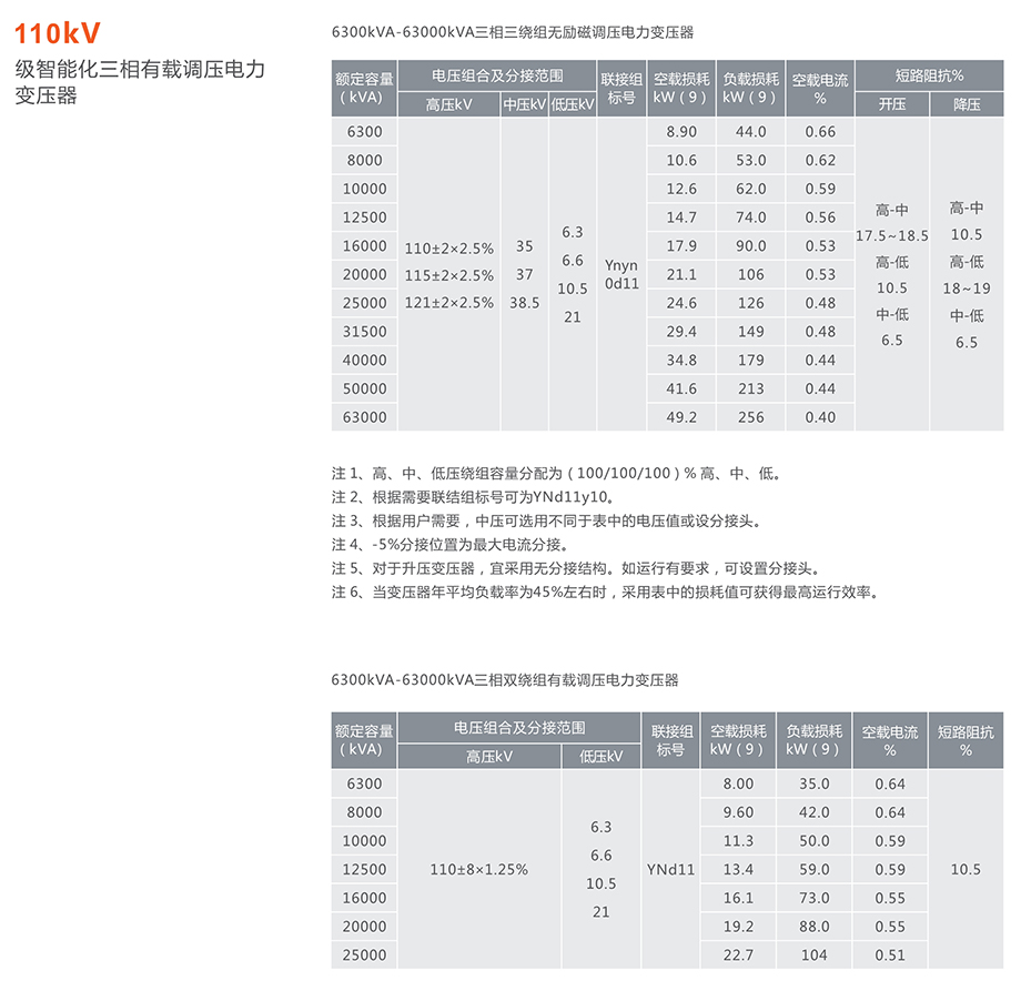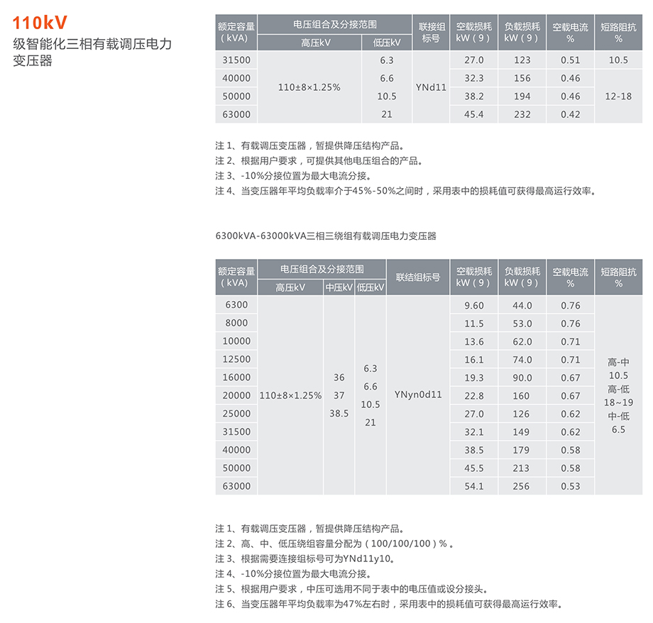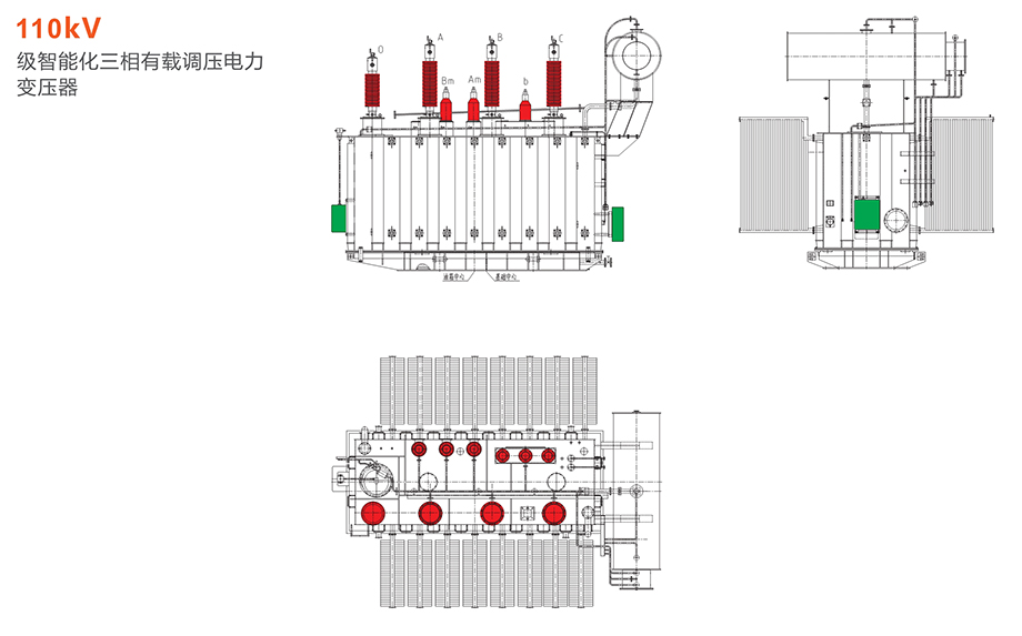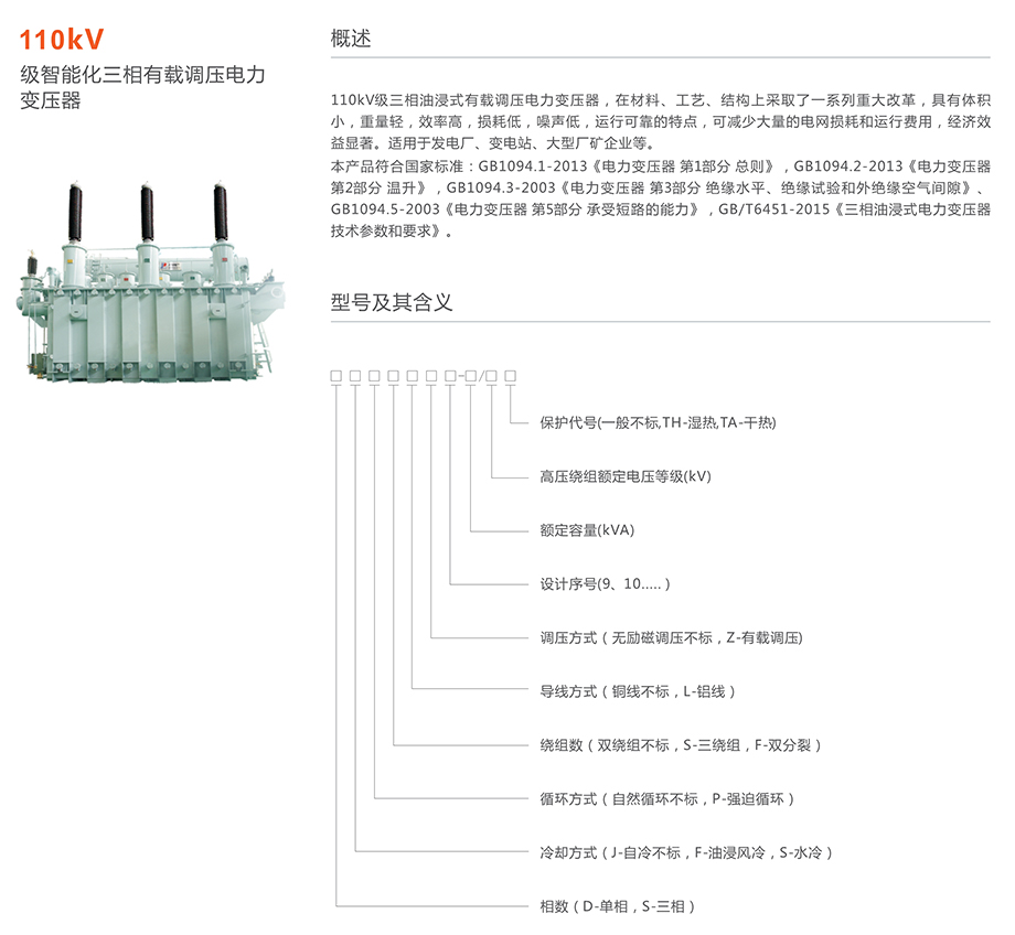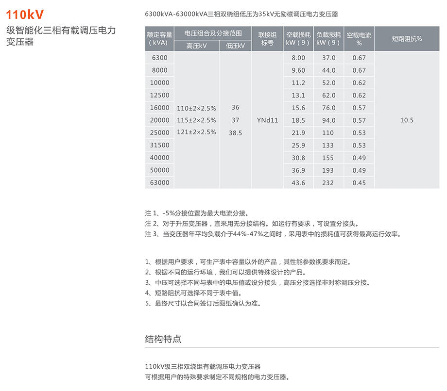 110kV级三相油浸式有载调压电力变压器,在材料、工艺、结构上采取了一系列重大改革,具有体积小,重量轻,效率高,损耗低,噪声低,运行可靠的特点,可减少大量的电网损耗和运行费用,经济效益显著。适用于发电厂、变电站、大型厂矿企业等。