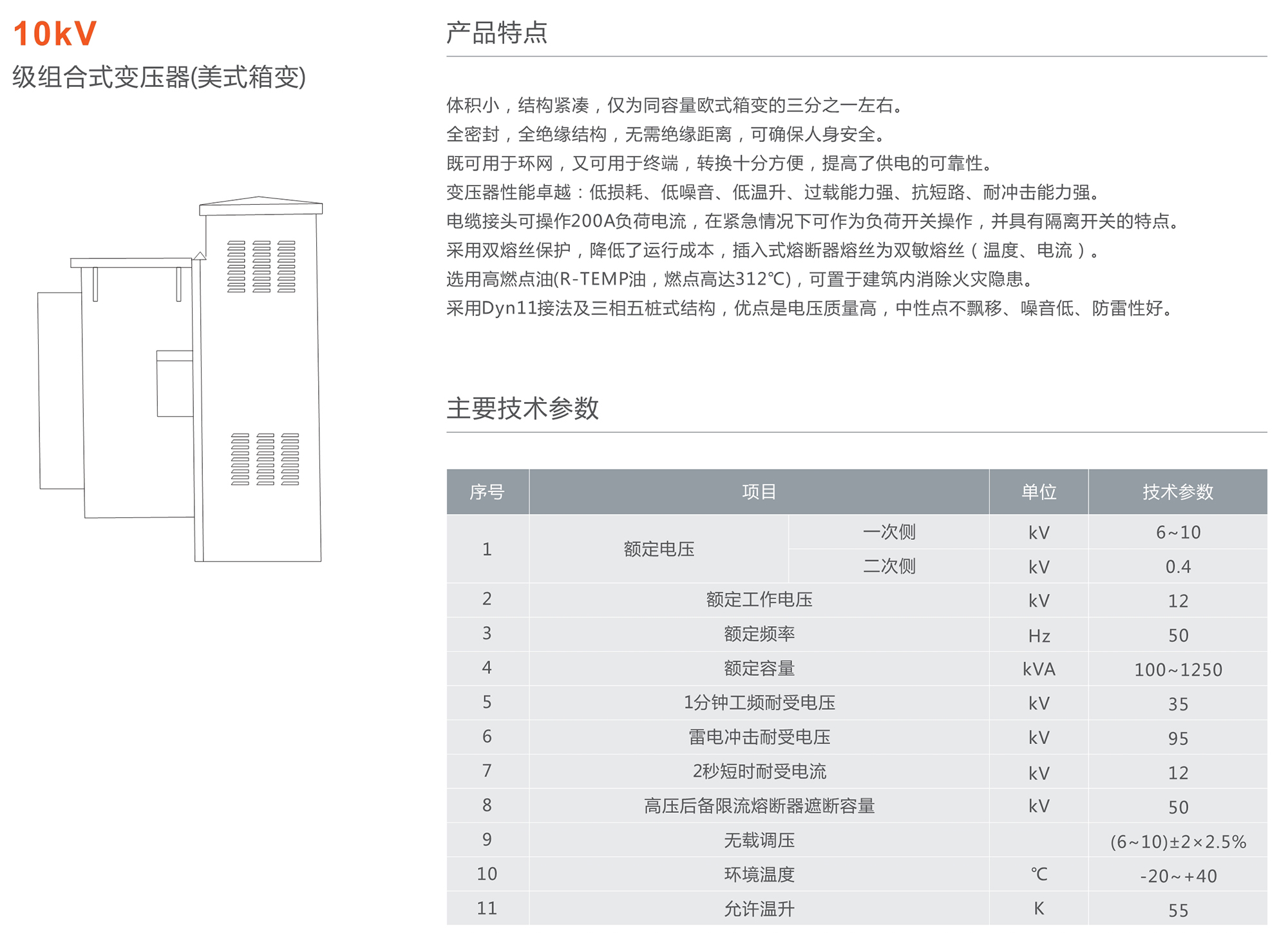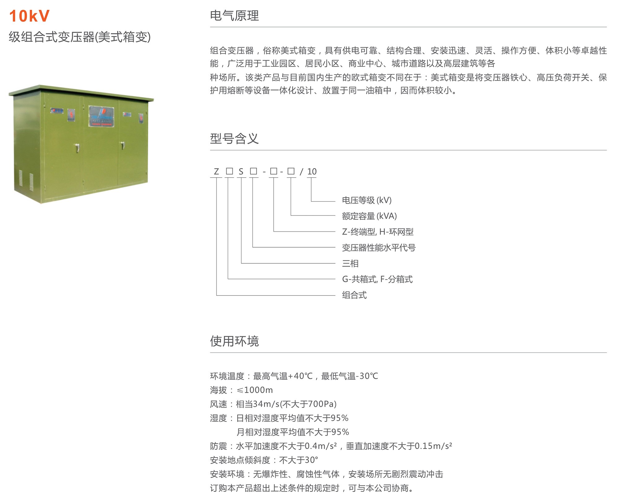 组合变压器,俗称美式箱变,具有供电可靠、结构合理、安装迅速、灵活、操作方便、体积小等卓越性能,广泛用于工业园区、居民小区、商业中心、城市道路以及高层建筑等各种场所。该类产品与目前国内生产的欧式箱变不同在于:美式箱变是将变压器铁心、高压负荷开关、?;び萌鄱系壬璞敢惶寤杓?、放置于同一油箱中,因而体积较小。