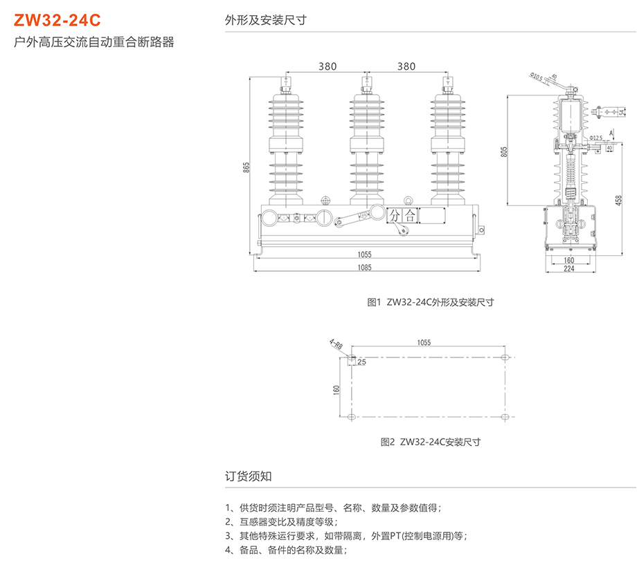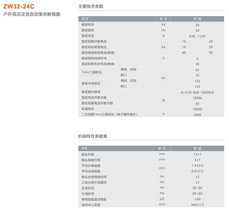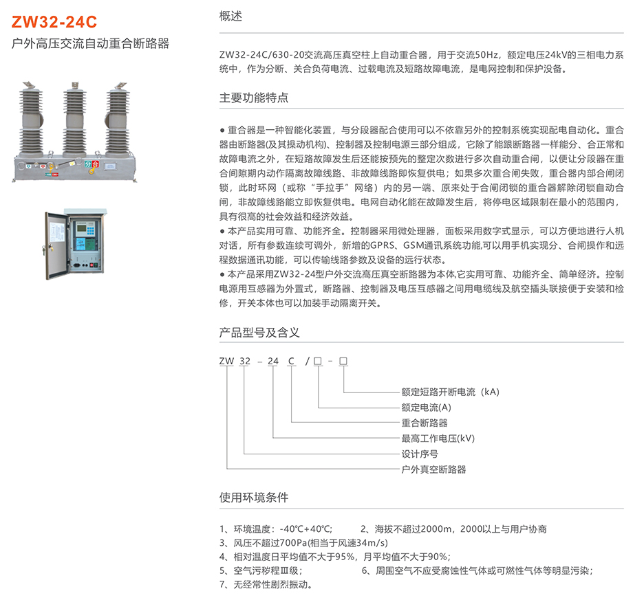 ZW32-24C/630-20交流高压真空柱上自动重合器,用于交流50Hz,额定电压24kV的三相电力系 统中,作为分断、关合负荷电流、过载电流及短路故障电流,是电网控制和?;っ槐?。