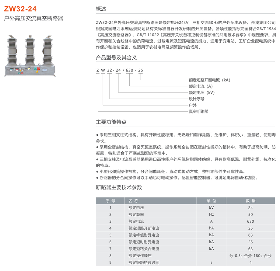 ZW32-24/630-25型户外高压交流真空断路器是额定电压24kV,三相交流50Hz的户外配电设备。是我集团公司根据我国电力系统远景规划及有关标准自行开发研制的开关设备,各项性能指标完全符合 GB1984-2003《高压交流断路器》、GB/T11022-1999《高压开关设备和控制设备标准的共用技术要求》中规定要求。具有开断和关合线路中的负荷电流、过载电流及短路电流的能力。