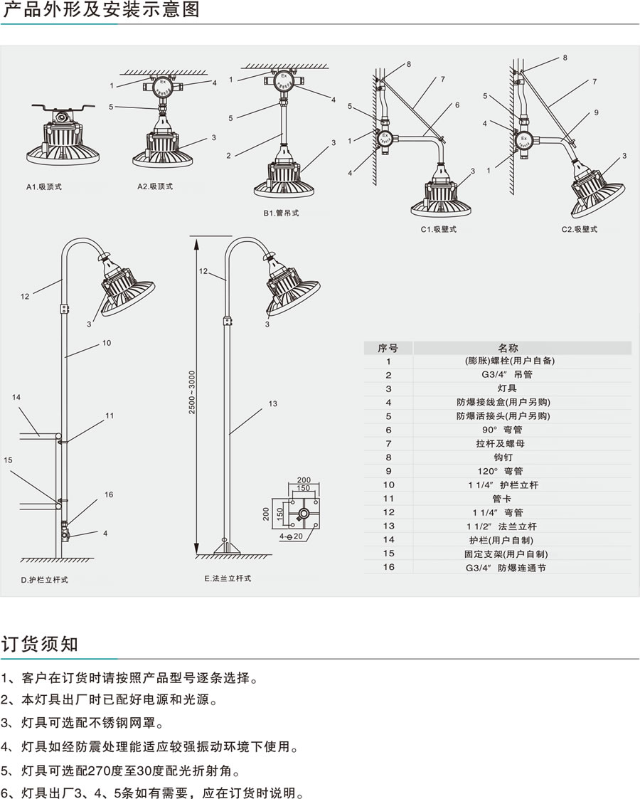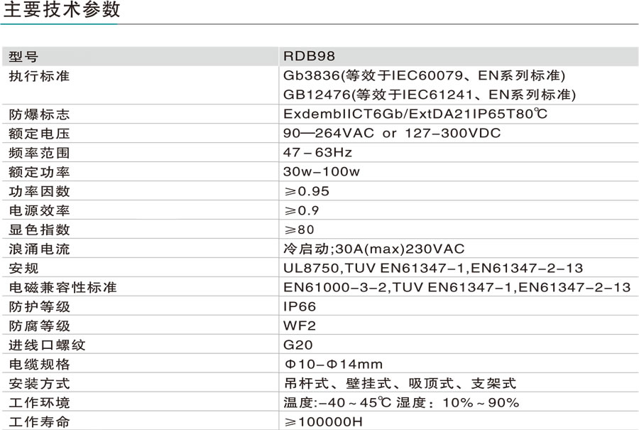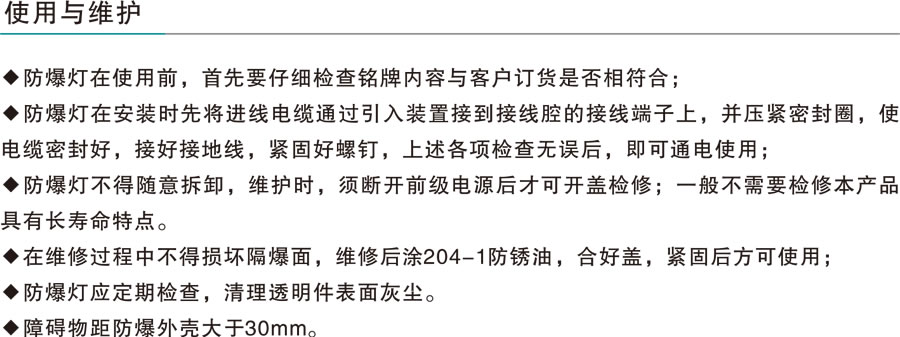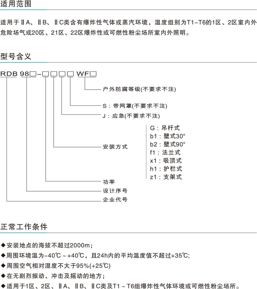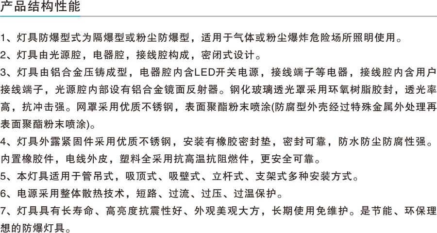 适用于ⅡA、ⅡB、ⅡC类含有爆炸性气体或蒸汽环境,温度组别为T1-T6的1区、2区室内外危险场气或20区、21区、22区爆炸性或可燃性粉尘场所室内外照明。