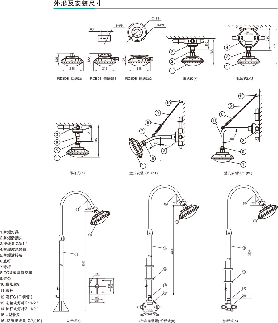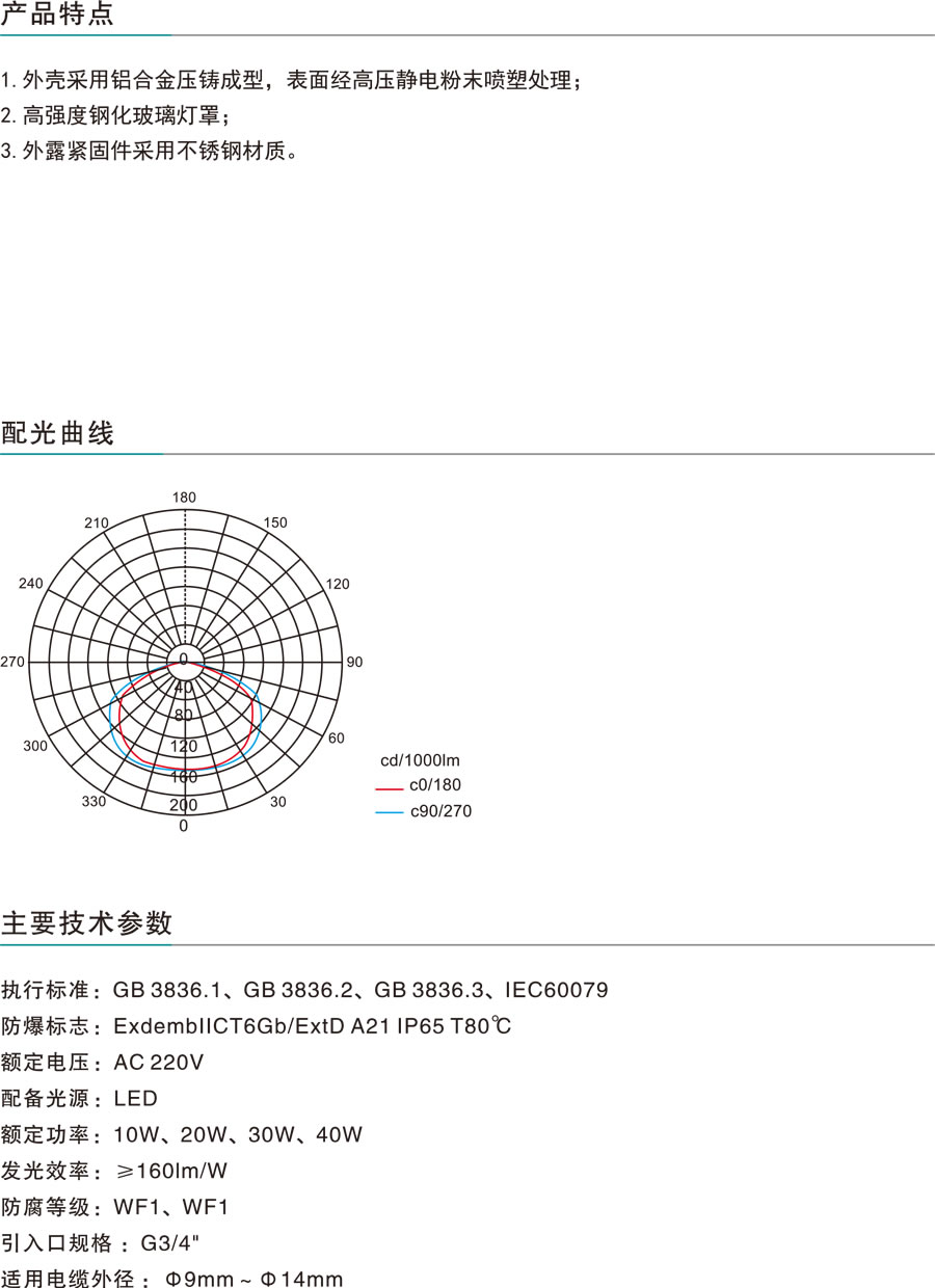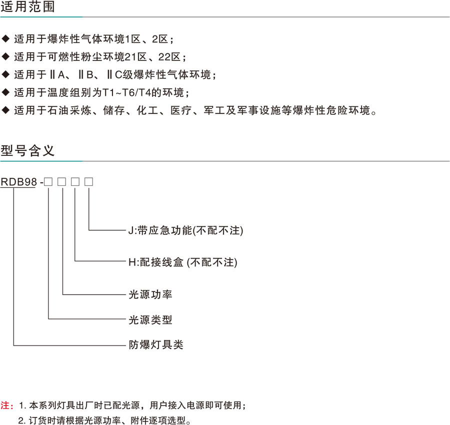 适用于ⅡA、ⅡB、ⅡC类含有爆炸性气体环境,温度组别为T1-T6/T4的1区、2区室内外危险场气或21区、22区爆炸性或可燃性粉尘场所室内外照明。