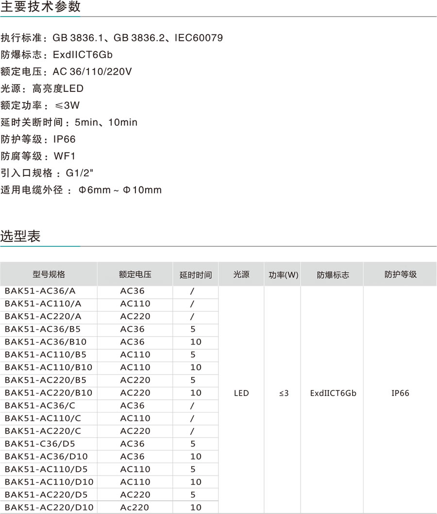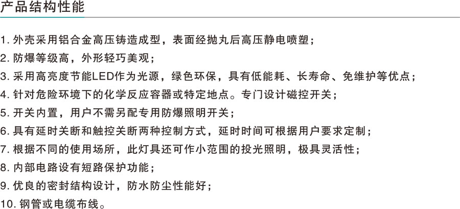 适用于ⅡA、ⅡB、ⅡC类含有爆炸性气体环境,温度组别为T1-T6的1区、2区室内外危险场气室内外照明。