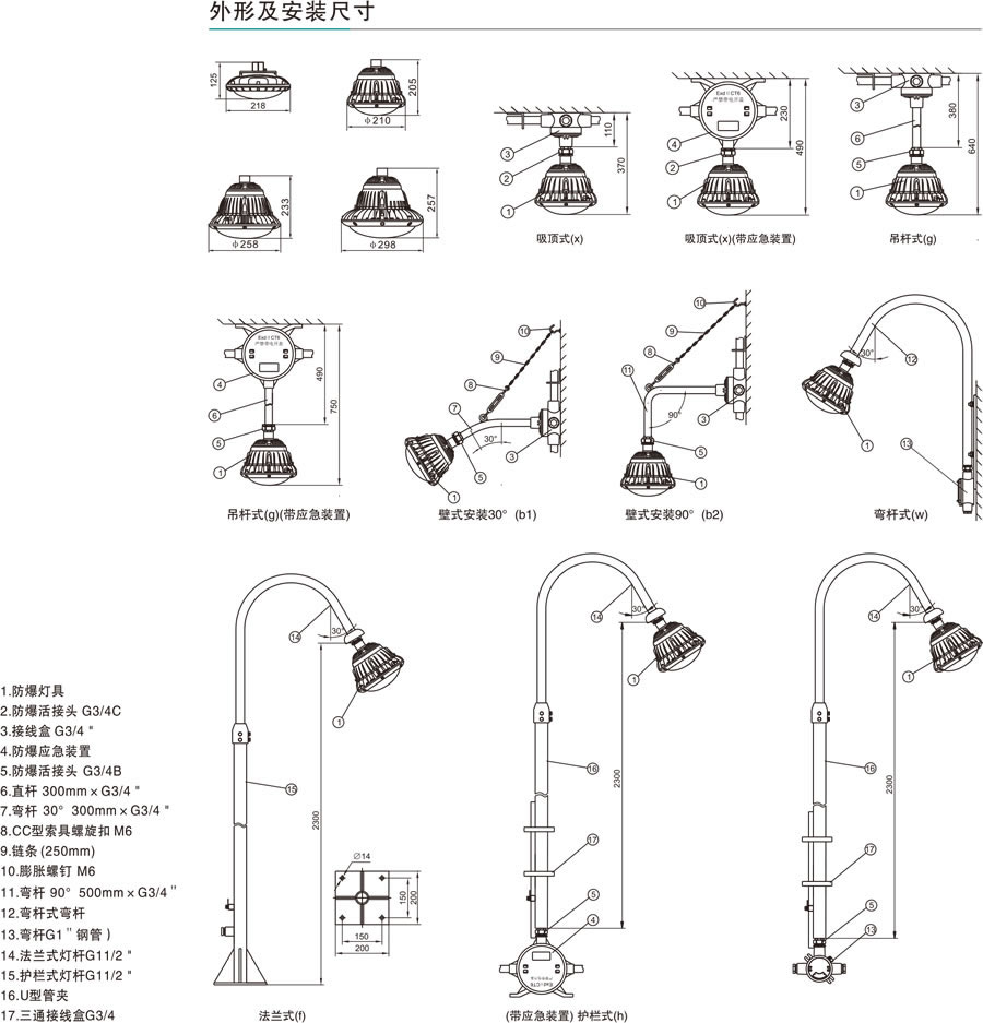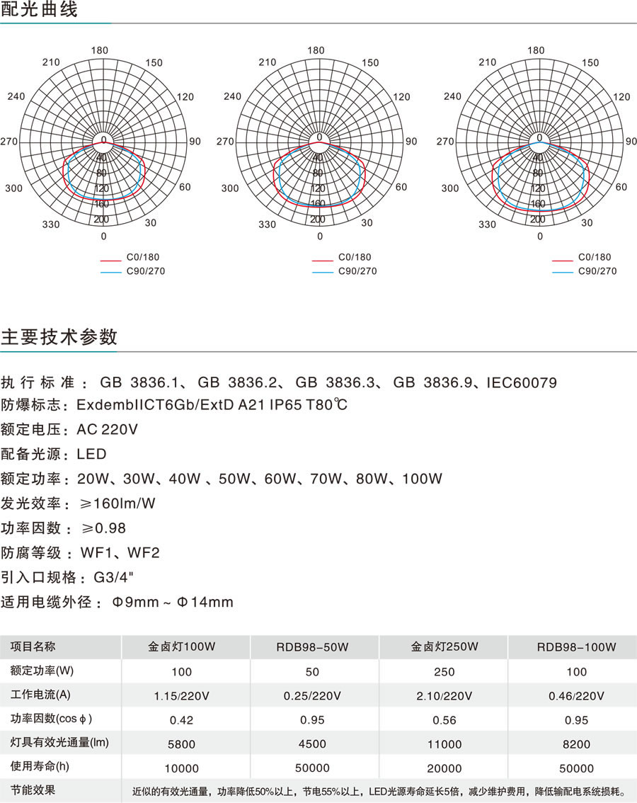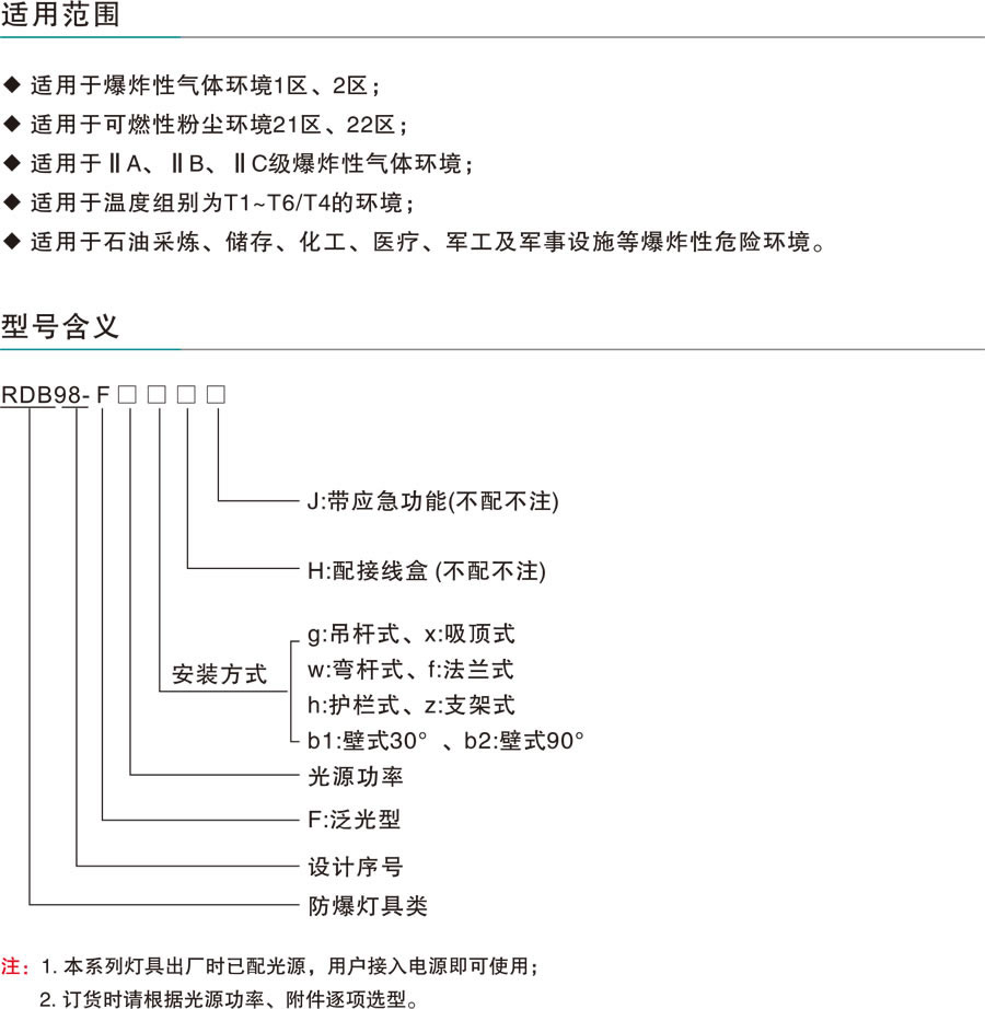 适用于ⅡA、ⅡB、ⅡC类含有爆炸性气体环境,温度组别为T1-T6的1区、2区室内外危险场气或21区、22区爆炸性或可燃性粉尘场所室内外照明。