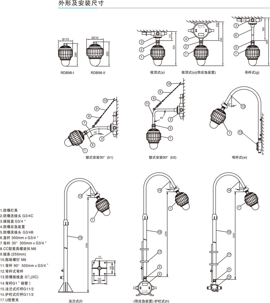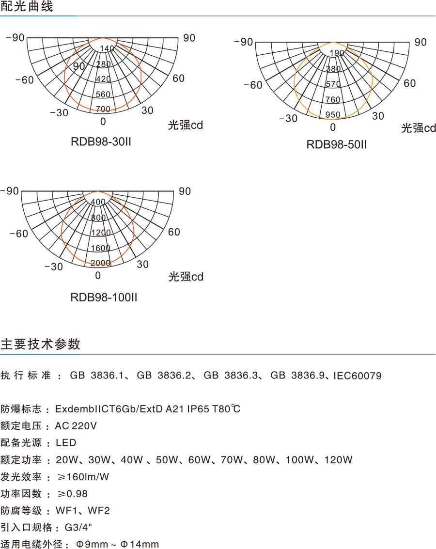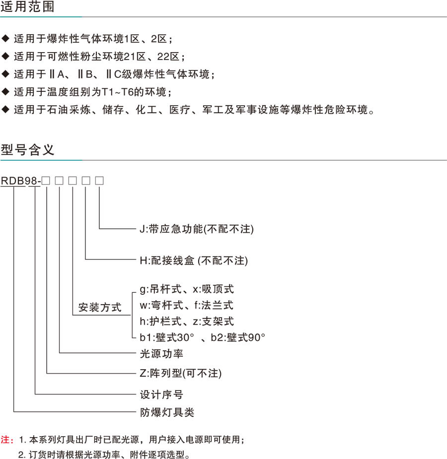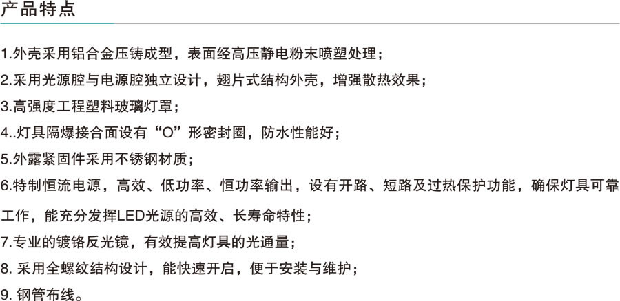 适用于ⅡA、ⅡB、ⅡC类含有爆炸性气体环境,温度组别为T1-T6的1区、2区室内外危险场气或21区、22区爆炸性或可燃性粉尘场所室内外照明。