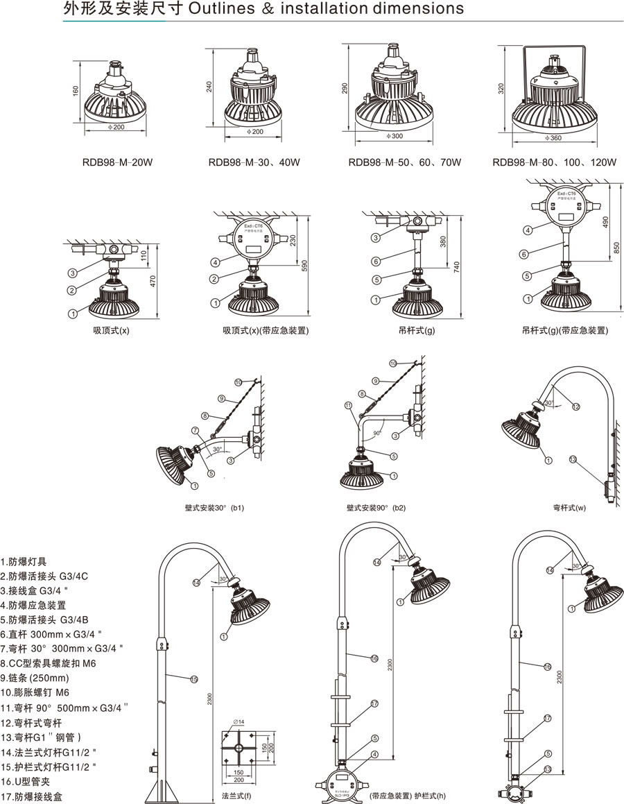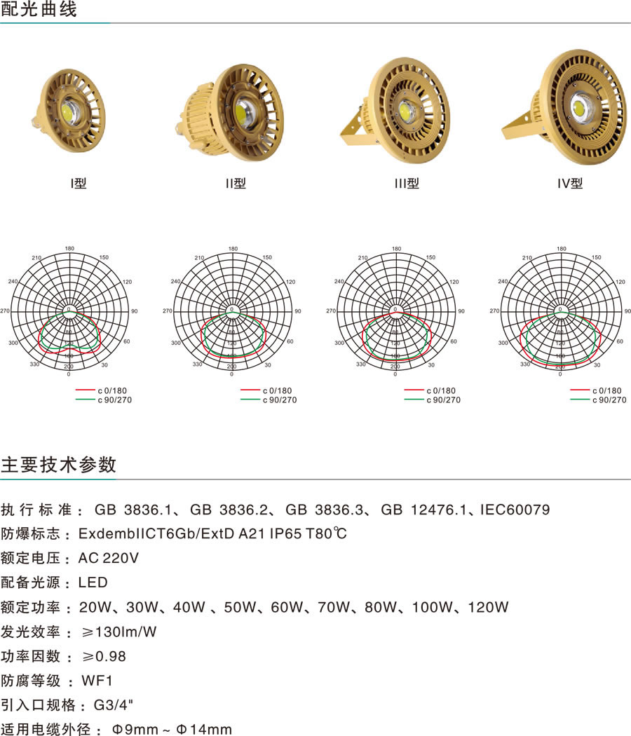 适用于ⅡA、ⅡB、ⅡC类含有爆炸性气体或蒸汽环境,温度组别为T1-T6/T4的1区、2区室内外危险场气或21区、22区爆炸性或可燃性粉尘场所室内外照明。