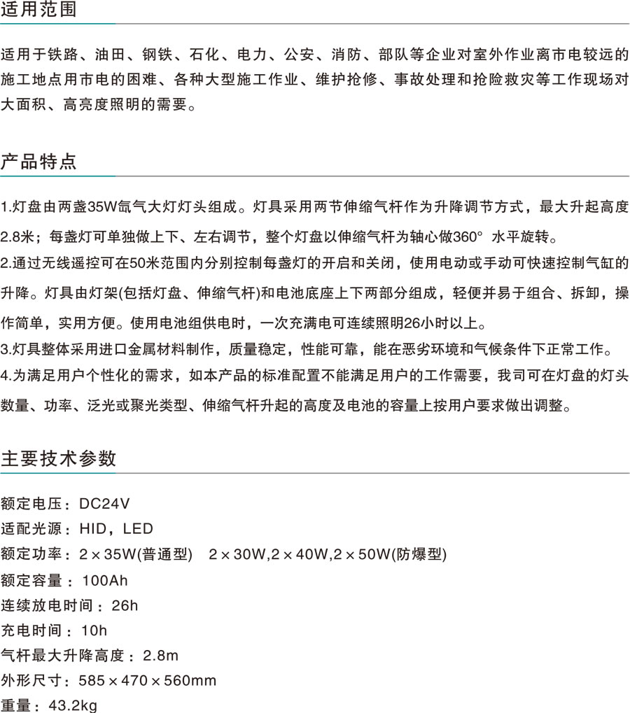 适用于铁路、油田、钢铁、石化、电力、公安、消防、部队等企业对室外作业离市电较远的施工地点用市电的困难、各种大型施工作业、维护抢修、事故处理和抢险救灾等工作现场对大面积、高亮度照明的需要。