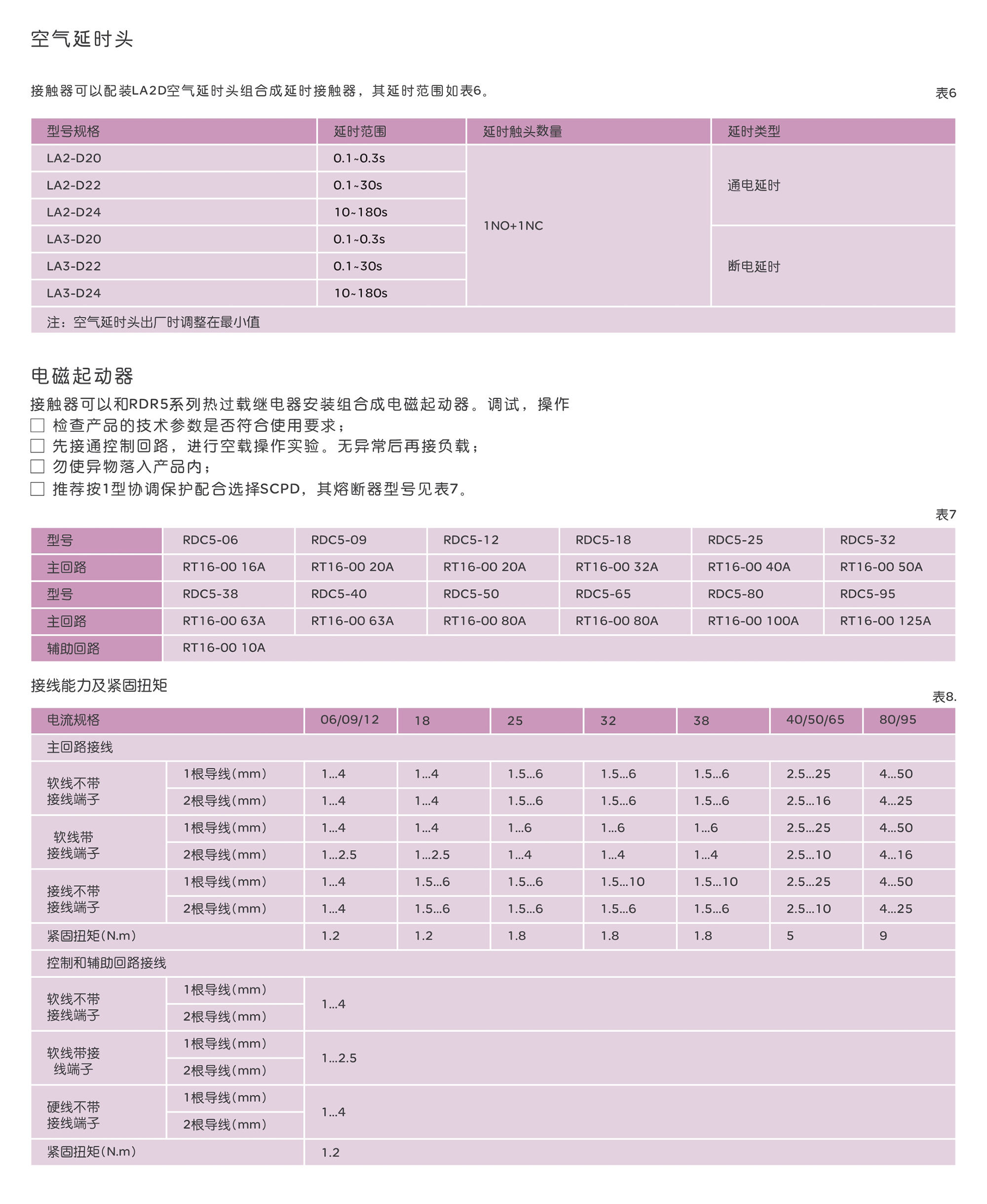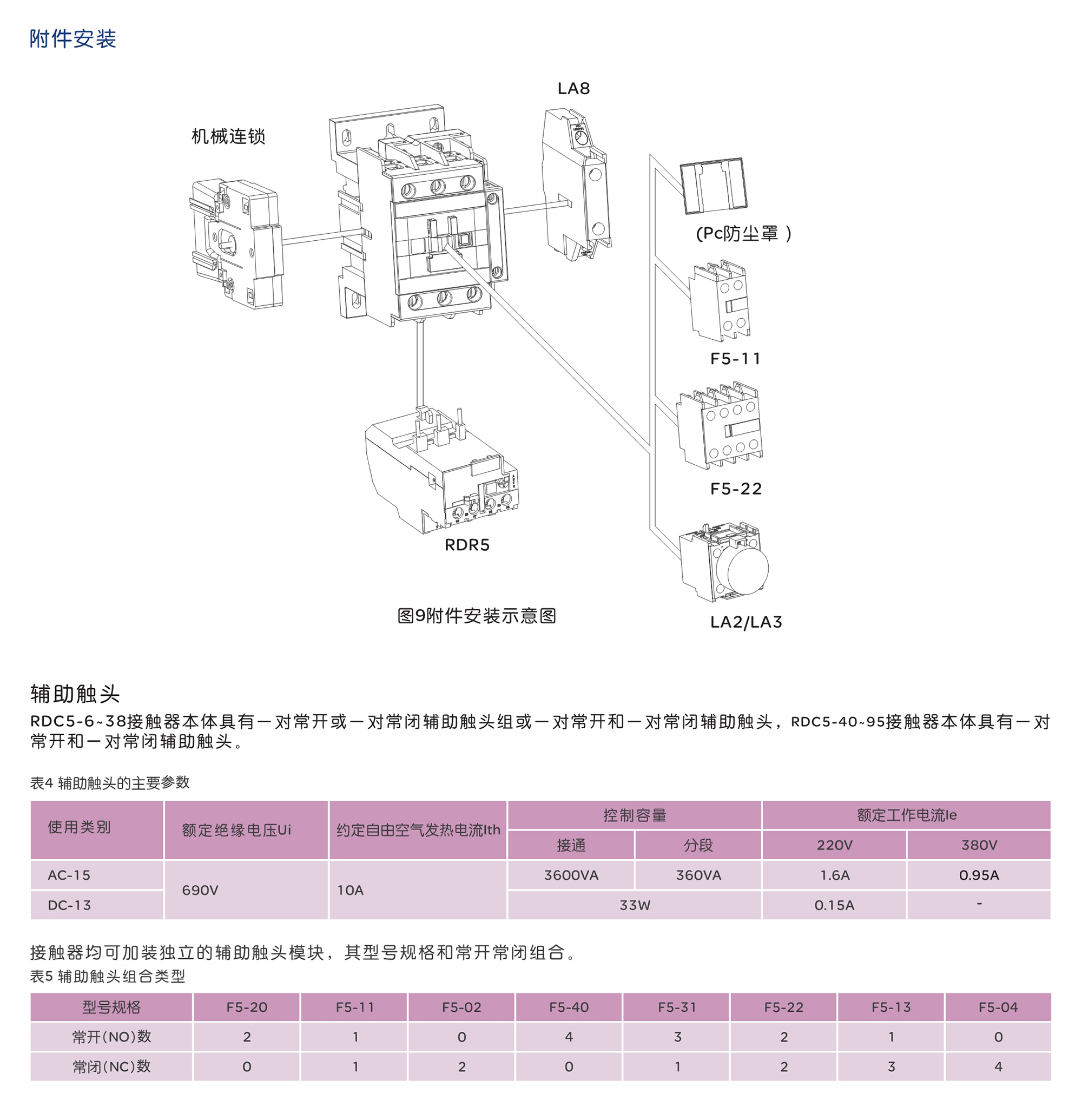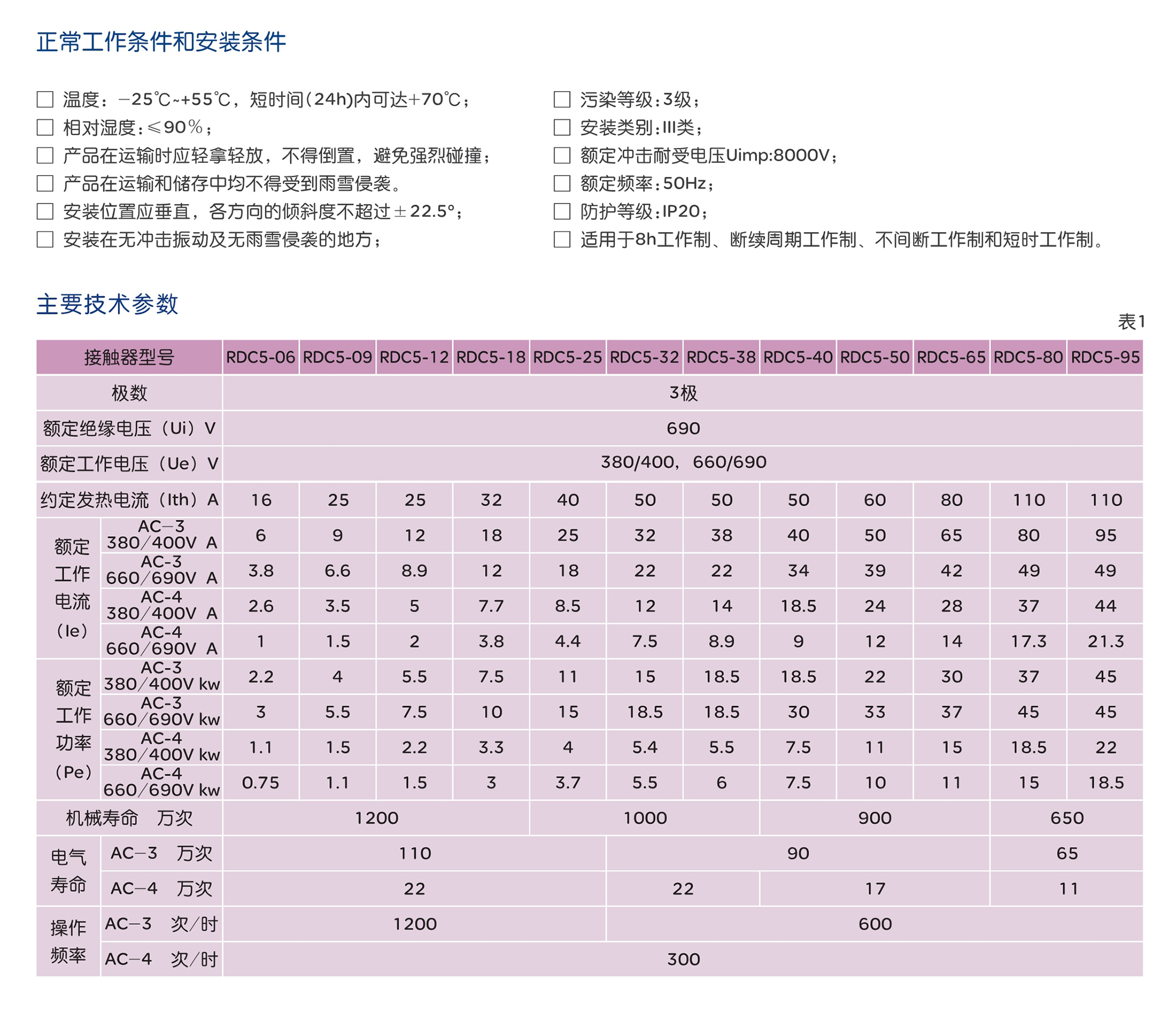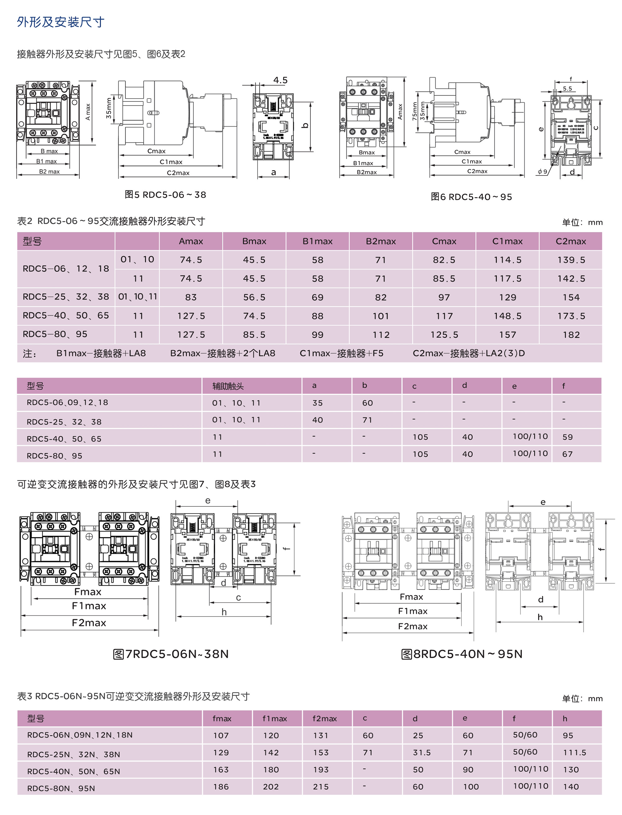 RDC5系列交流接触器主要用于交流50HZ 额定工作电压至690V 额定工作电流至95A的电路 中,供远距离接通与分断电路之用,并可与热继电器直接插接组成电磁起动器,以?;た赡芊⑸? 操作过负荷的电路。接触器还可组装积木式辅助触头组、空气延时头、机械连锁机构等附件, 组成延时接触器、可逆接触器、星三角起动器。 产品符合:GB/T14048.4、IEC 60947-4-1等国家标准。