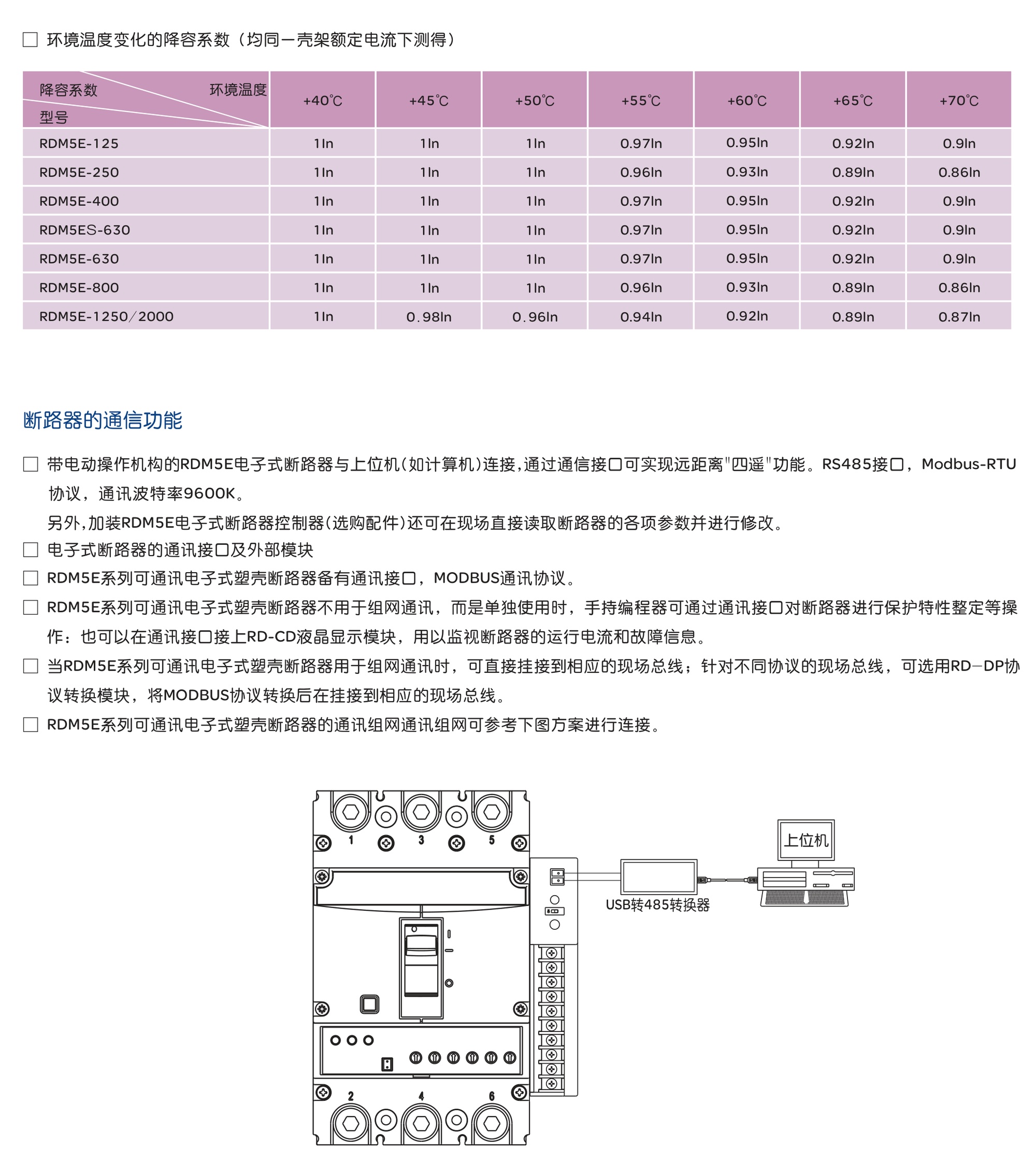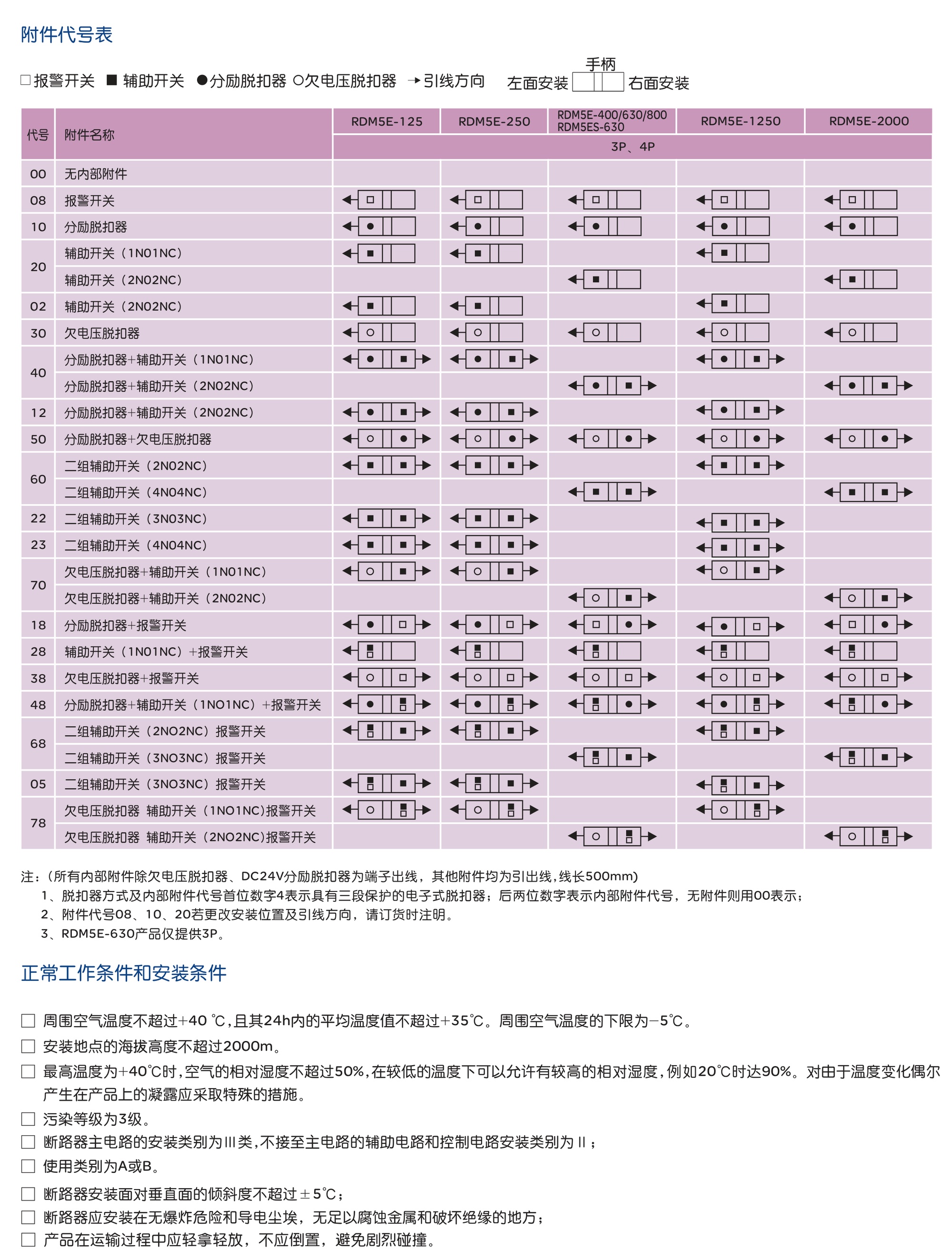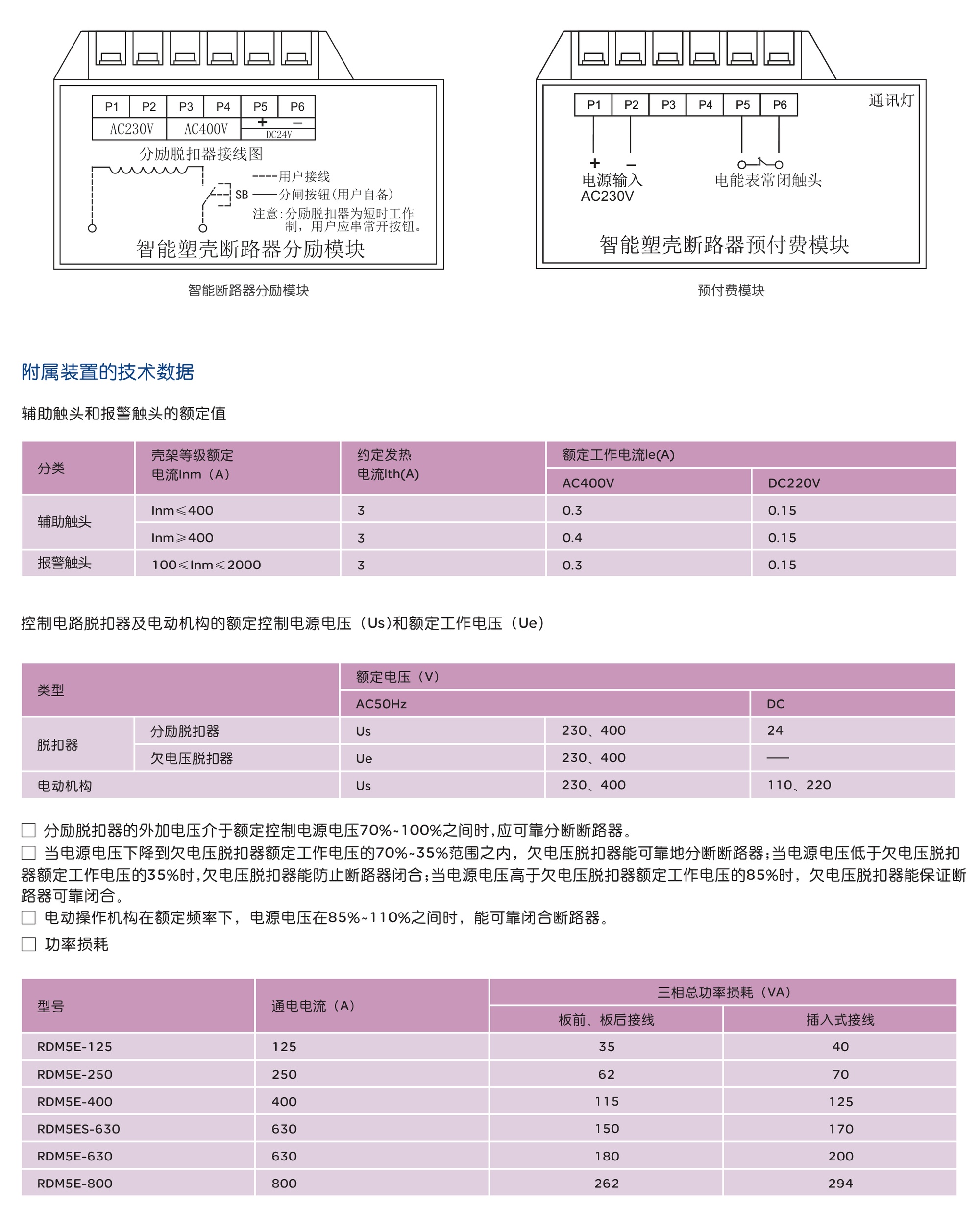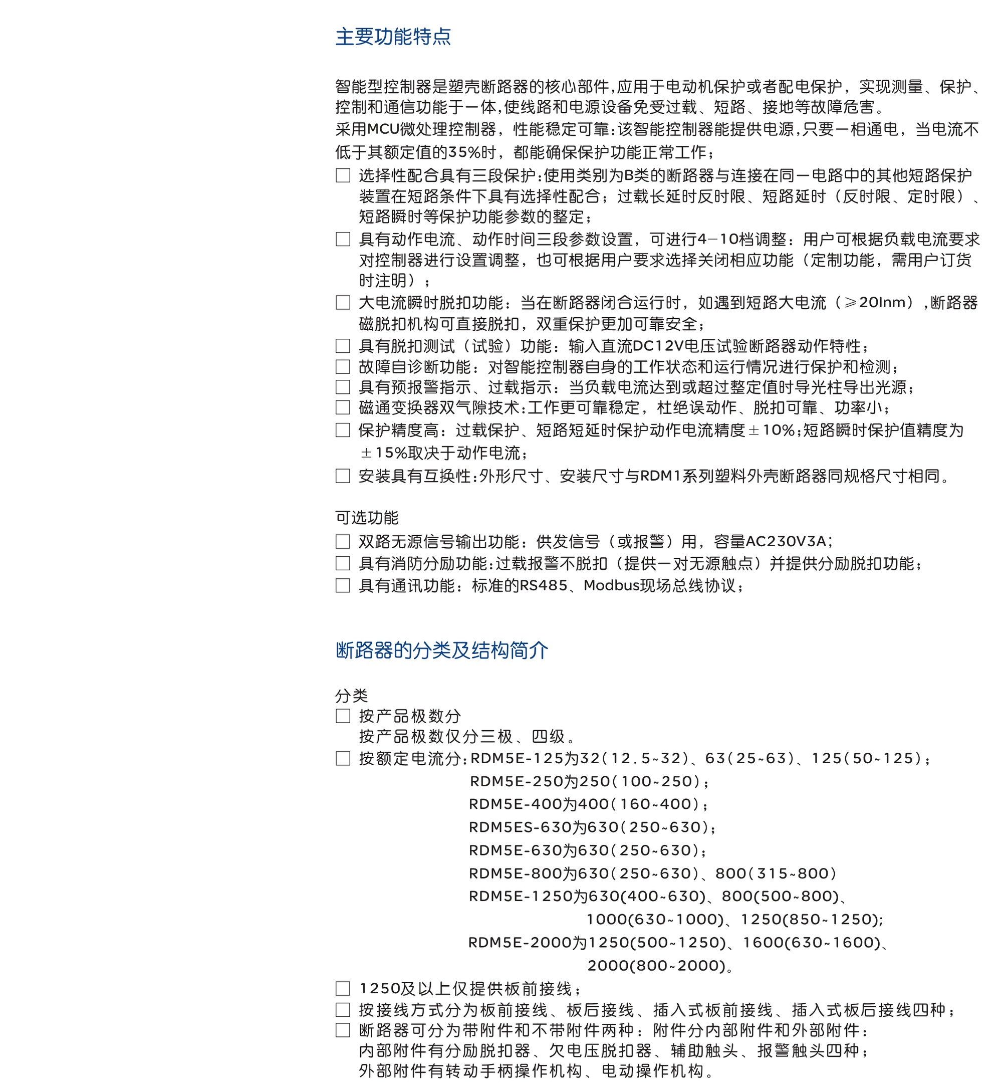 RDM5E系列电子式断路器适用于交流50Hz,额定工作电压至690V,额定电流至2000A以下的配电网络中,用来分配电能和保护线路及电源设备免受过载、短路和欠电压等故障的损坏。亦能作线路不频繁转换及电动机不频繁起动之用。断路器具有过载长延时反时限、短路短延时反时限、短路短延时定时限、短路瞬时和欠电压?;すδ?。该产品具有体积小、分断能力高、飞弧短、附件安装方便、抗震动的特点,是陆地及船舶使用的理想产品。
