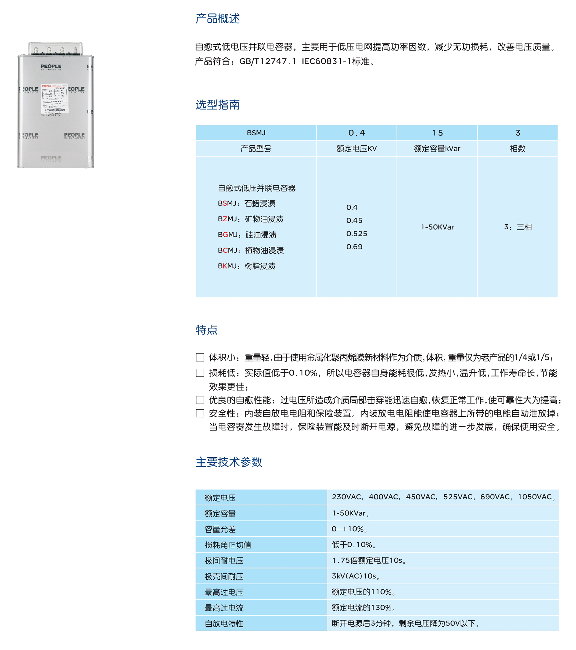 自愈式低电压并联电容器,主要用于低压电网提高功率因数,减少无功损耗,改善电压质量。 产品符合:GB/T12747.1 IEC60831-1标准。