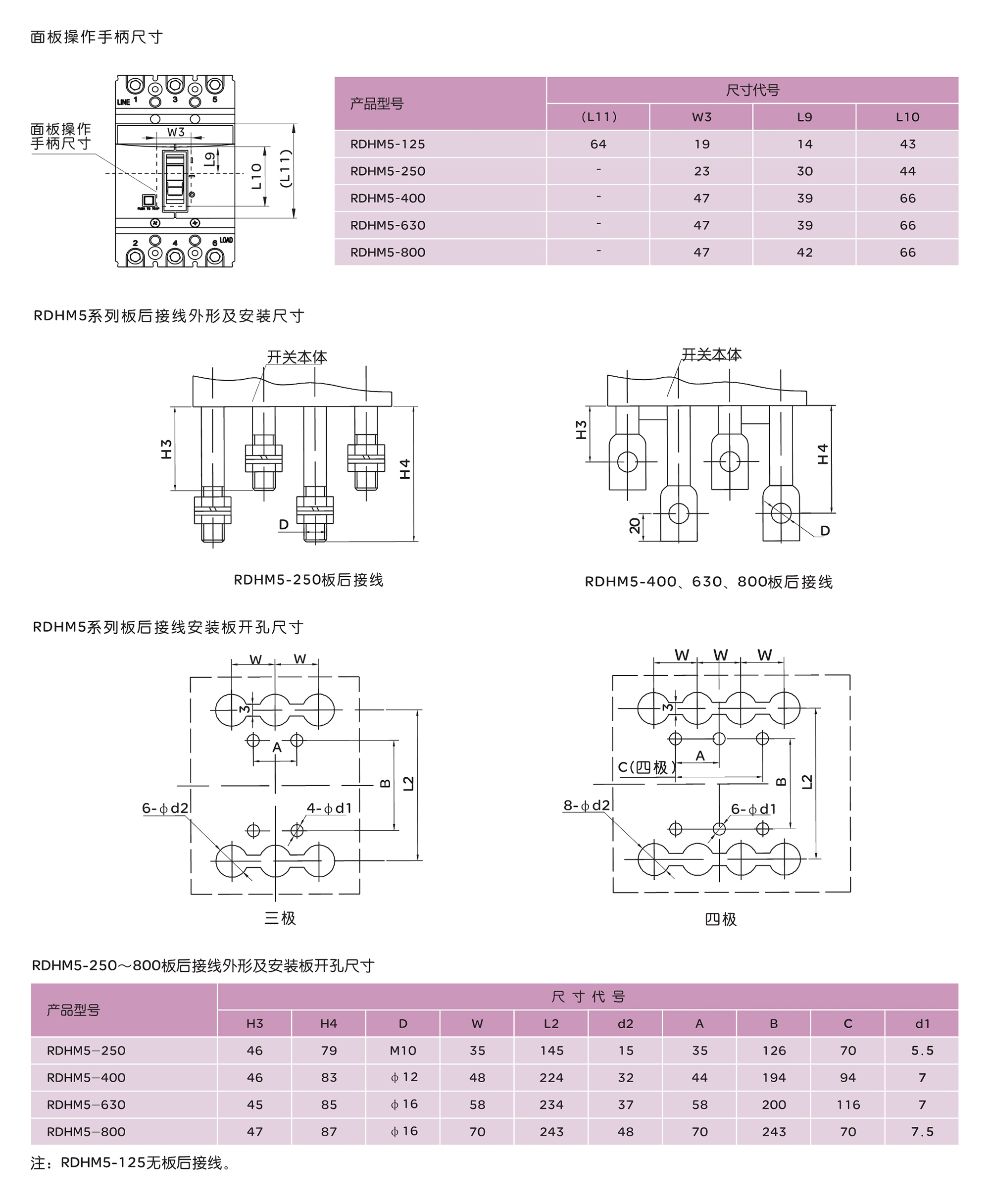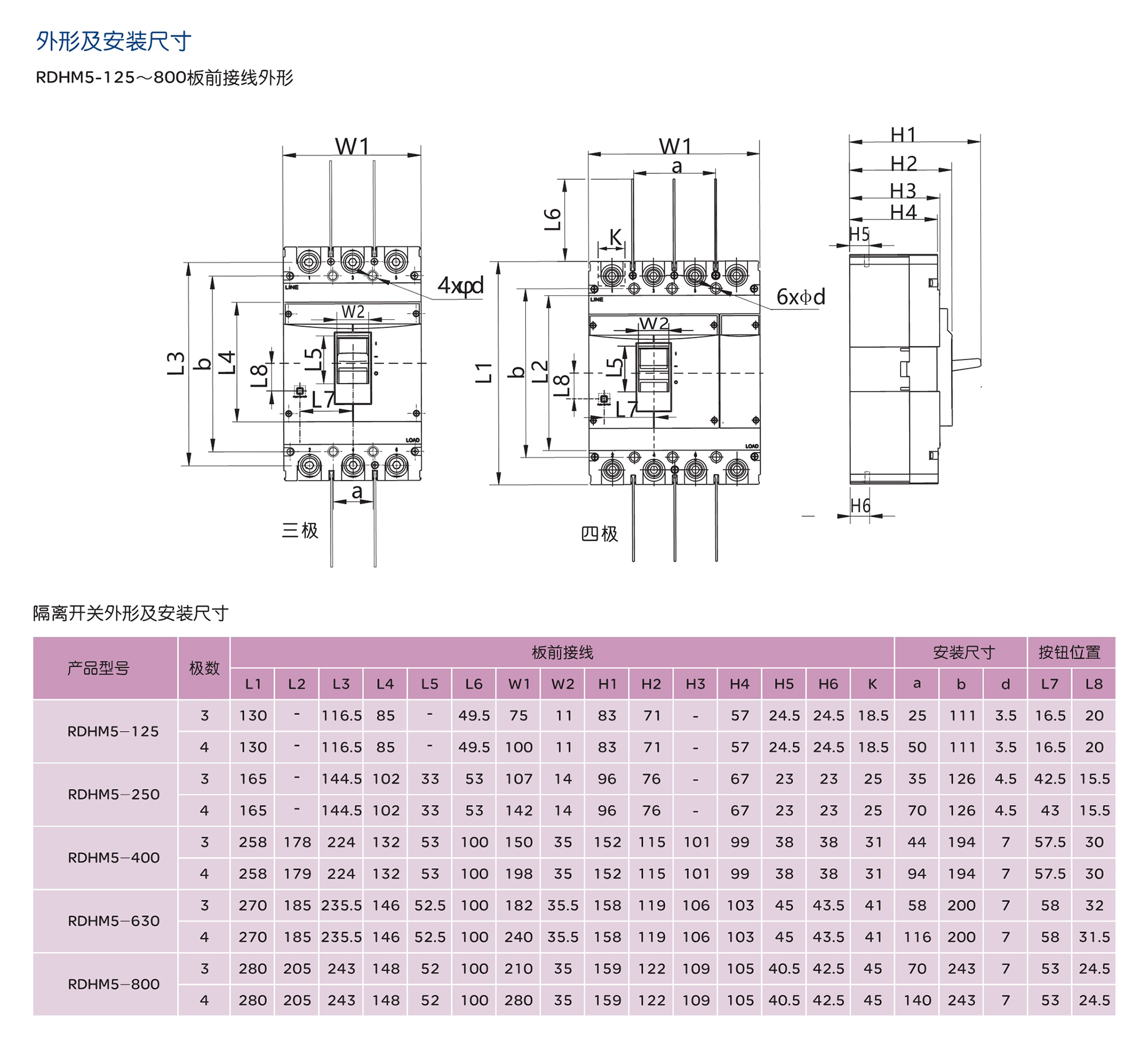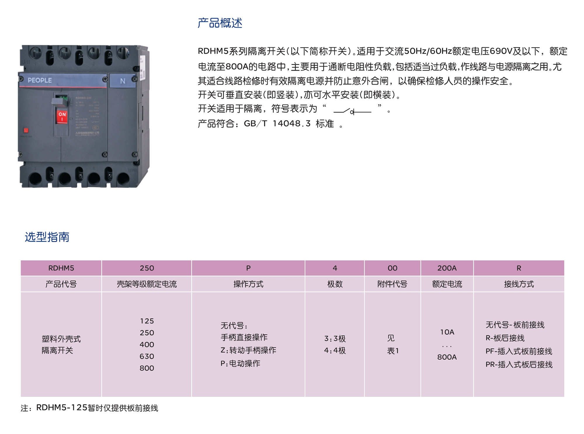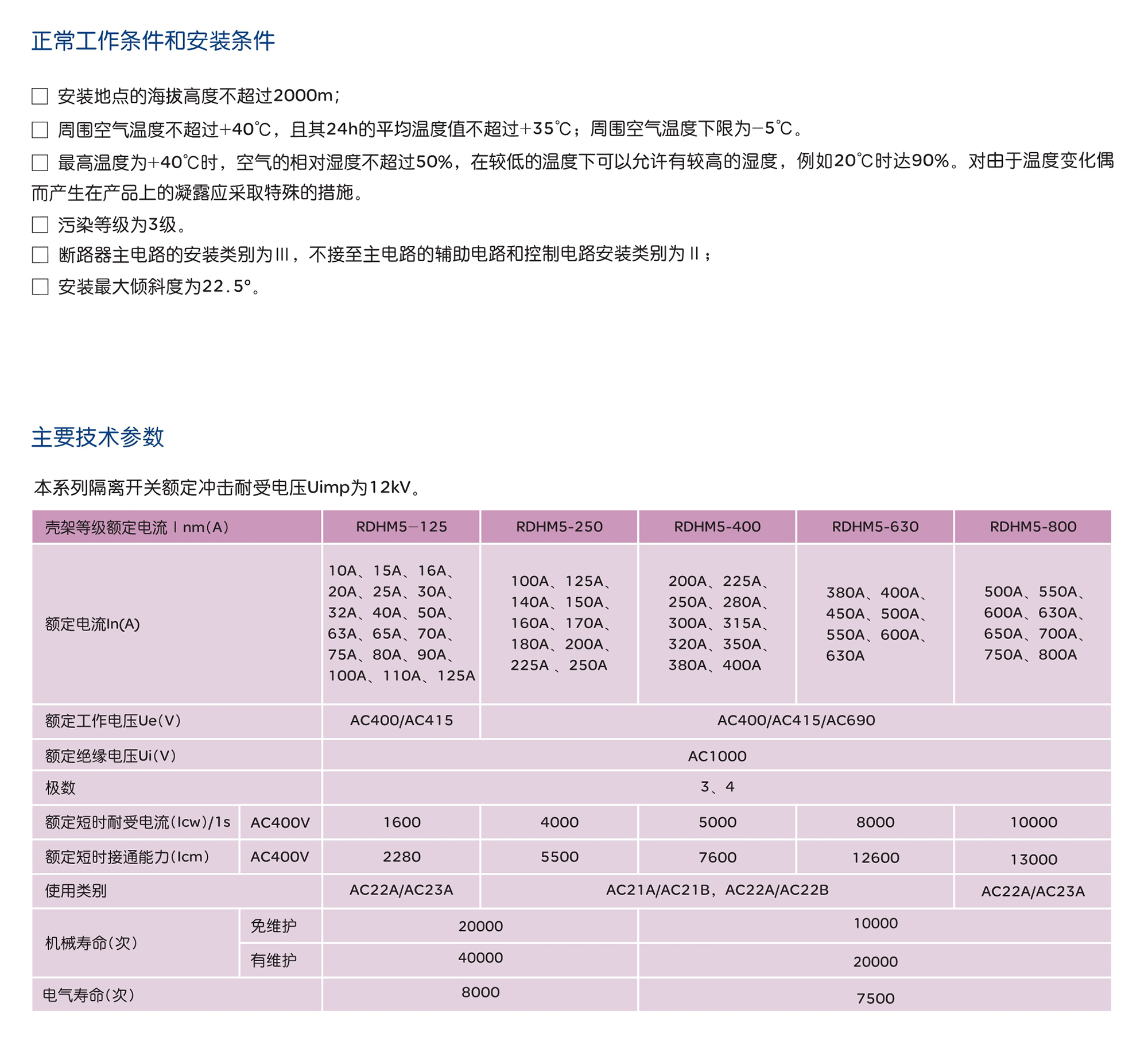 RDHM5系列隔离开关(以下简称开关)。适用于交流50Hz/60Hz额定电压690V及以下,额定电流至800A的电路中,主要用于通断电阻性负载,包括适当过负载,作线路与电源隔离之用。尤其适合线路检修时有效隔离电源并防止意外合闸,以确保检修人员的操作安全。