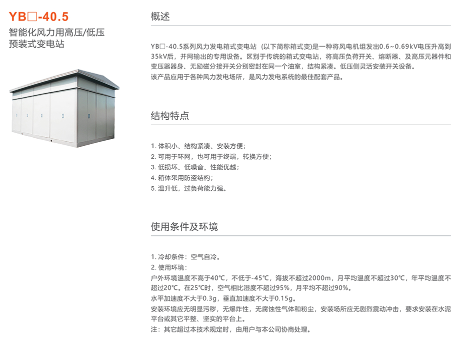 YB□-40.5系列风力发电箱式变电站(以下简称箱式变)是一种将风电机组发出0.6~0.69kV电压升高到35kV后,并网输出的专用设备。区别于传统的箱式变电站,将高压负荷开关、熔断器、及高压元器件和变压器器身、无励磁分接开关分别密封在同一个油室,结构紧凑。低压侧灵活安装开关设备该产品应用于各种风力发电场所,是风力发电系统的最佳配套产品。