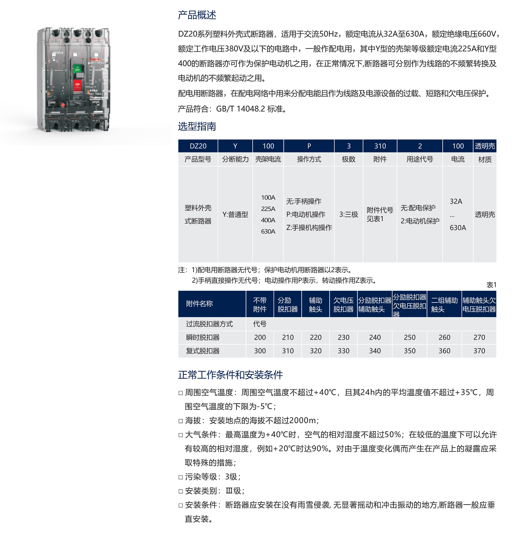 DZ20系列塑料外壳式断路器,适用于交流50Hz,额定电流从32A至630A,额定绝缘电压660V额定工作电压380V及以下的电路中,一般作配电用,其中Y型的壳架等级额定电流225A和Y型400的断路器亦可作为?;さ缍?在正常情况下,断路器可分别作为线路的不频繁转换及电动机的不频繁起动之用。