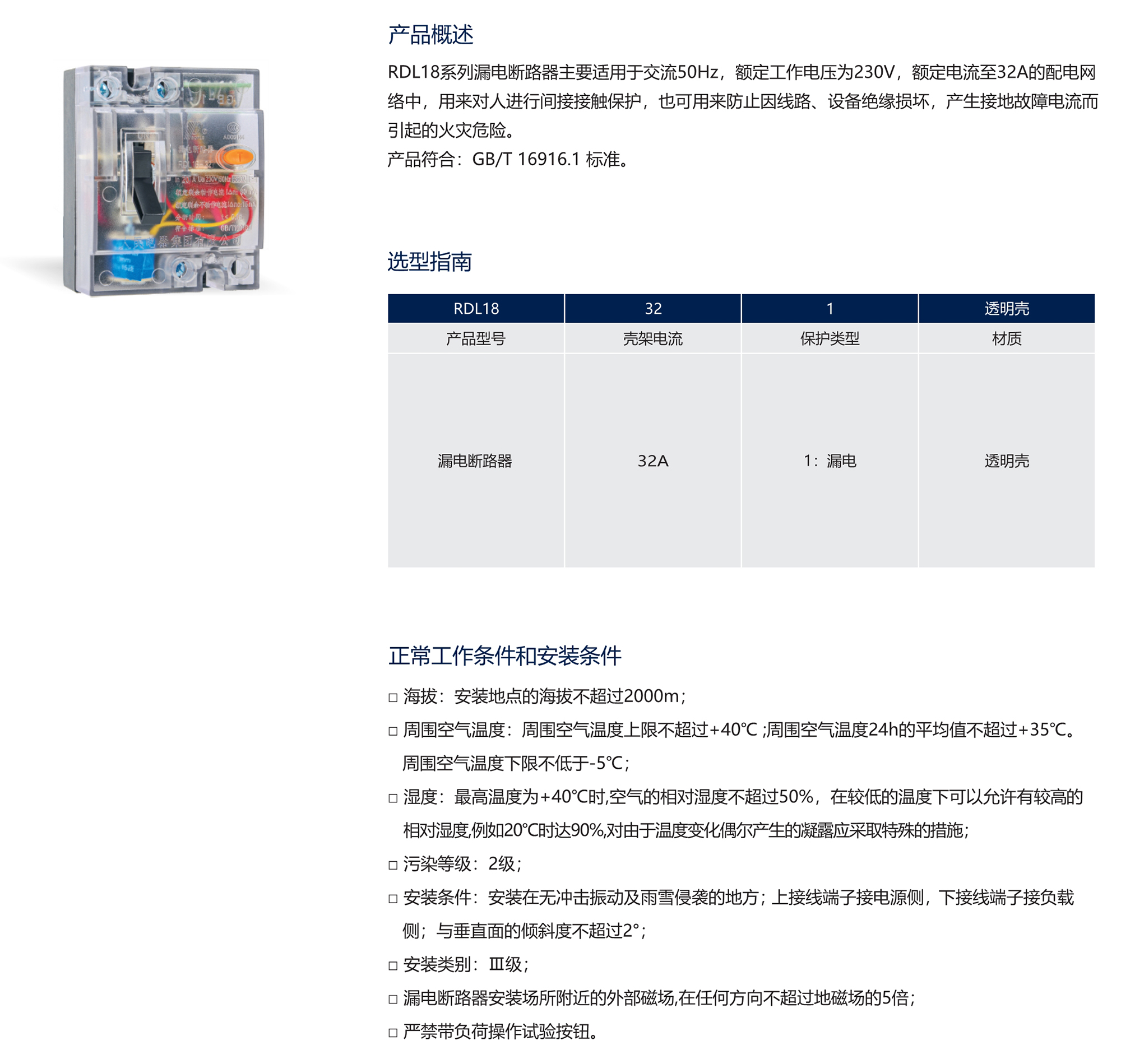 RDL18系列漏电断路器主要适用于交流50Hz,额定工作电压为230V,额定电流至32A的配电网络中,用来对人进行间接接触?;ぃ部捎美捶乐挂蛳呗?、设备绝缘损坏,产生接地故障电流而引起的火灾危险。 产品符合:GB/T 16916.1 标准。