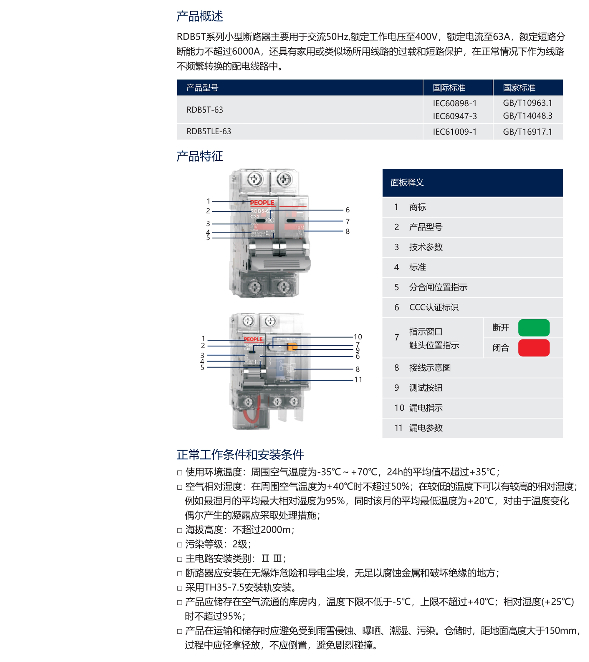 RDB5TLE系列剩余电流动作断路器(下称漏电断路器)适用于交流50Hz、额定电压230/400V,额定电流至60A的线路中,作为负载线路的漏电(触电)、过载和短路?;?。也可作为不频繁接通、分断和转换之用。该系列产品具有分断能力高、附件适用性强、体积小、重量轻、外形美观和使用方便等优点。 产品符合:GB/T 16917.1 标准。