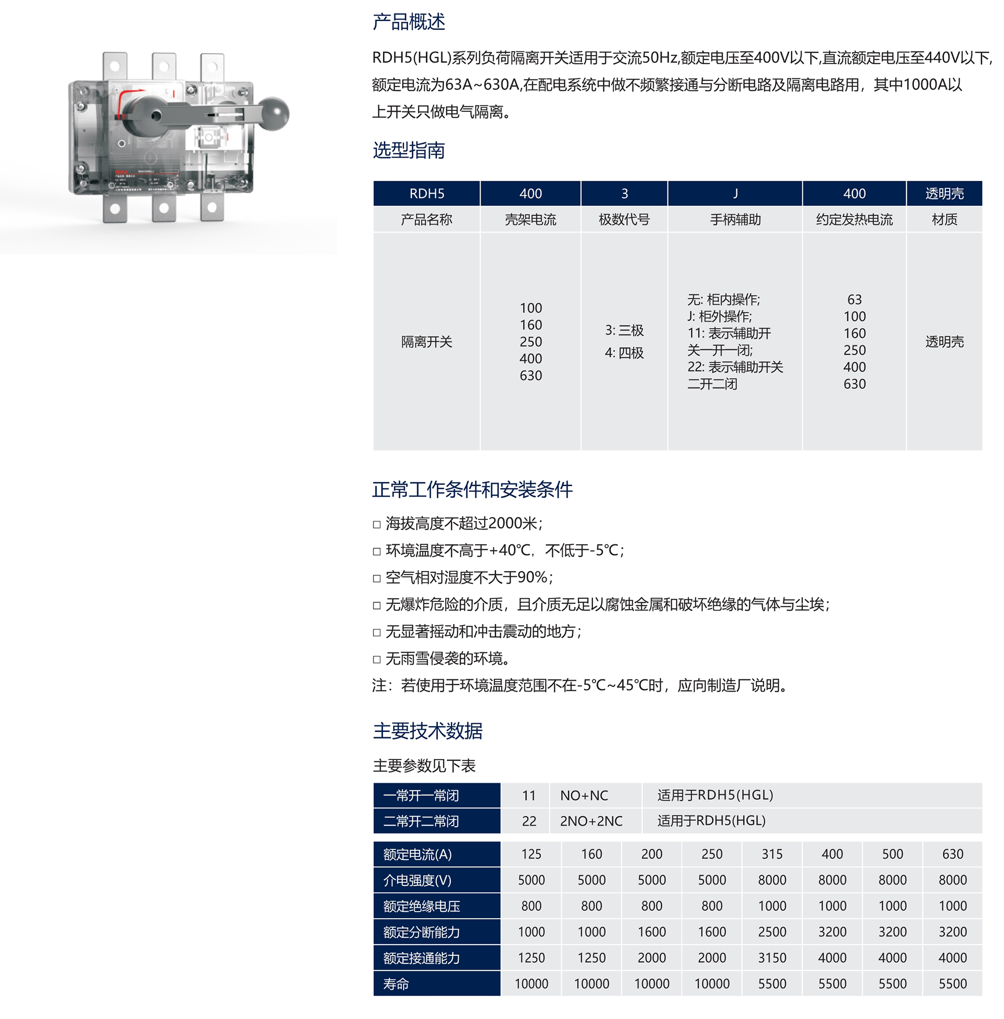 RDH5(HGL)系列负荷隔离开关适用于交流50Hz,额定电压至400V以下,直流额定电压至440V以下,额定电流为63A~630A,在配电系统中做不频繁接通与分断电路及隔离电路用,其中1000A以上开关只做电气隔离。