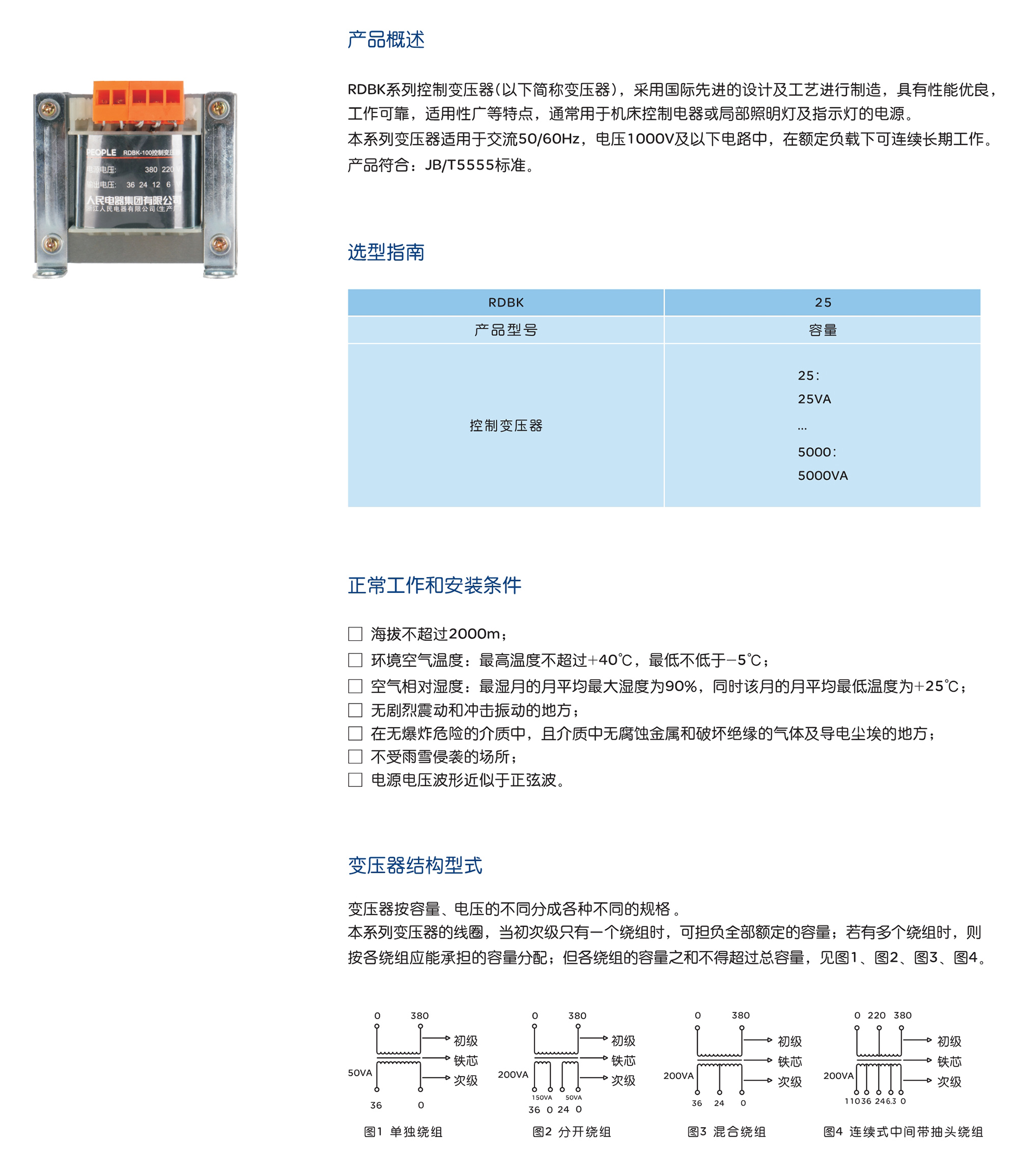 RDBK系列控制变压器(以下简称变压器),采用国际先进的设计及工艺进行制造,具有性能优良, 工作可靠,适用性广等特点,通常用于机床控制电器或局部照明灯及指示灯的电源。 本系列变压器适用于交流50/60Hz,电压1000V及以下电路中,在额定负载下可连续长期工作。 产品符合:JB/T5555标准。