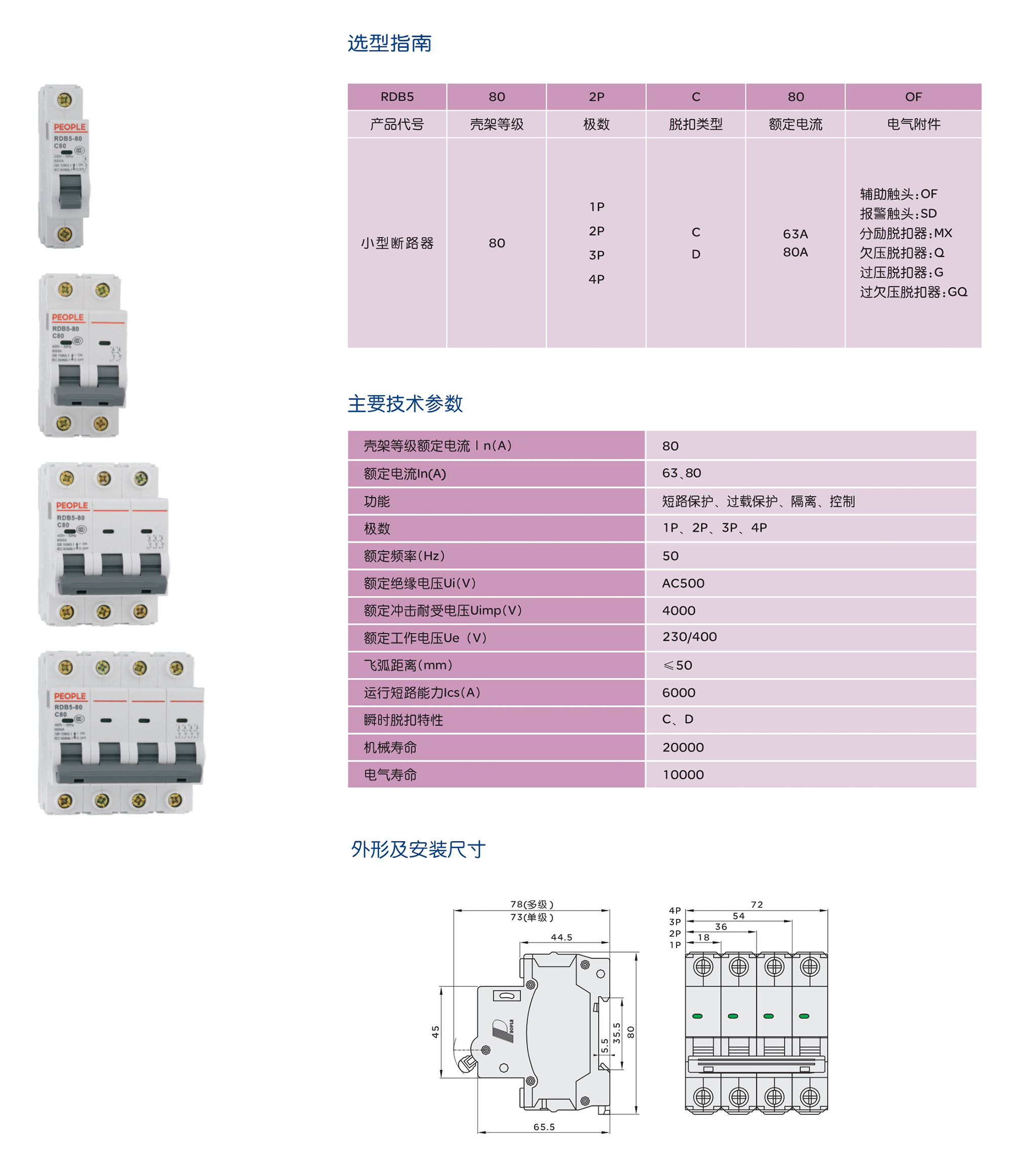RDB5-80小型断路器(以下简称断路器),主要用于交流50Hz(或60Hz),额定工作电压至400V,额定电流至80A额定短路分断能力不超过6000A的保护配电线路中,作为线路不频繁接通、分断和转换之用,具有过载、短路保护功能。 产品符合: GB/T 10963.1 标准。