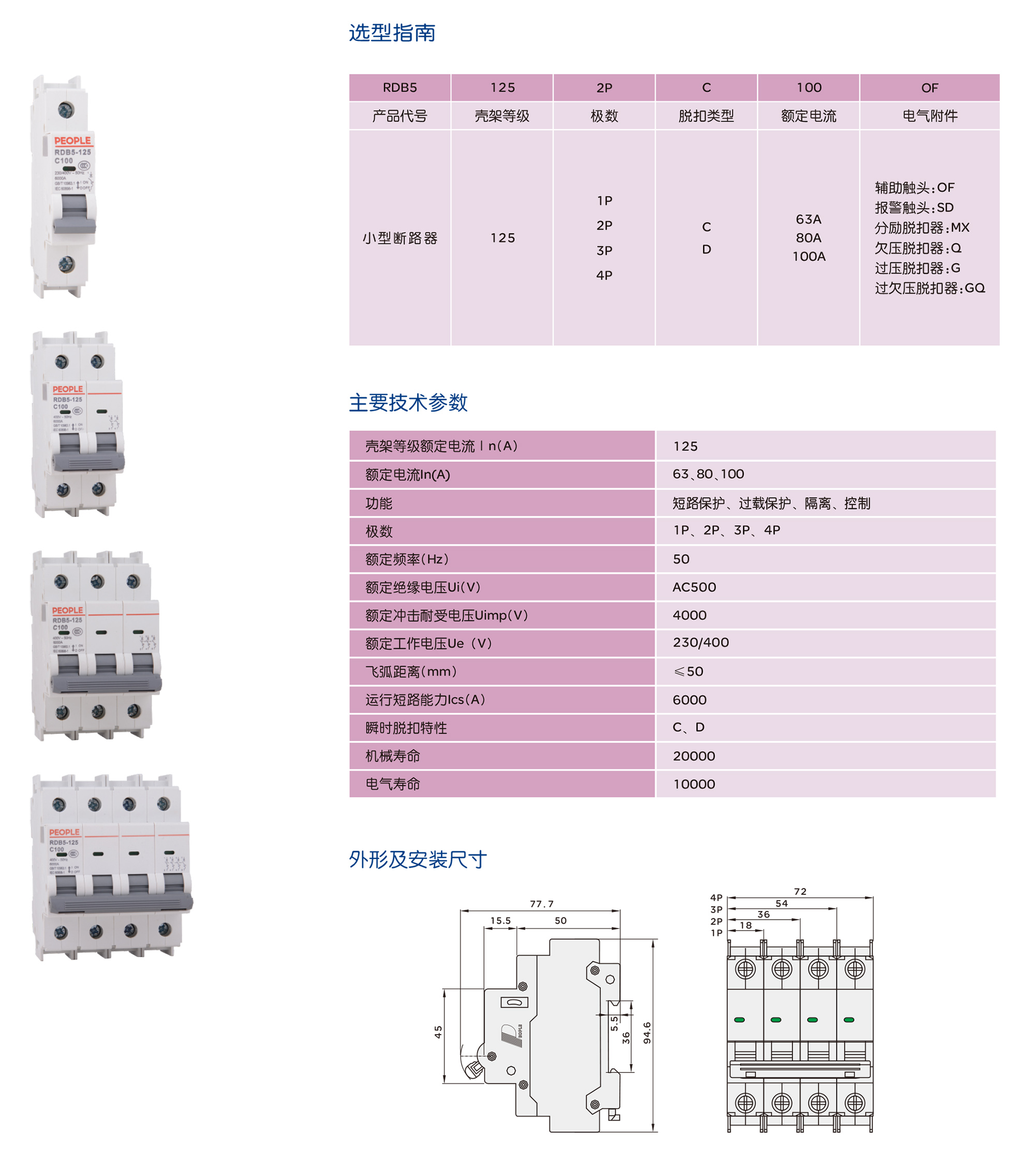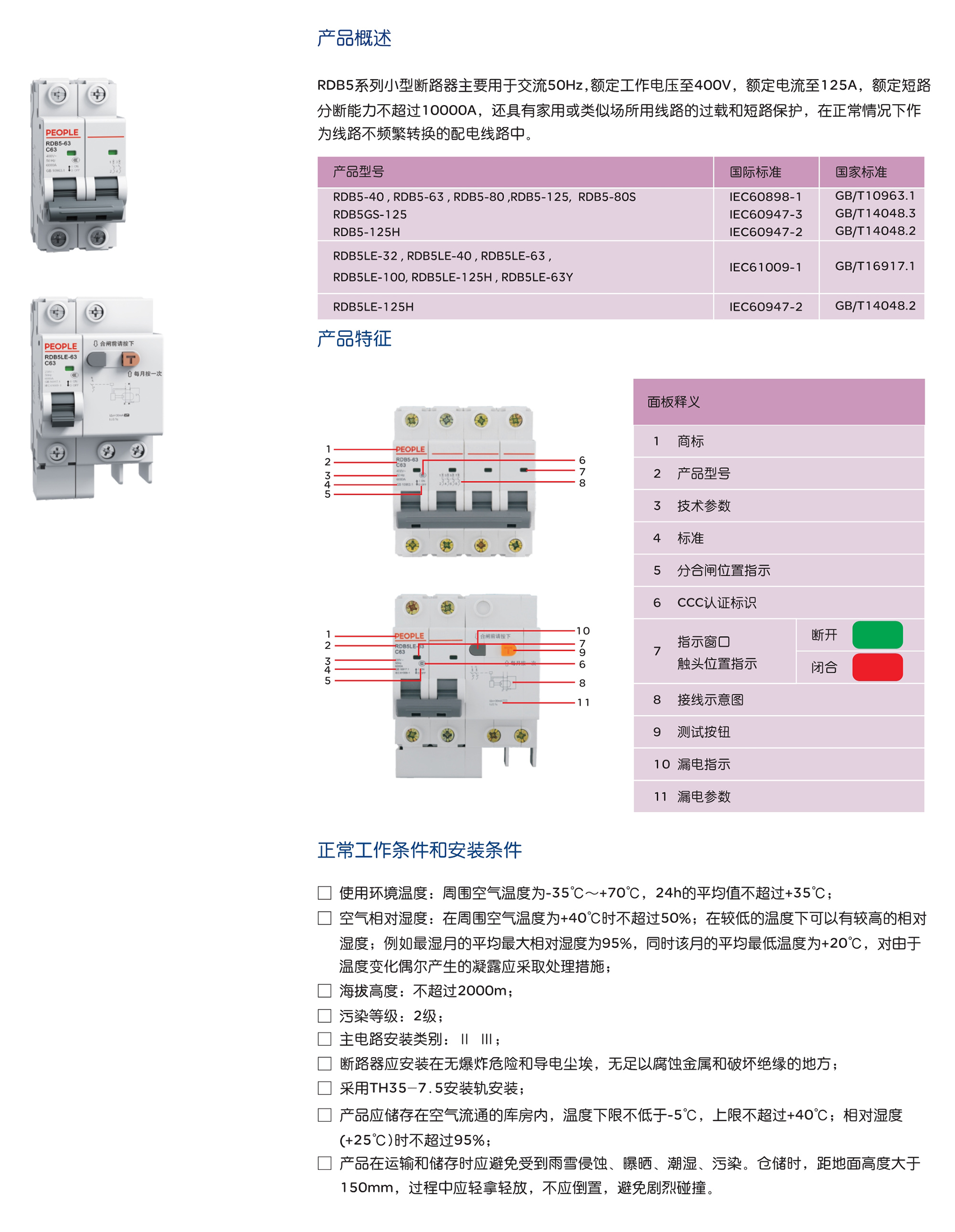 RDB5-125小型断路器(以下简称断路器),主要用于交流50Hz(或60Hz),额定工作电压至400V,额定电流至100A,额定短路分断能力不超过6000A的?;づ涞缦呗分?,作为线路不频繁接通、分断和转换之用,具有过载、短路保护功能。 产品符合:GB/T 10963.1 标准。
