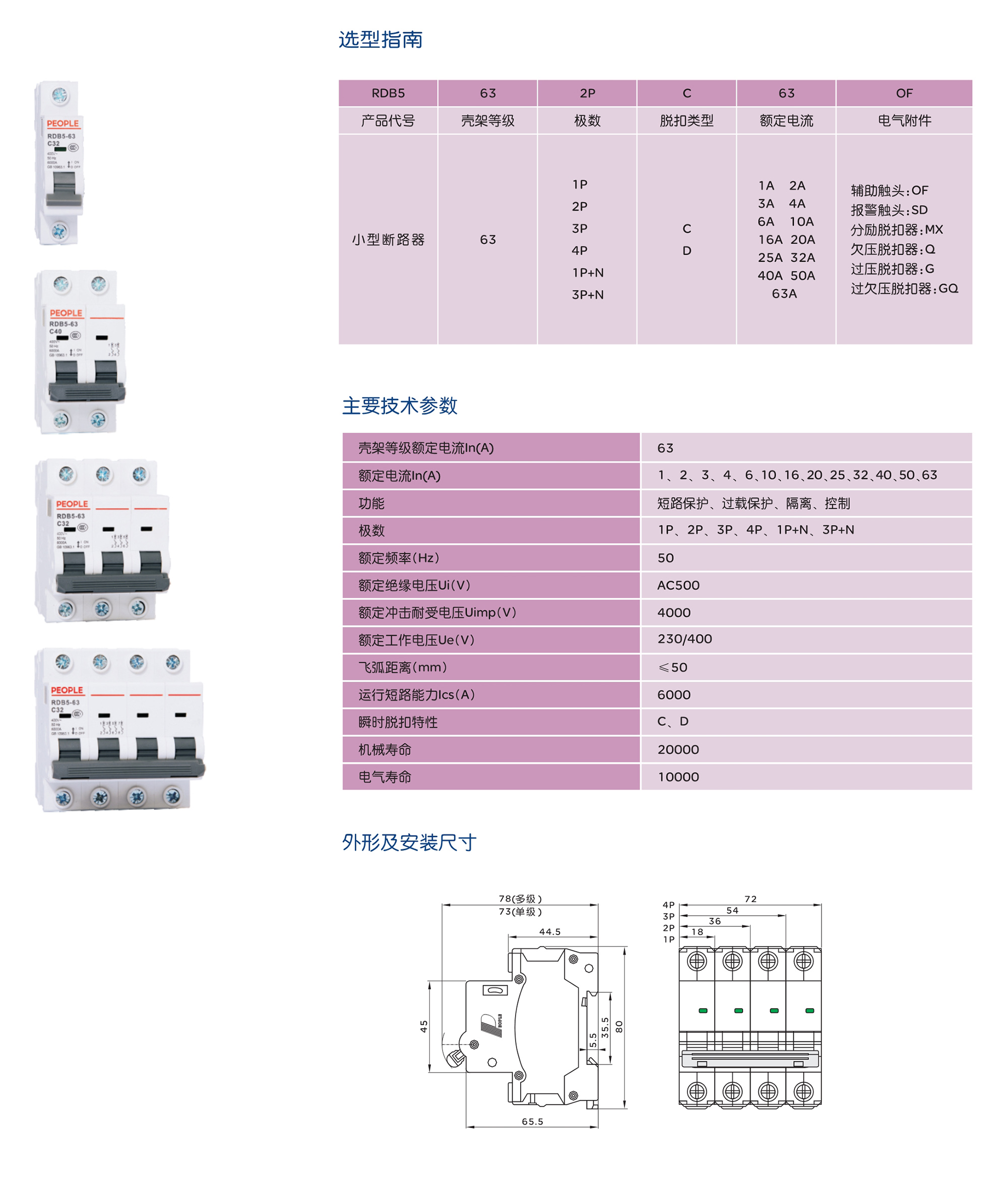 RDB5-63小型断路器(以下简称断路器),主要用于交流50Hz(或60Hz),额定工作电压至400V,额定电流至63A额定短路分断能力不超过6000A的?;づ涞缦呗分?,作为线路不频繁接通、分断和转换之用,具有过载、短路、隔离、控制?;すδ?。 产品符合:GB/T 10963.1标准。