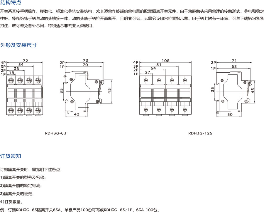 RDH3G系列隔离开关主要适用于交流50/60Hz、额定电压230V/400V、额定电流至125A的电路中,用于通断电阻性负载,包括适当过负载,作线路与电源隔离之用。尤其适合线路检修时有效隔离电源并防止意外合闸,以确保检修人员的操作安全。 产品符合:GB14048.3、IEC60947-3国家标准。