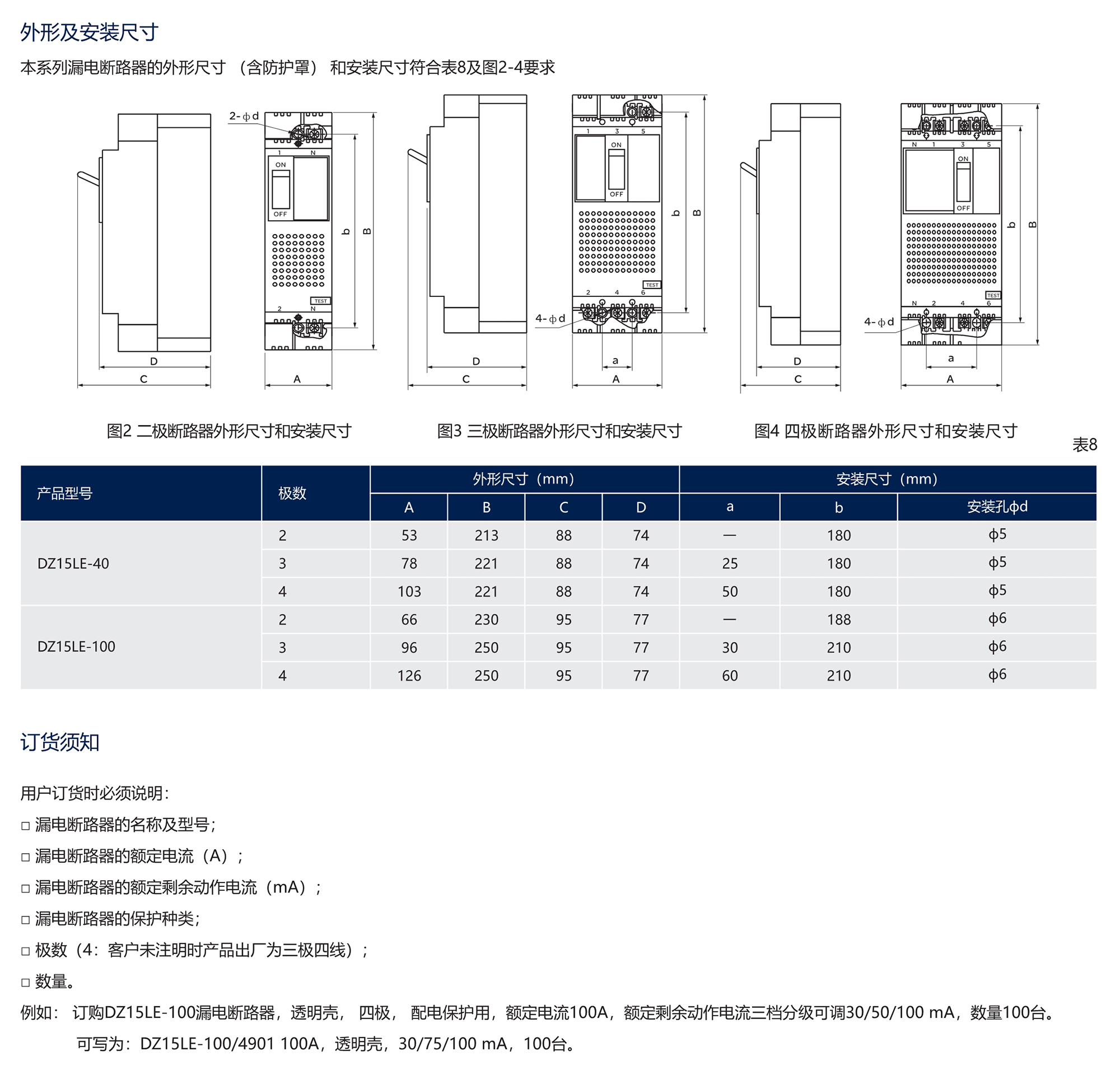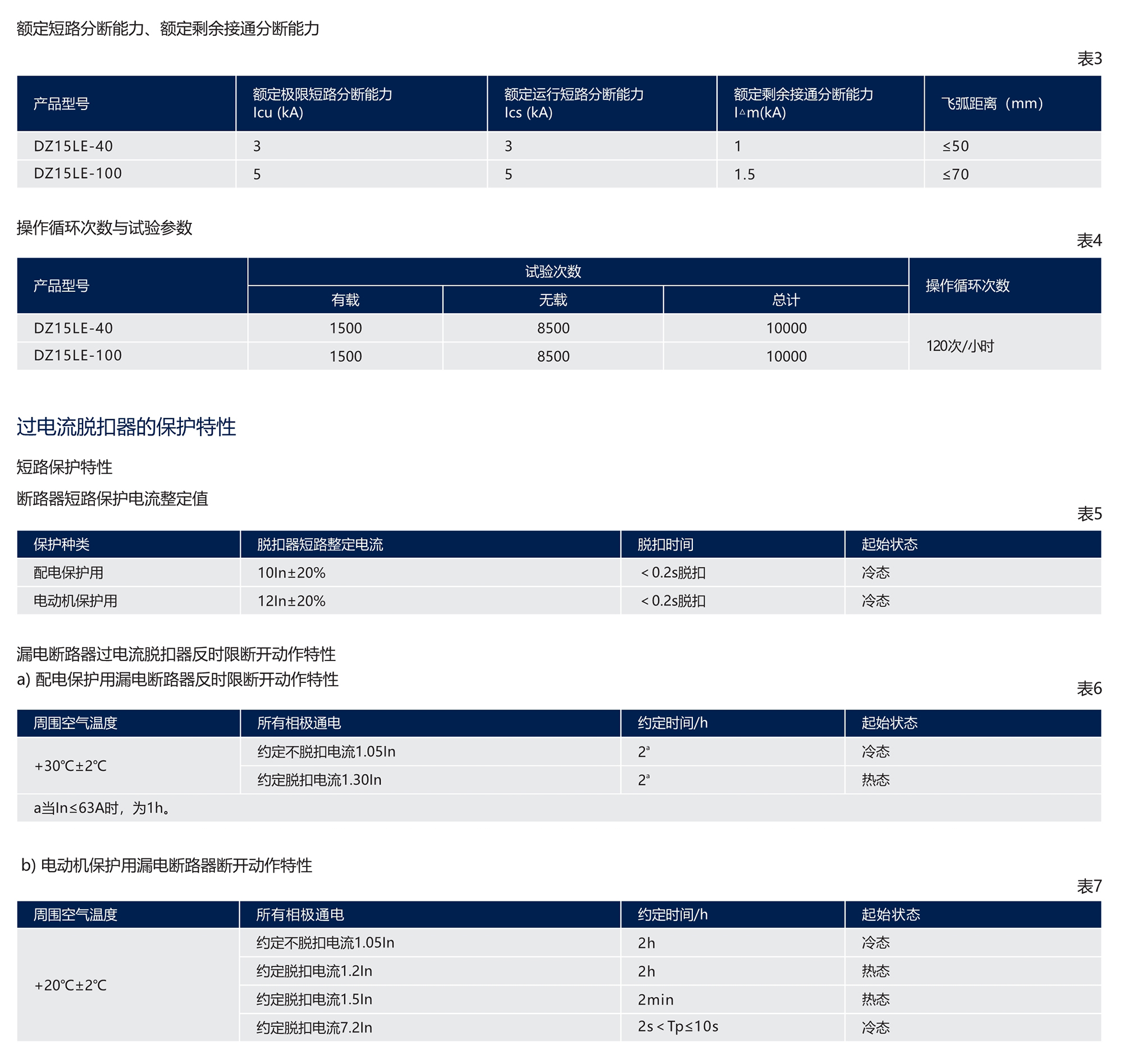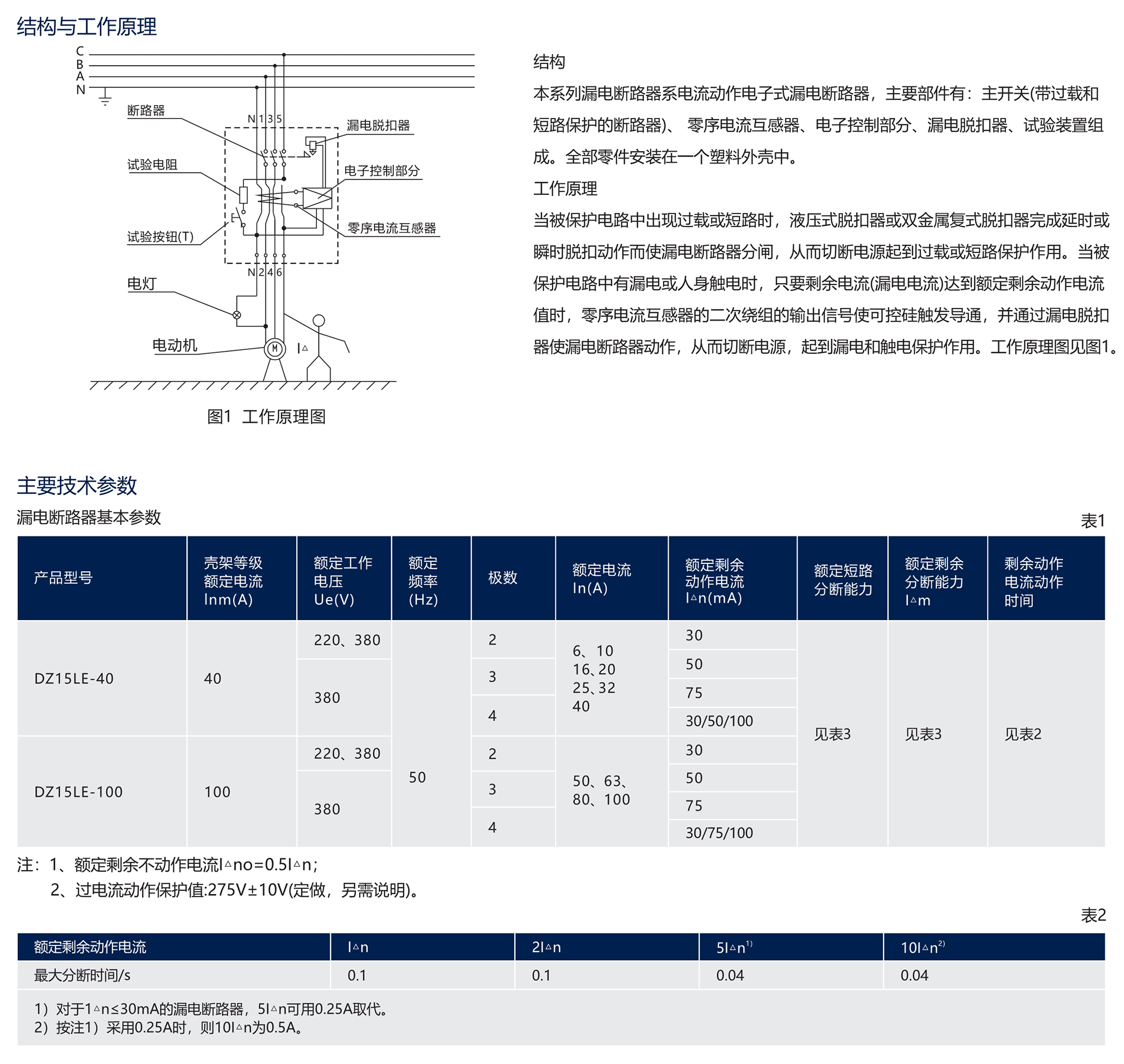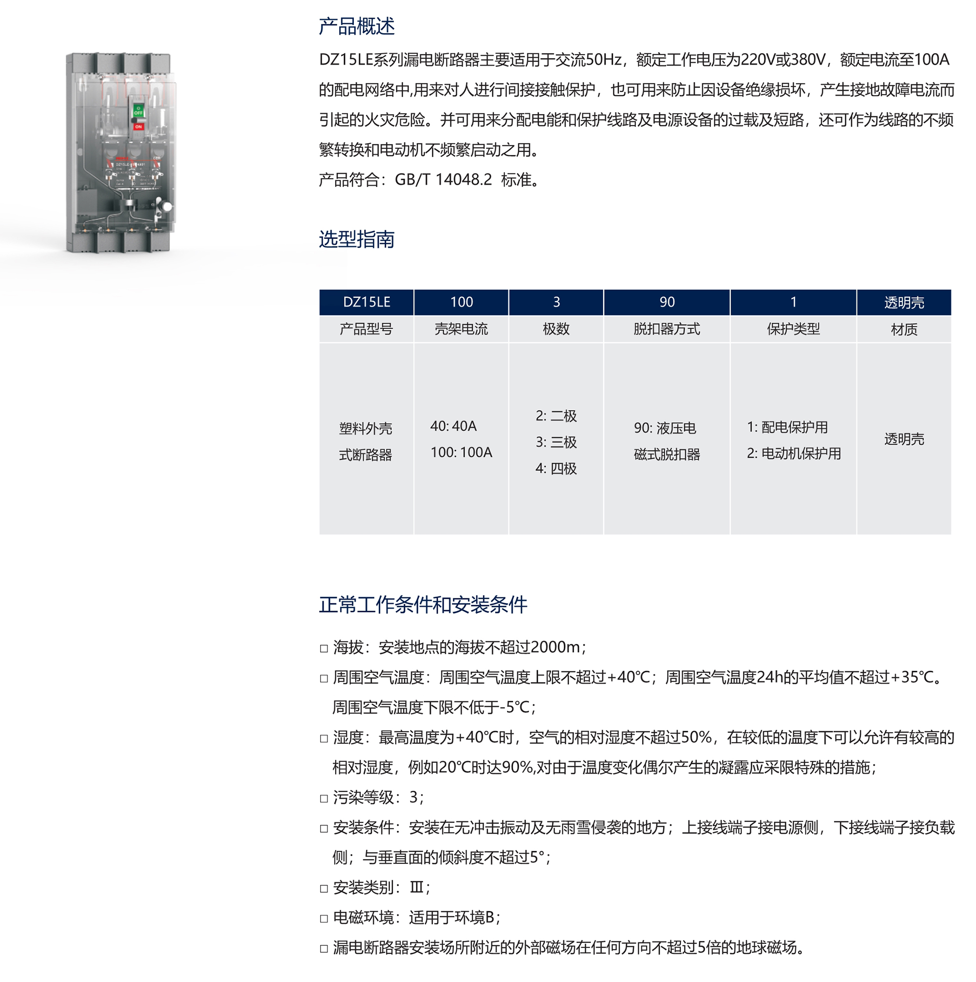 DZ15LE系列漏电断路器主要适用于交流50Hz,额定工作电压为220V或380V,额定电流至100A 的配电网络中,用来对人进行间接接触?;ぃ部捎美捶乐挂蛏璞妇邓鸹?,产生接地故障电流而 引起的火灾危险。并可用来分配电能和保护线路及电源设备的过载及短路,还可作为线路的不频 繁转换和电动机不频繁启动之用。 产品符合:GB/T 14048.2 标准。